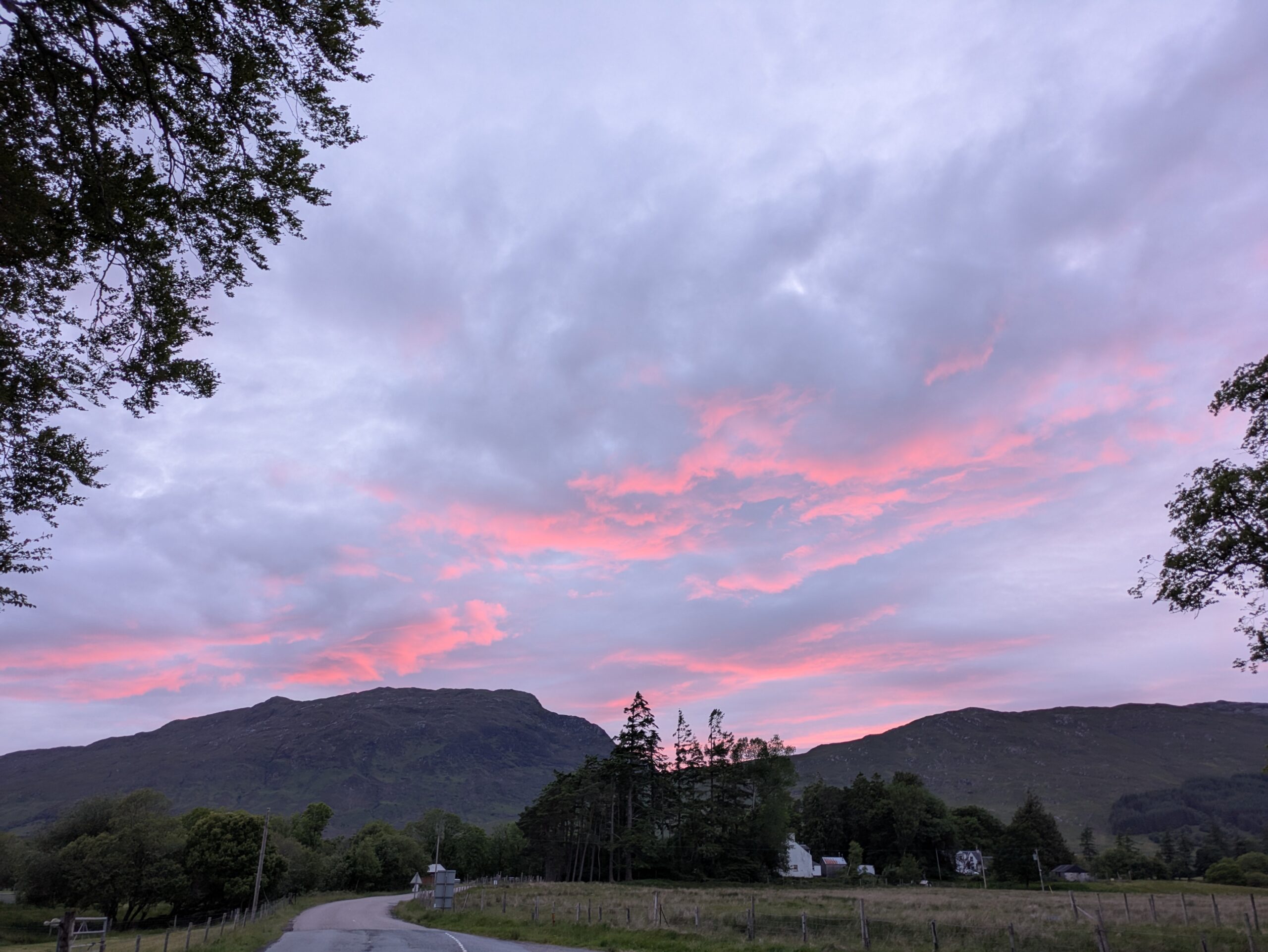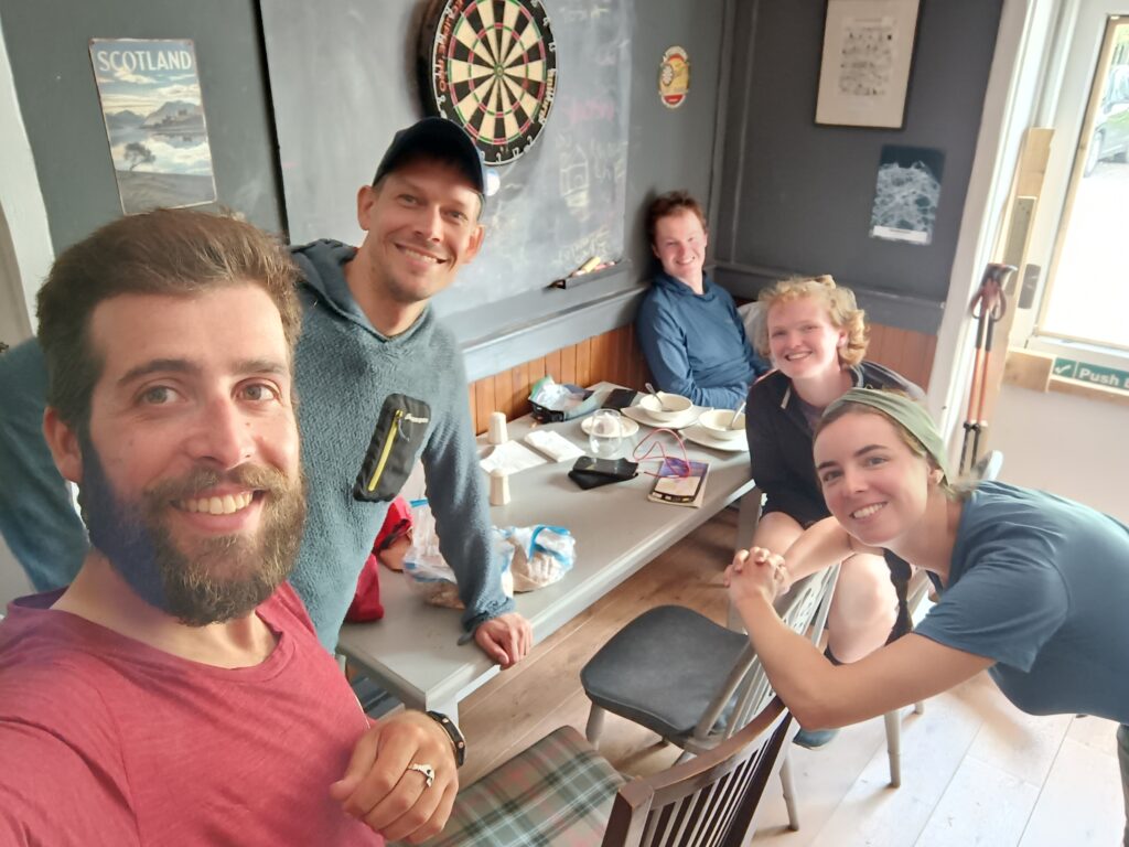 Peu après midi, on retrouve Al’, Flora et Rob au “Bothy Bar” du Strathcarron Hotel pour boire et manger. Au menu: Thistly Cross Cider (yum), Cullen Skink, Scampi & chips, et même un apple crumble (noyé dans un peu trop de crème anglaise). On étudie les prévisions météo et on hésite pour la suite: continuer cet après-midi avec Al’ et Flora jusqu’à un bothy à 8 km d’ici, ou camper devant le Strathcarron Hotel et se reposer.