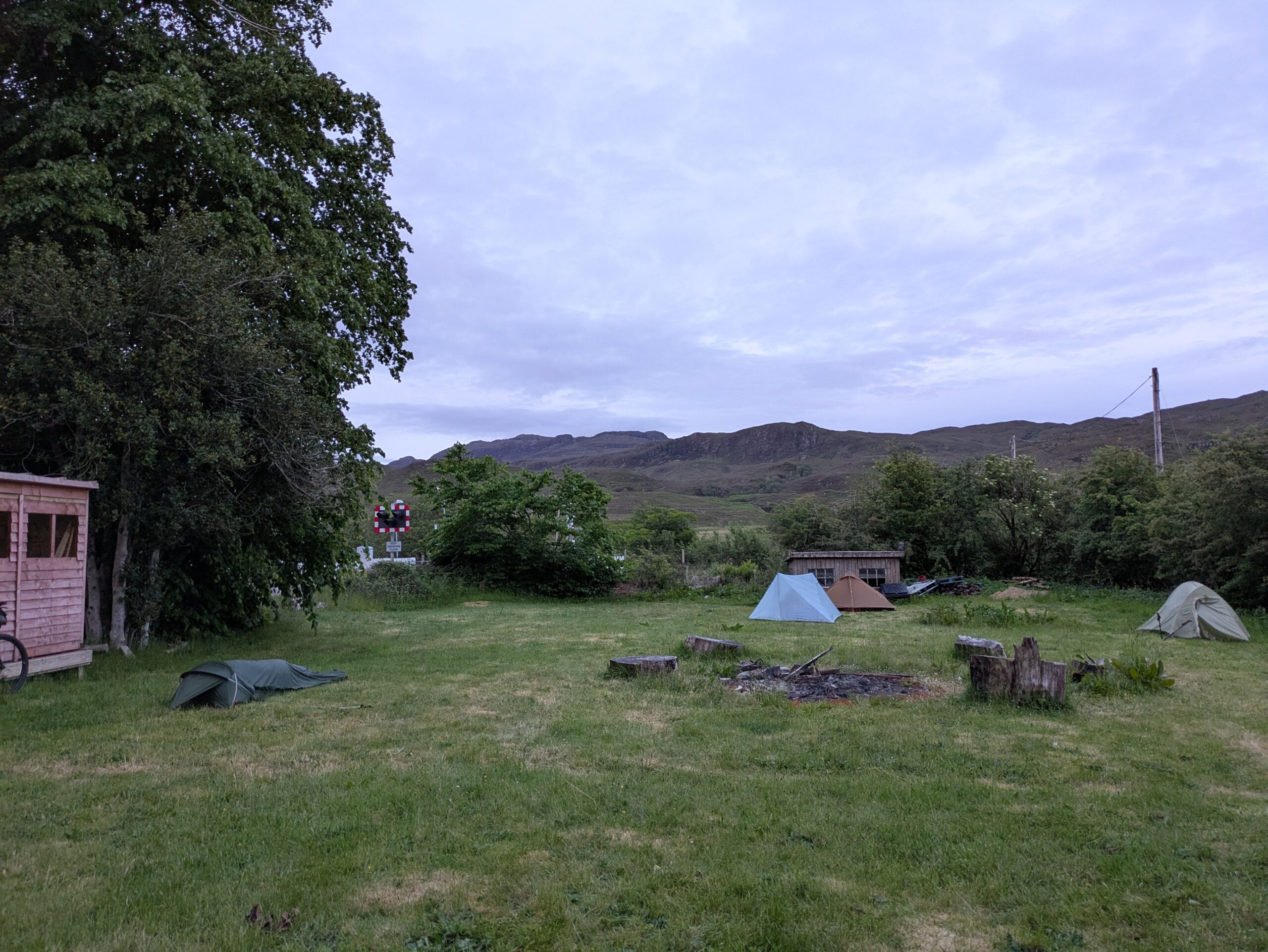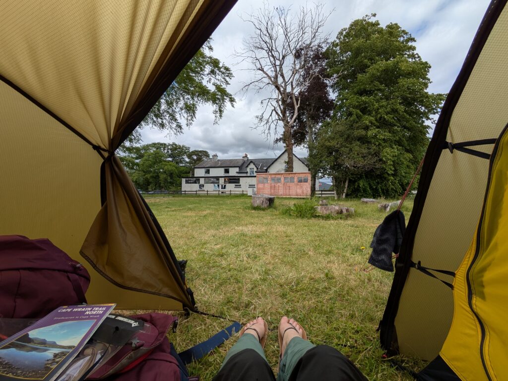 On choisit finalement la deuxième option, car on sent qu’on a besoin de se reposer et José sent un de ses genoux qui tire un peu. Rob reste ici lui aussi car il prend le train le lendemain pour rentrer chez lui. On plante donc les tentes dans le pré d’en face (qui grouille de tiques!) pour 5£, avant de prendre une douche à l’hôtel moyennant 5£ supplémentaires.