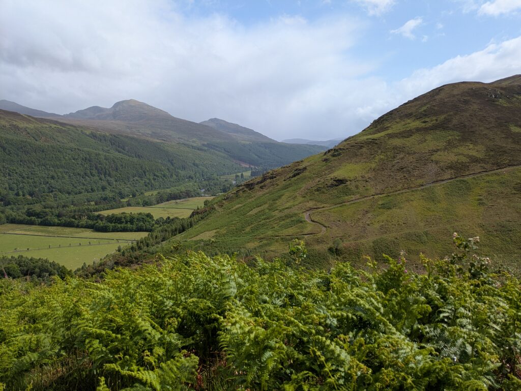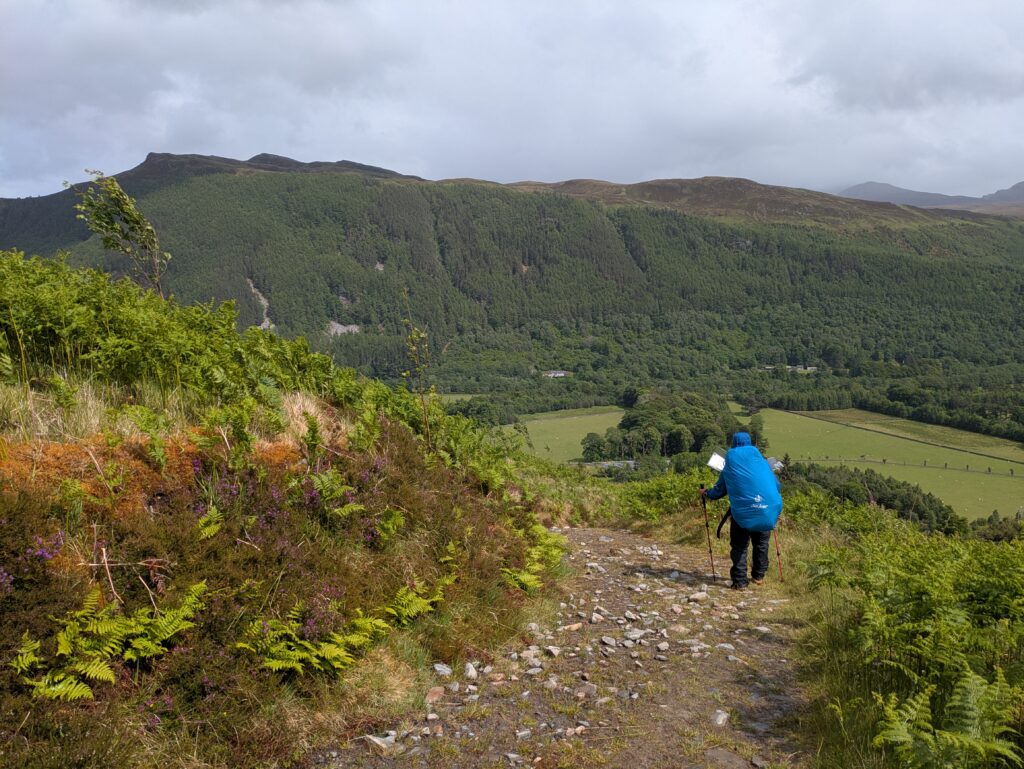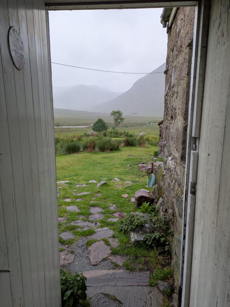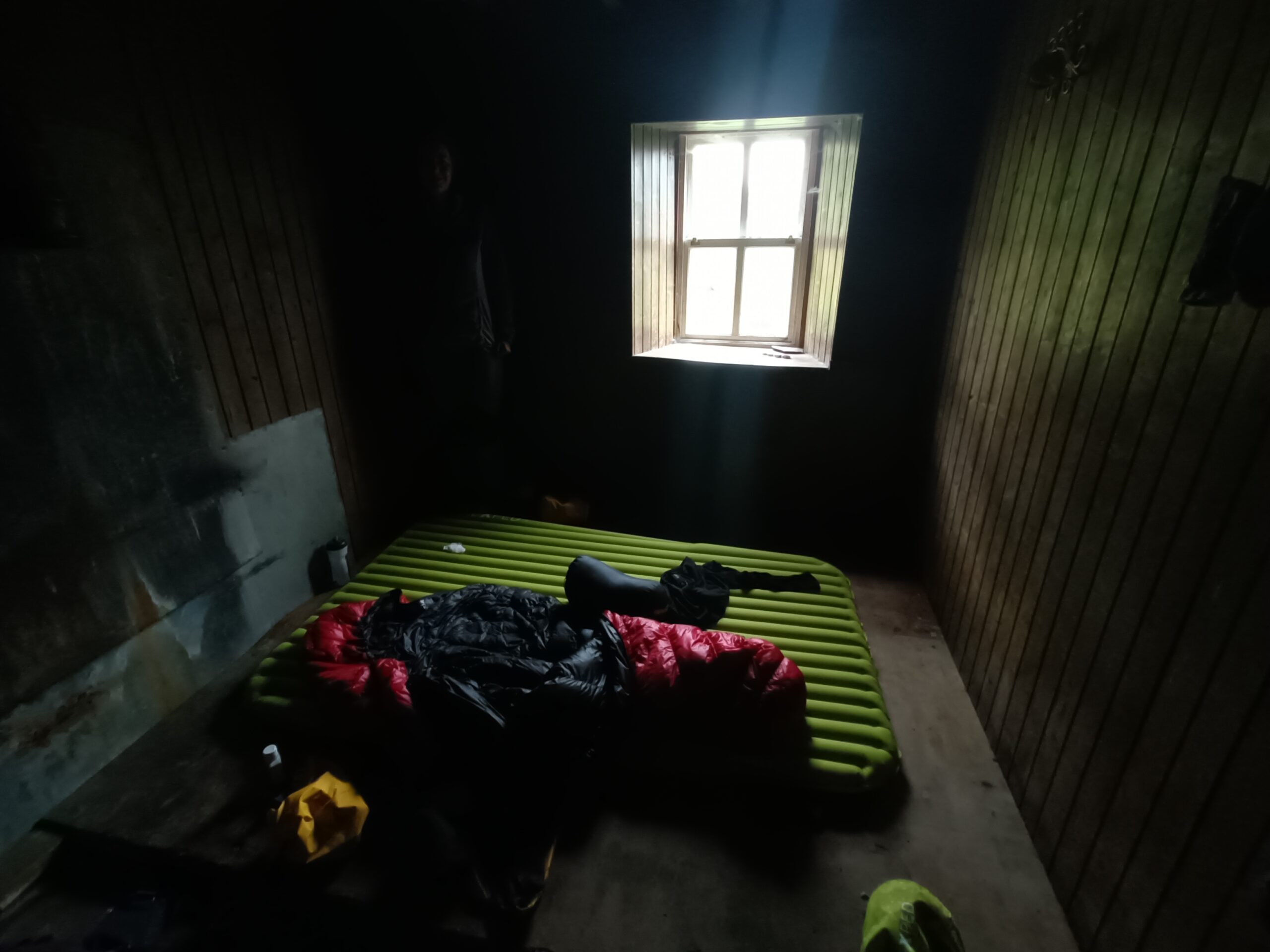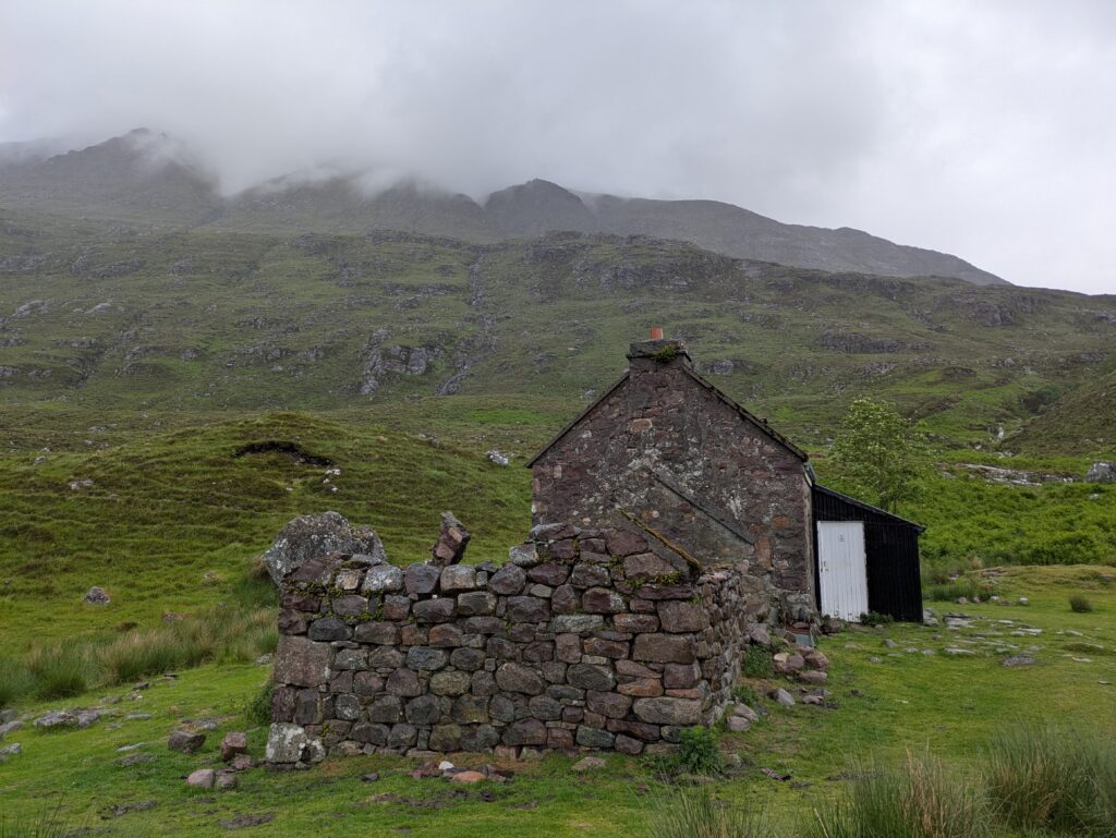 Cette journée aura été faite de hauts et bas topographiques, météorologiques et émotionnels. Déjà, on a passé une très mauvaise nuit: après s’être paisiblement endormis à 22h30, on est réveillés en sursaut à minuit par la porte de “notre” “chambre” qui s’ouvre brusquement et une lampe frontale qui nous éblouit. Sans un mot, la personne laisse la porte ouverte et part explorer le reste du bothy, avant de revenir dix minutes plus tard pour la refermer. S’ensuit un bruyant concert de bruissement de sacs plastiques, de gonflage de matelas et de forts chuchotements dans la pièce voisine. Bref, on a eu de la peine à bien dormir après ça et on s’est réveillés crevés, malgré un réveil repoussé de 6h30 à 7h.