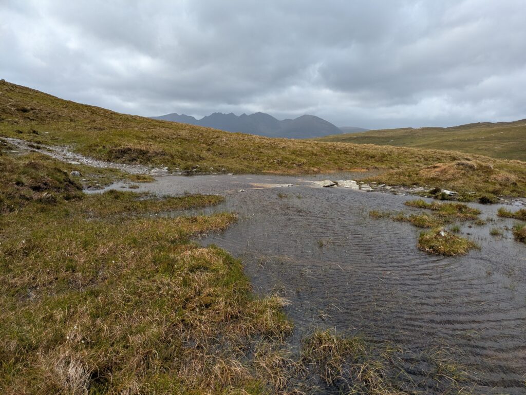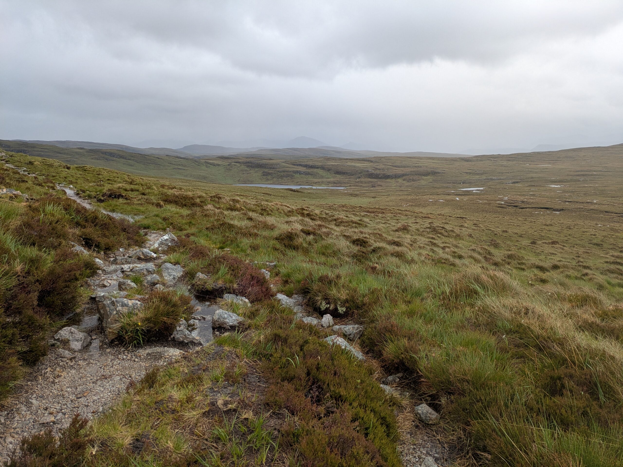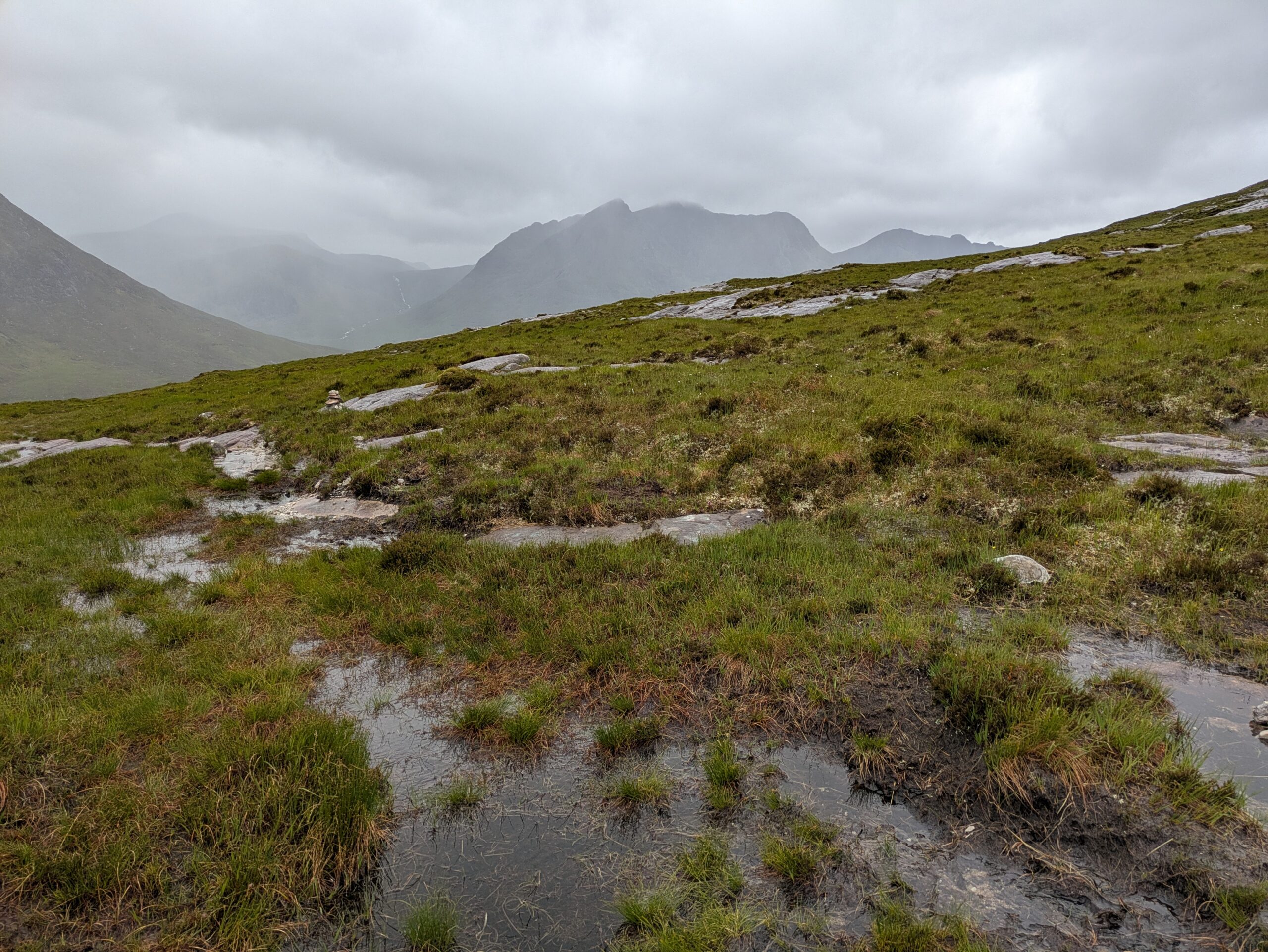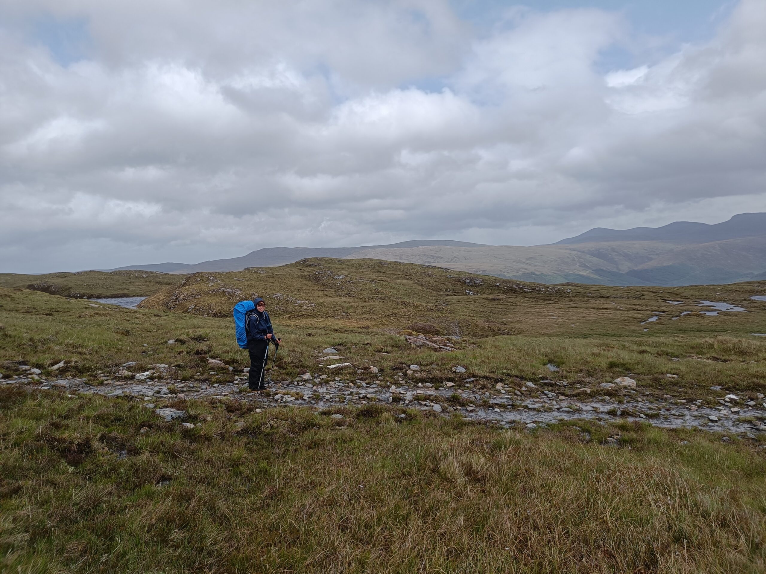 Autre difficulté: la météo. On a eu beaucoup de pluie, avec quand même quelques rares instants de soleil — mais je n’ai jamais eu le temps de sortir l’appareil Sony, l’averse suivante nous guettant toujours de près. On a aussi eu droit à de la grêle (dans le dos, heureusement, contrairement à notre expérience dans le Knoydart où elle nous fouettait en pleine face ^^) et à beaucoup de vent, avec des rafales déstabilisantes et qui refroidissaient l’air ambiant de manière conséquente (j’ai eu très froid aux mains).