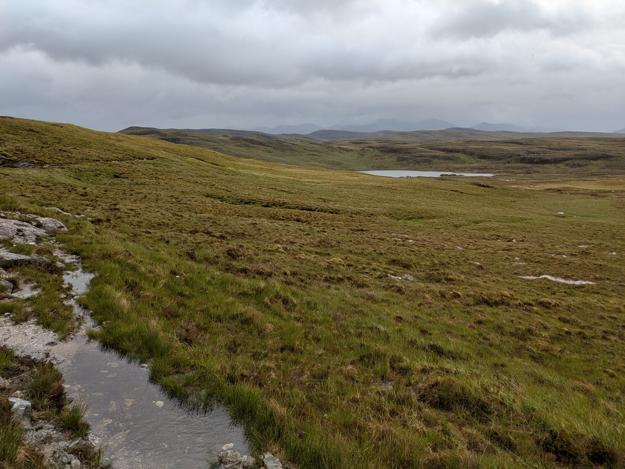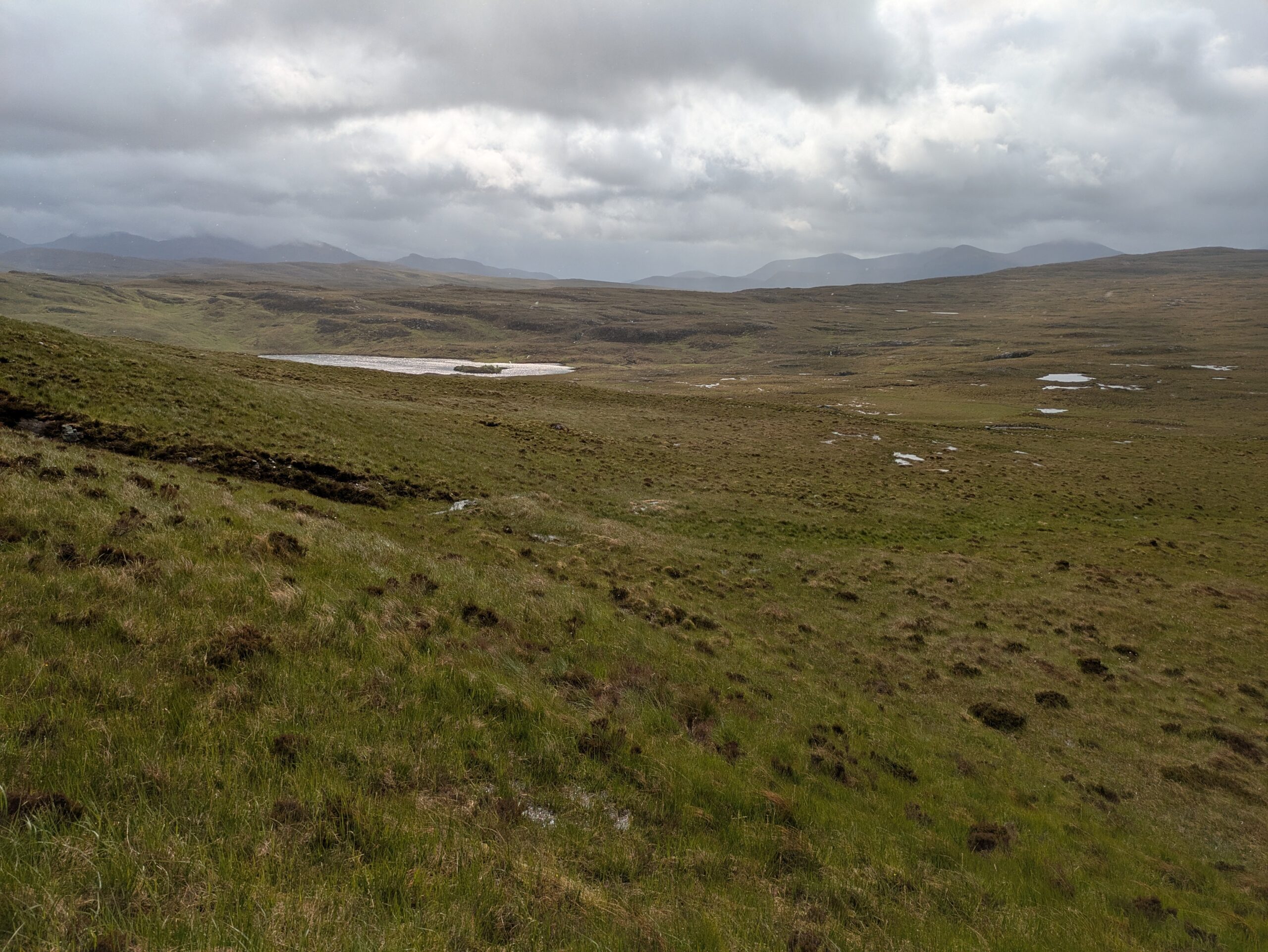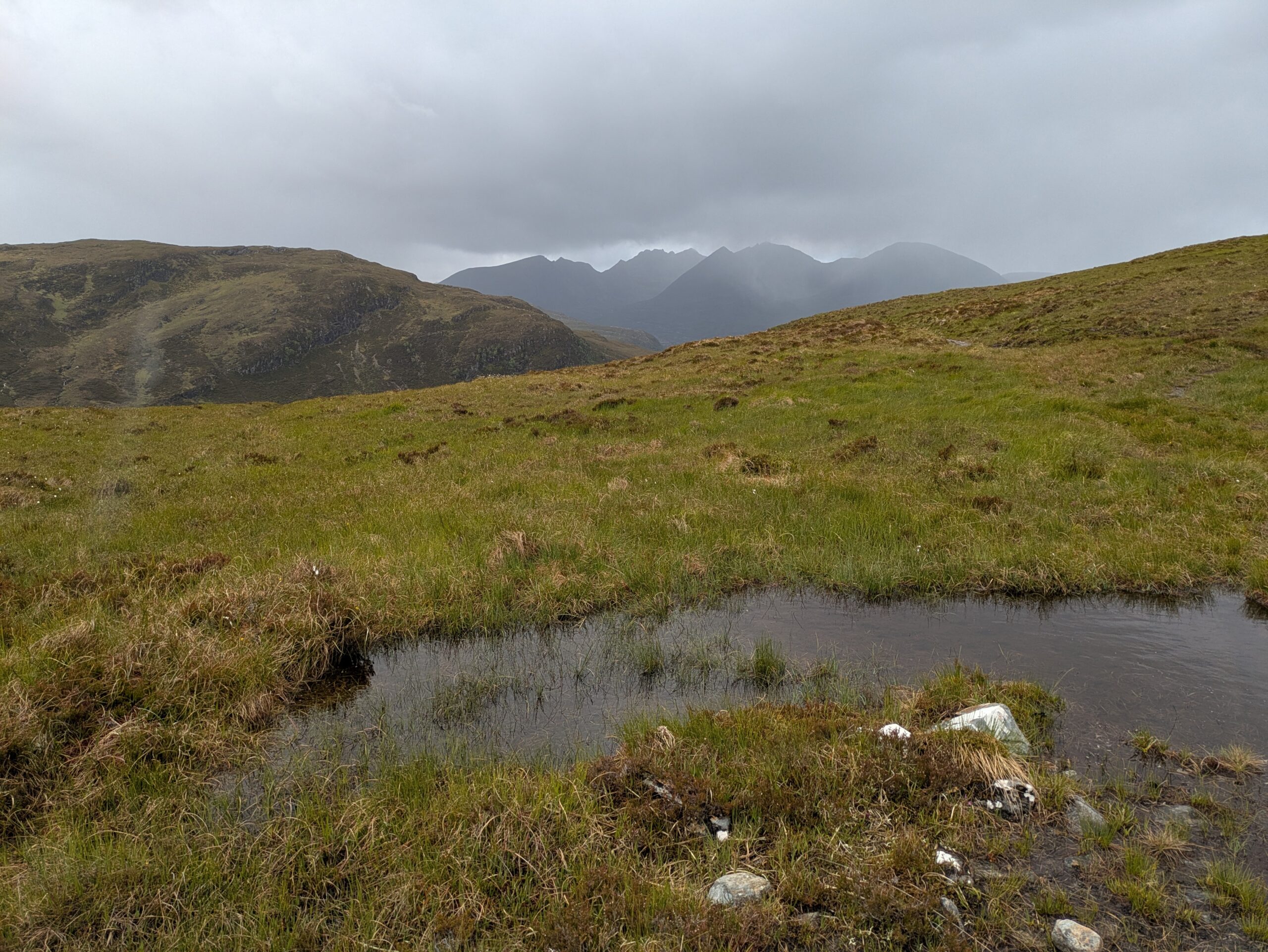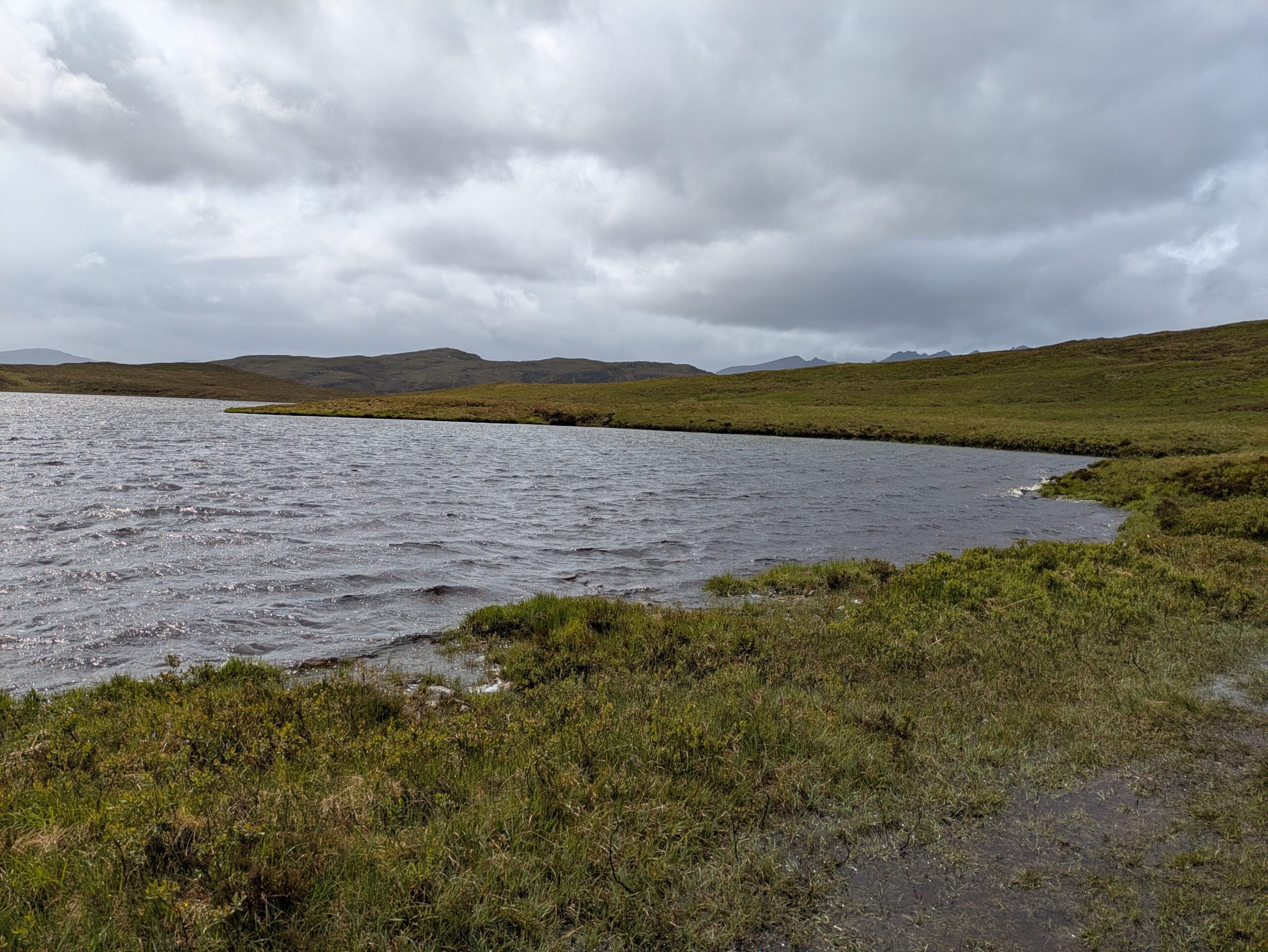 Autre difficulté: la météo. On a eu beaucoup de pluie, avec quand même quelques rares instants de soleil — mais je n’ai jamais eu le temps de sortir l’appareil Sony, l’averse suivante nous guettant toujours de près. On a aussi eu droit à de la grêle (dans le dos, heureusement, contrairement à notre expérience dans le Knoydart où elle nous fouettait en pleine face ^^) et à beaucoup de vent, avec des rafales déstabilisantes et qui refroidissaient l’air ambiant de manière conséquente (j’ai eu très froid aux mains).