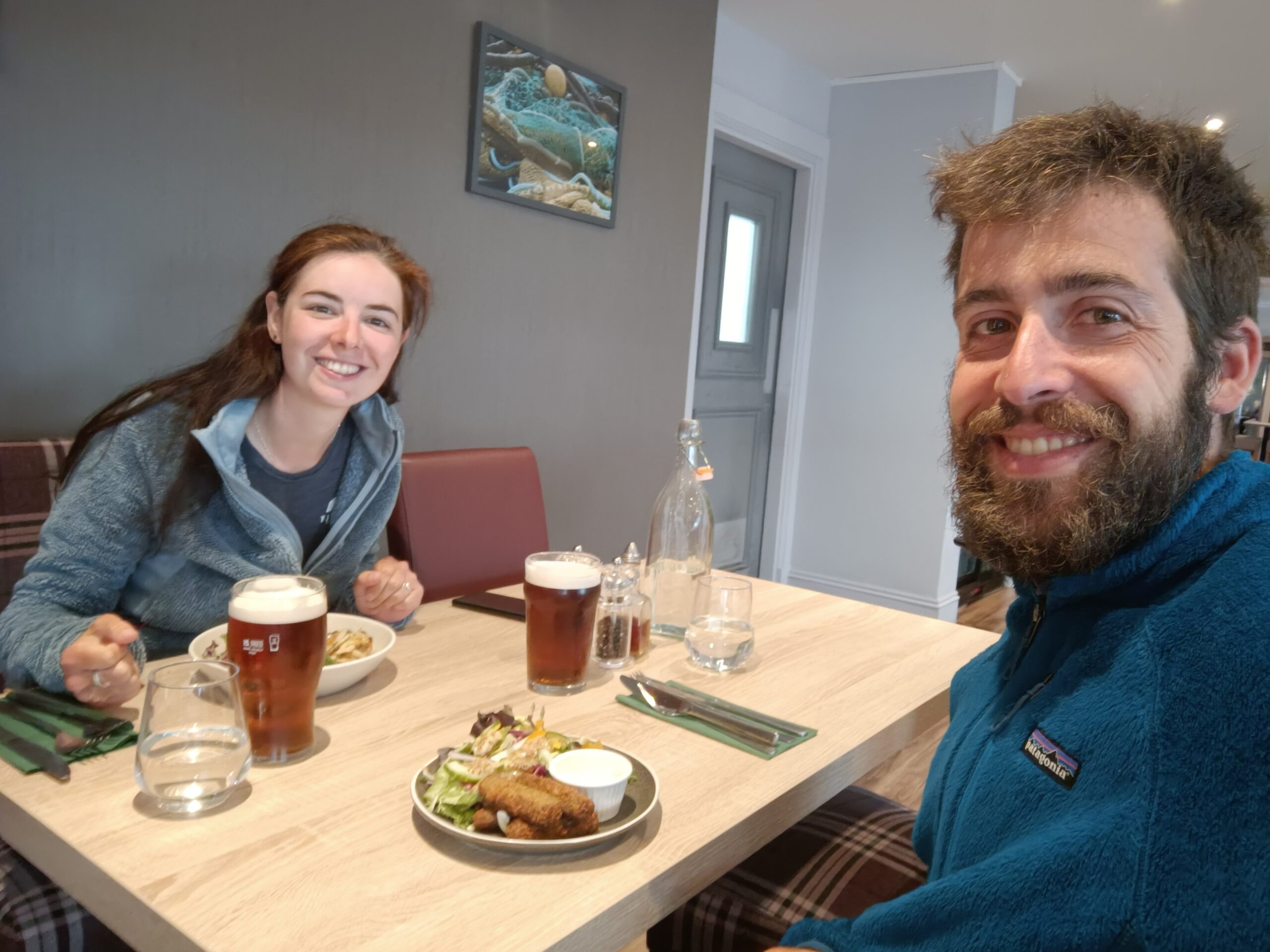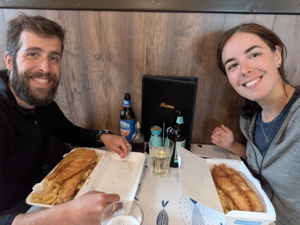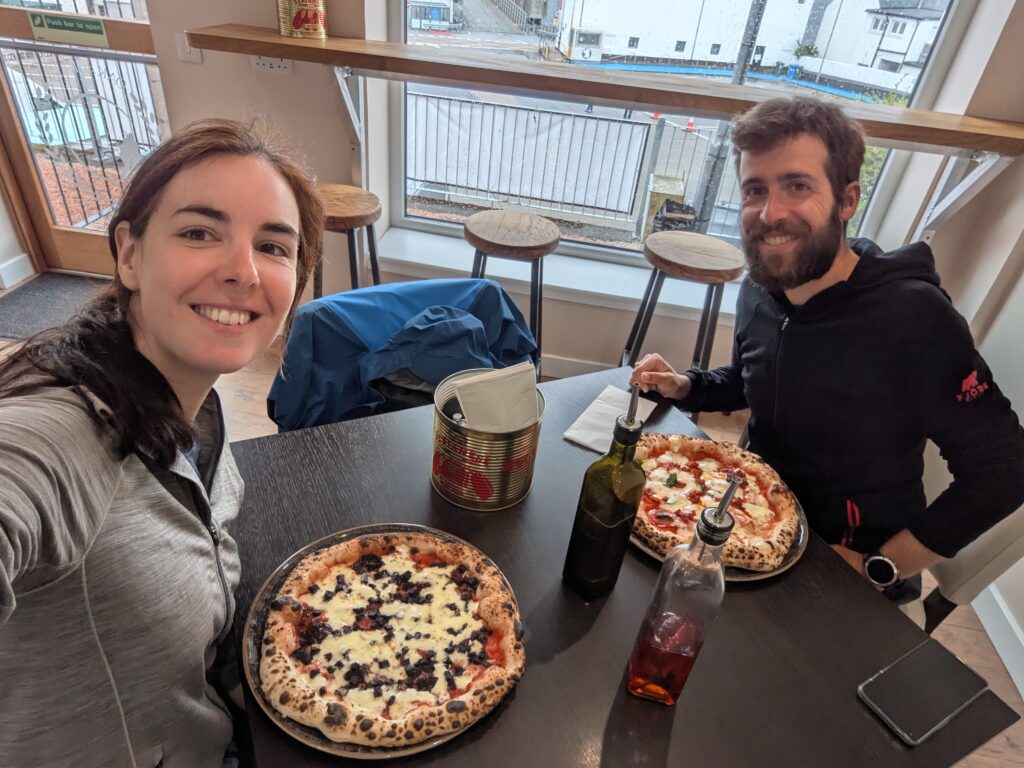Le lendemain, on a vécu une journée de repos idéale à Ullapool. Point le plus important, on a super bien mangé: granola au Cult Café le matin, pizza napolitaine à tomber chez Oak & Grain à midi, et super Fish & chips le soir chez Delicasea (où les clientes de la table voisine parlaient gaélique, héhé!). Ensuite, on a pu faire faire notre lessive par un laundry service ultra sympa qui a pris nos habits alors même qu’il était full (la dame a clairement eu pitié de nous ^^). On a pu se ravitailler chez Tesco et chez Ullapool Outdoors, un magasin local hyper bien fourni et très sympa où nous attendaient plein de plats lyophilisés et un paquet de nouvelles chaussettes Injinji (on avait des paires tellement trouées qu’on n’arrivait plus à les rapiécer ^^). Il faisait bien pluvieux et on avait déjà visité le musée local en 2023, donc on a passé l’après-midi à regarder des vidéos YouTube en mangeant des fraises et buvant du chocolat chaud, héhé.