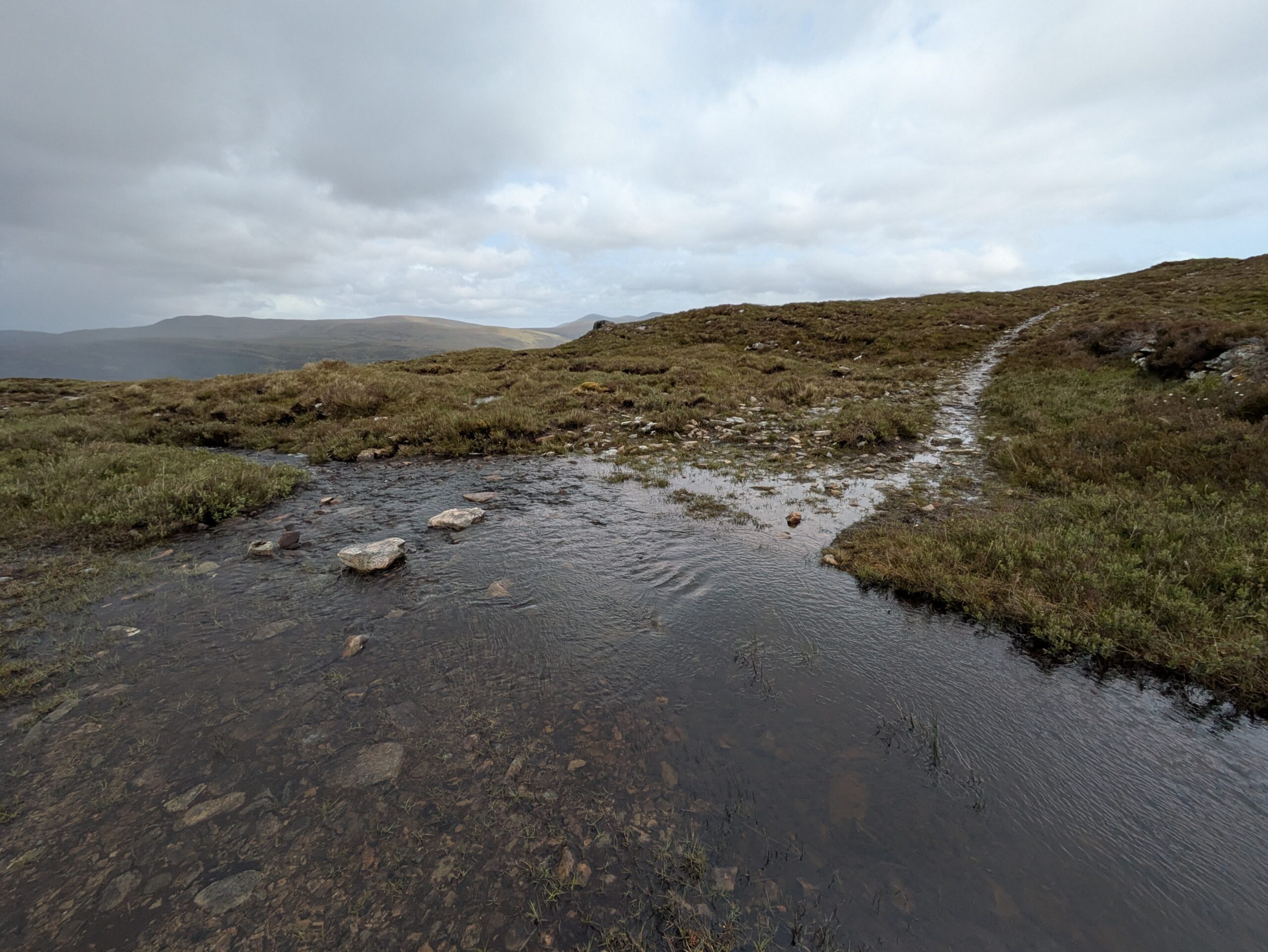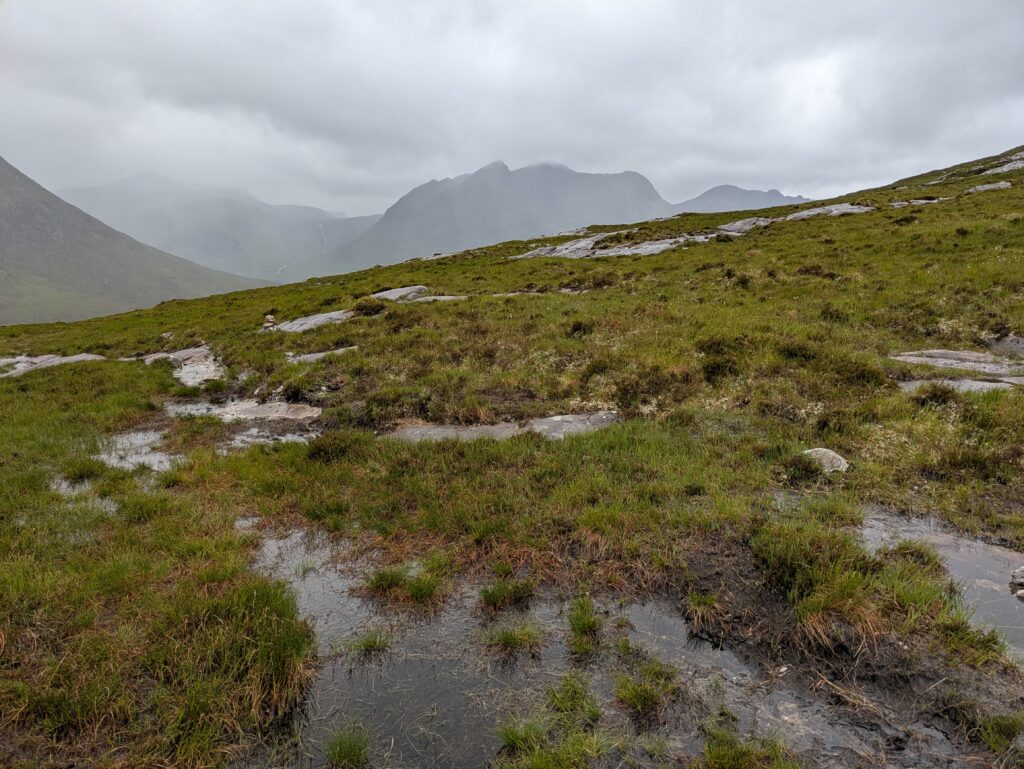 Avec la pluie, le sentier était transformé en véritable torrent. Le bog était parcouru de petites rivières éphémères mais étonnamment profondes. Contrairement à la veille, on a vite abandonné l’illusion de garder nos pieds secs — il y avait de toute façon quelques rivières à traverser, mais rien de bien méchant.