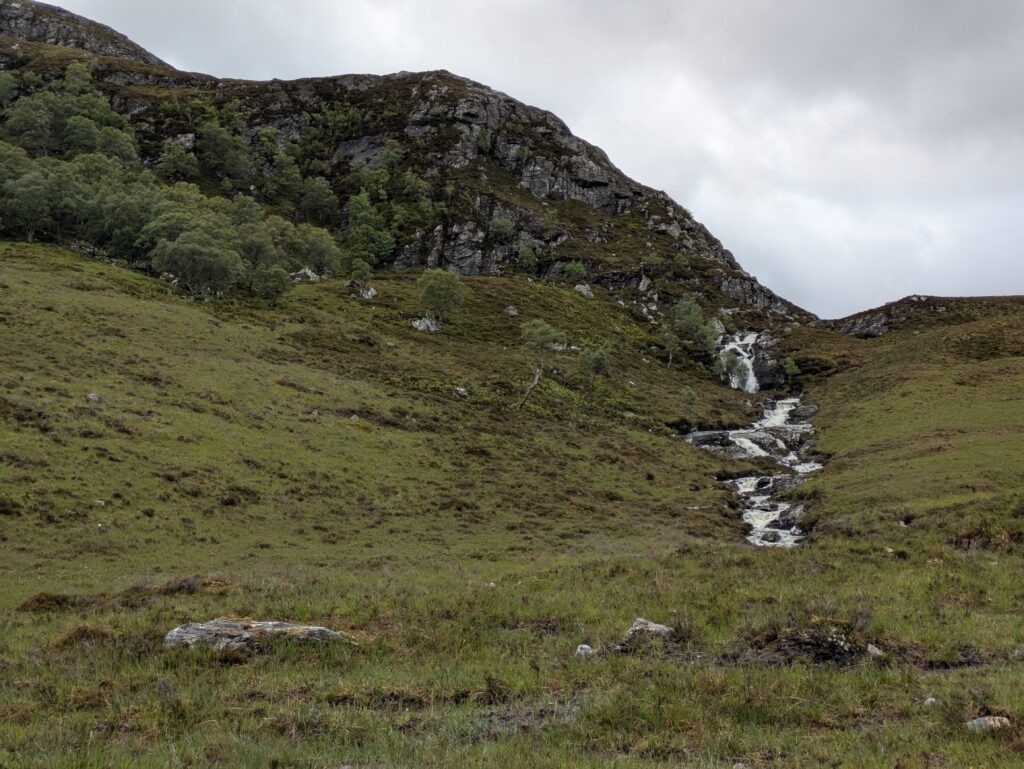 On a finalement rejoint une route, qu’on a dû longer sur quelques centaines de mètres avant de traverser un pont sur la rivière Dundonnell et de remonter dans les hauteurs. Les vues sur An Teallach, dans notre dos, étaient vraiment superbes. On a aussi pu admirer quelques jolies cascades et lochans.