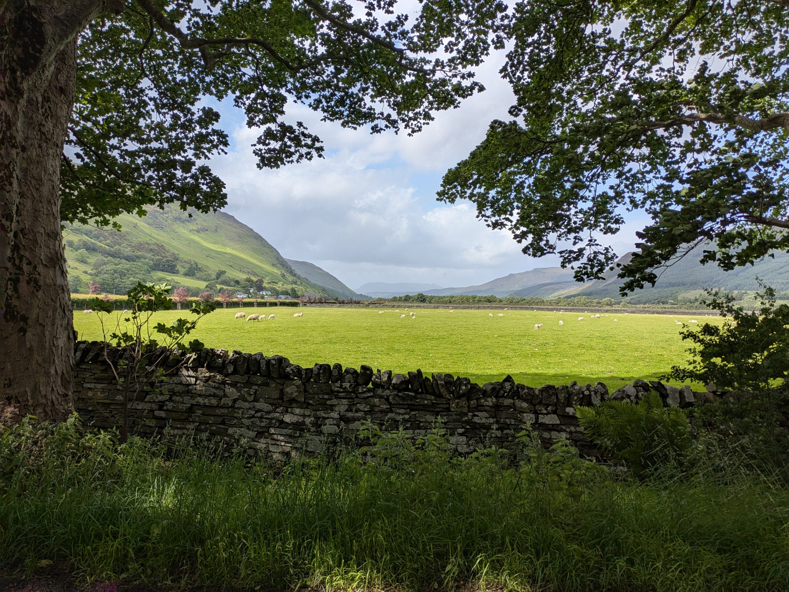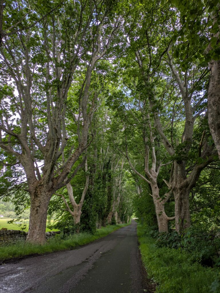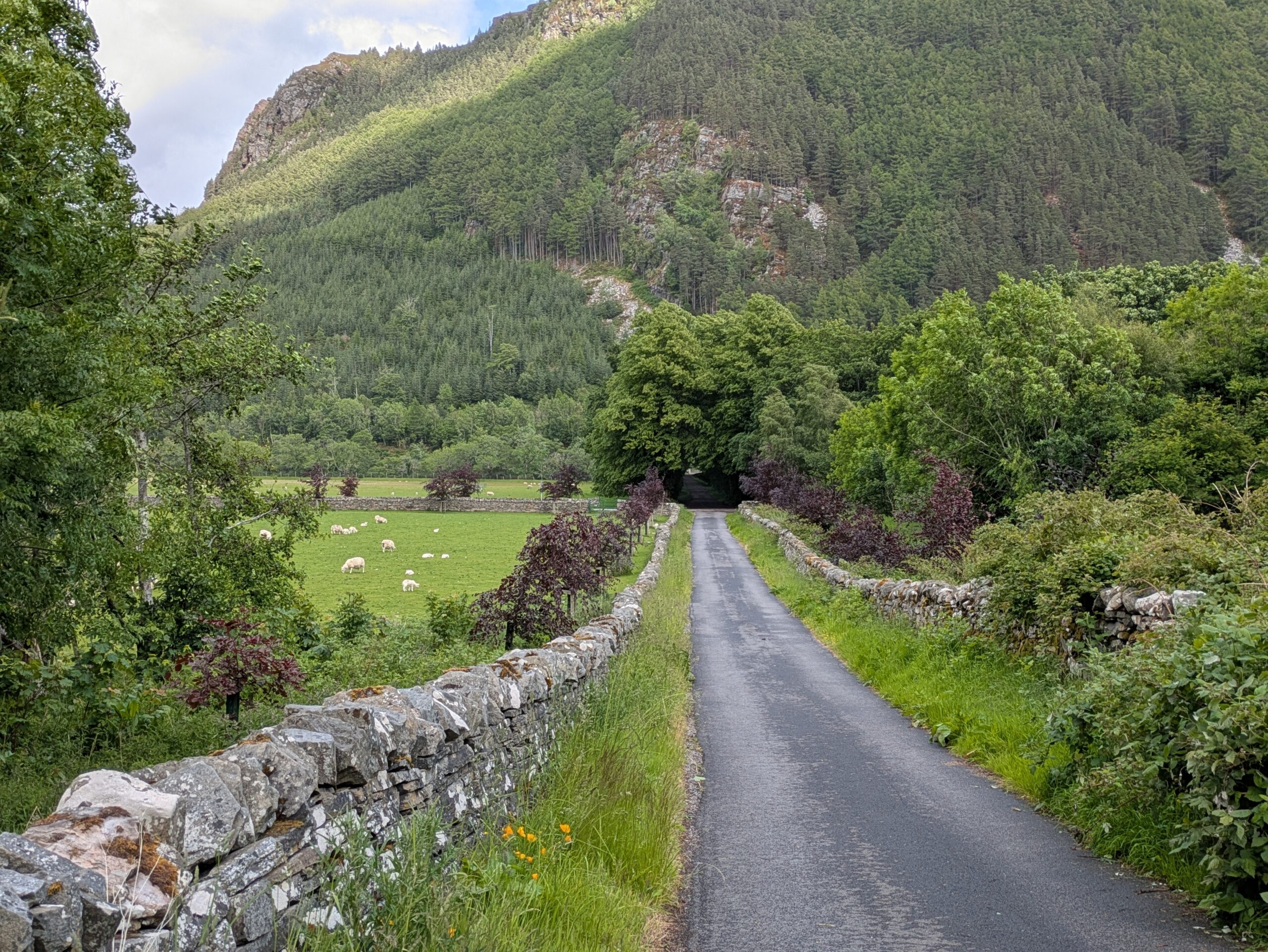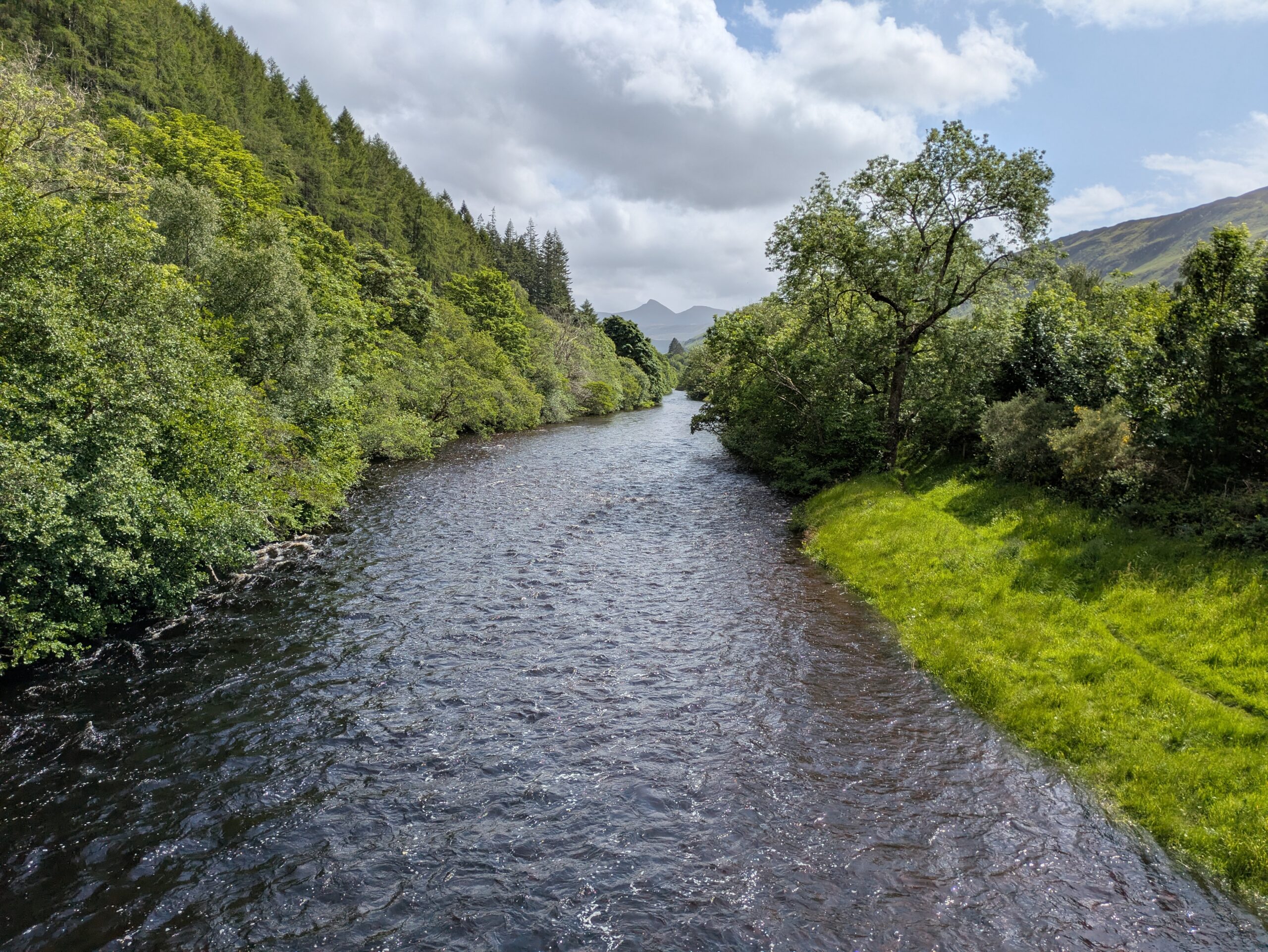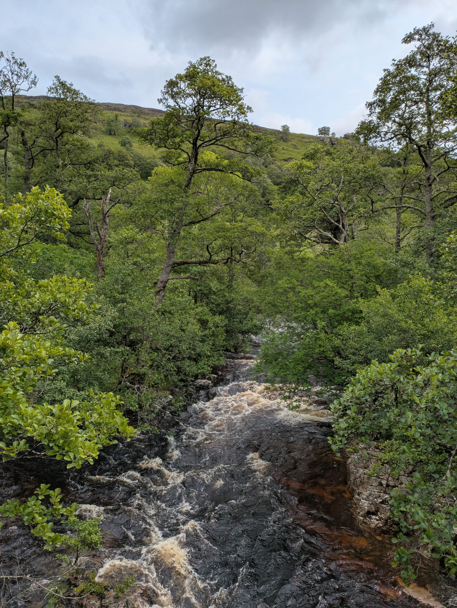 On atteint Inverbroom Bridge, vers Inverlael, où passe la route pour Ullapool, qui se trouve 13 km à l’ouest et où on a prévu de prendre un jour de repos. On n’a aucune intention de marcher 13 km le long de cette route pas mal fréquentée (par plein de camions, en plus) mais il n’y a pas de bus avant plusieurs heures, le vent souffle hyper fort et les arbres font un peu peur — on voit d’ailleurs une branche fraîchement tombée sur la route. On n’a pas envie de passer trop de temps à la merci des éléments en tentant notre chance au stop (Alex et Carmen, les Australiens, nous ont plus tard raconté avoir dû attendre vachement longtemps avant d’être pris en stop à cet endroit), donc on décide d’appeler un taxi.