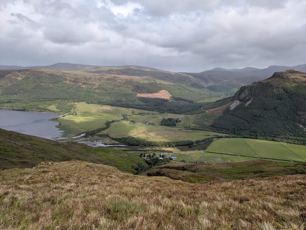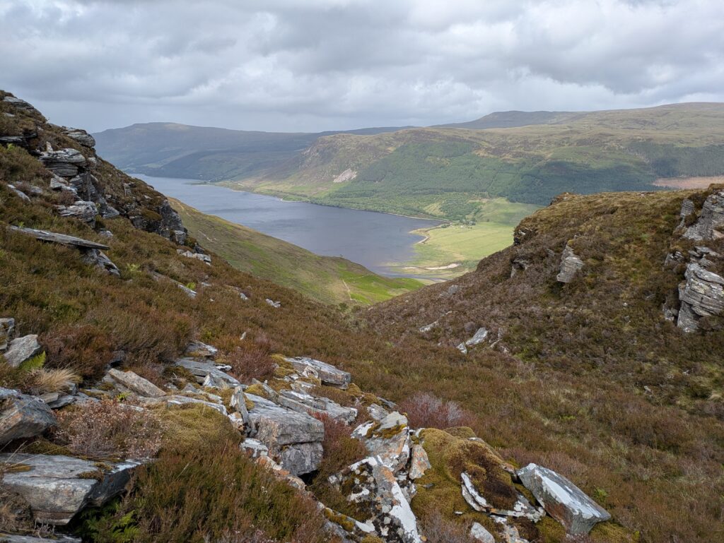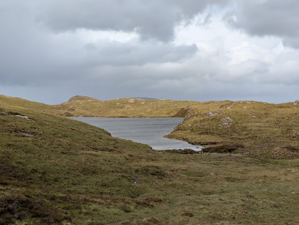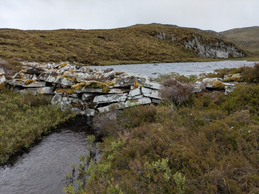 On passe devant Lochan Dubh (“petit lac noir”) et les vestiges d’un petit barrage de pierre sèche. Soudain, Loch Broom apparaît en contrebas, splendide.