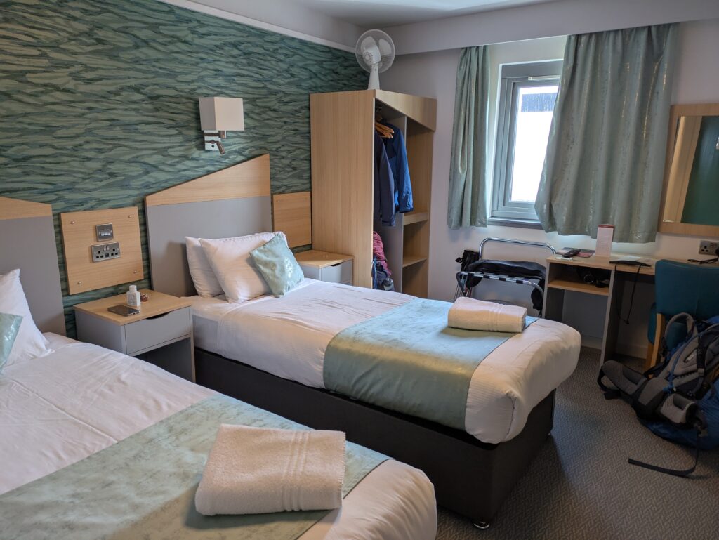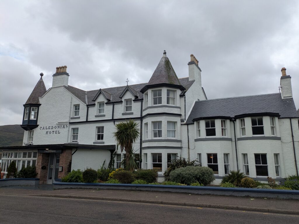 En quelques minutes, nous voici au sec et en route pour Ullapool. Notre conductrice, très sympa, nous met à jour sur les dernières nouvelles et nous apprend qu’il y a des incertitudes avec le ferry à cause des forts vents, ça ne rigole pas! Ça crée un peu la pagaille car les hébergements du coin sont quasi tout le temps complets et des passagers en rade se retrouvent coincés sans nulle part où dormir — on avait d’ailleurs galéré à réserver une chambre, mais finalement on a déniché une twin room (la toute dernière chambre dispo!) au Caledonian Hotel, yay. Malheureusement, on apprend aussi qu’un randonneur suisse qui faisait le Cape Wrath Trail en solo a trouvé la mort quelques jours auparavant, probablement en traversant une rivière vers Kinloch Hourn. Arf, ça nous file un petit coup au moral et nous rappelle les risques inhérents aux sorties en montagne et qu’un accident est si vite arrivé…