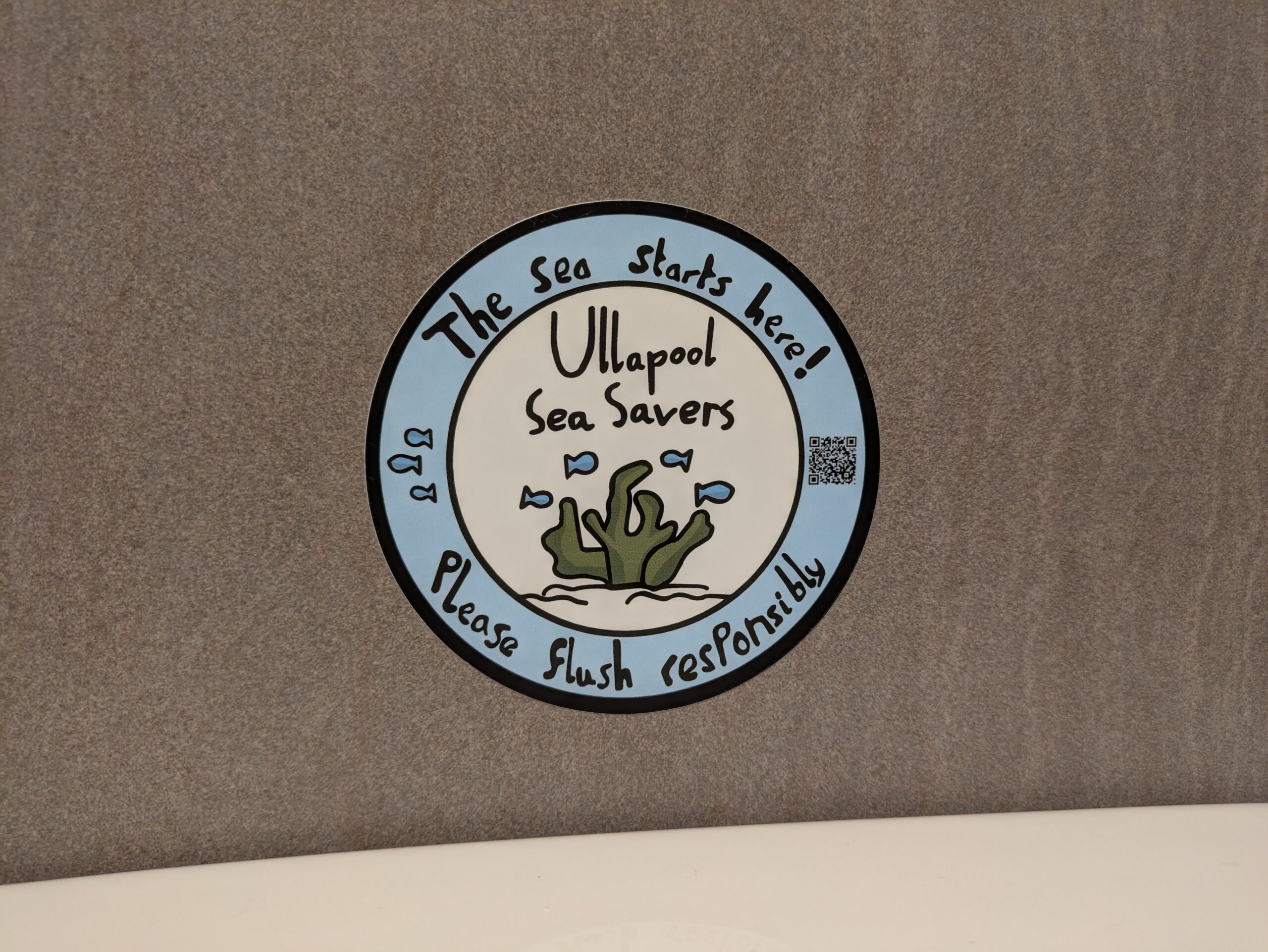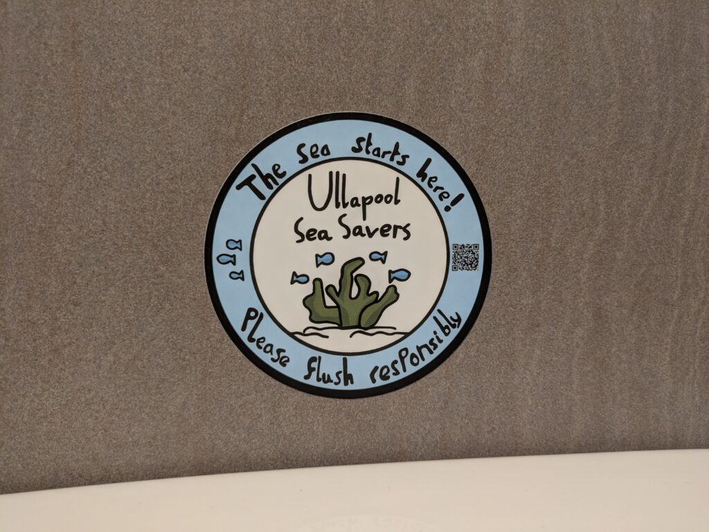 P.S. Dans les toilettes de l’hôtel, on a été tout contents de tomber sur des autocollants d’Ullapool Sea Savers (USS), un groupe local de jeunes hyper impliqués dans la conservation de la vie marine. On en avait déjà entendu parler dans le super documentaire “Scotland: Ocean Nation” de Cal Major, qui invite aussi régulièrement des membres d’USS dans son podcast “Our Ocean“, que je vous recommande chaudement!
