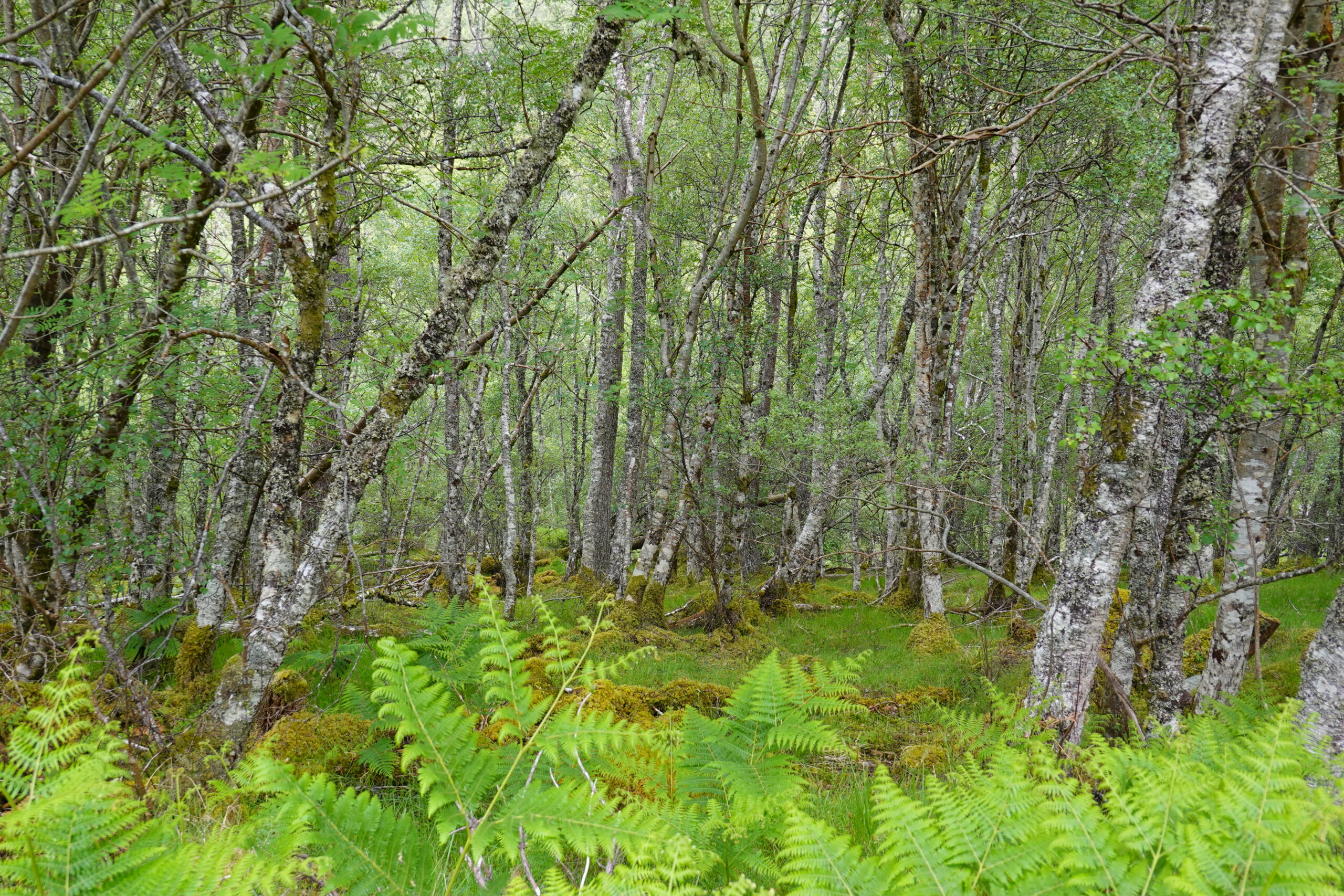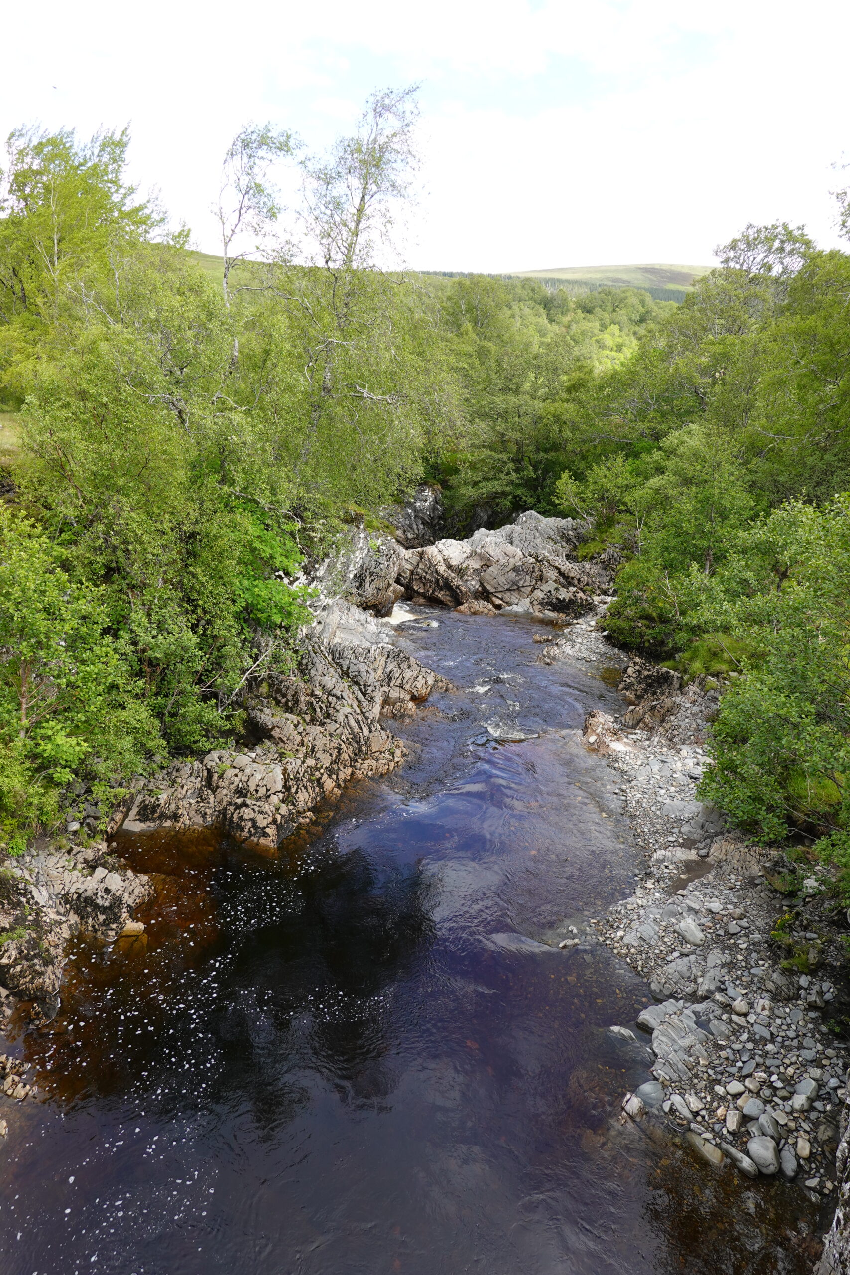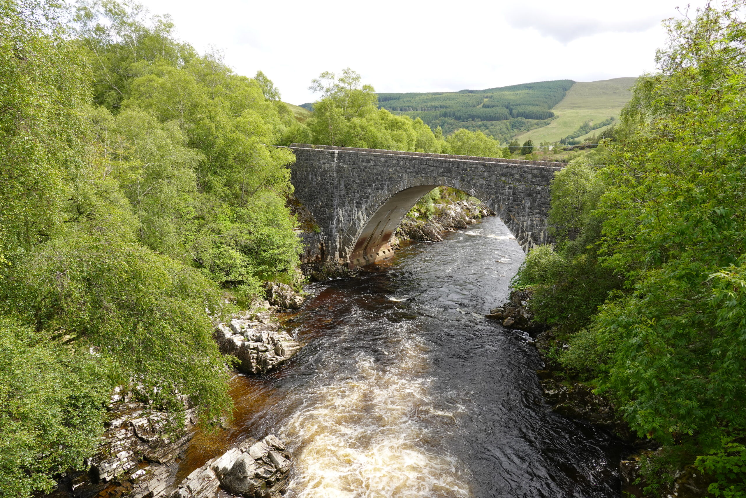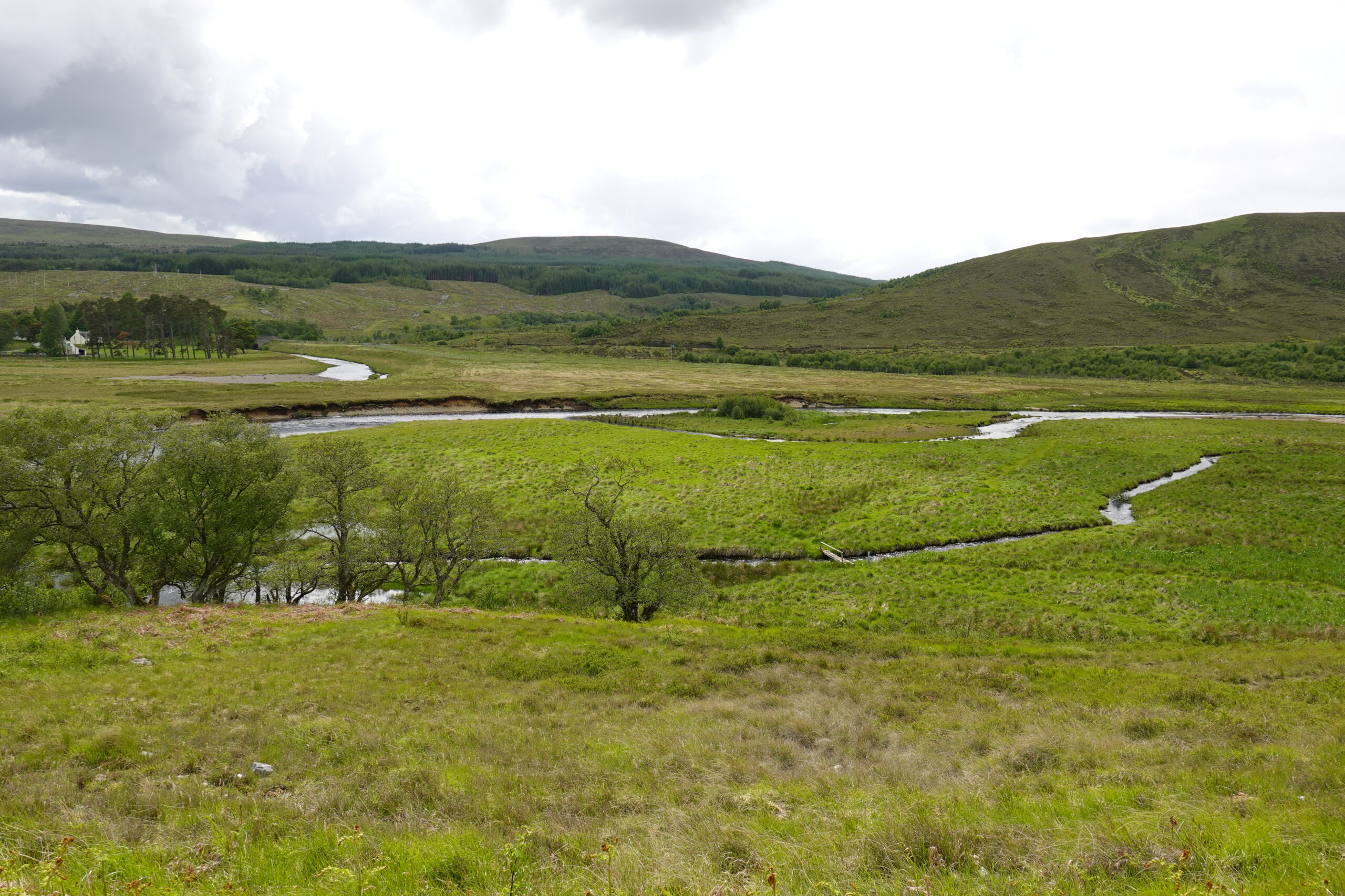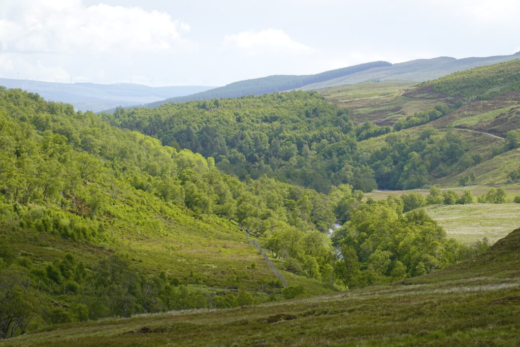 Le track se poursuit dans Glen Einig, où se trouve une jolie forêt de bouleaux et sureaux (avec aussi des plantations au loin, et même des éoliennes encore plus loin), mais c’est peu varié. On avale les kilomètres: la promesse de frites nous fait marcher plus vite.
