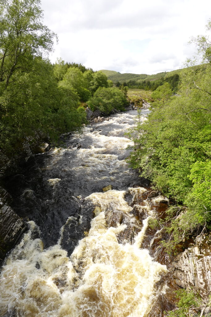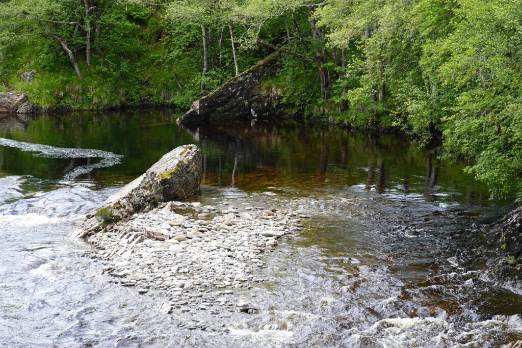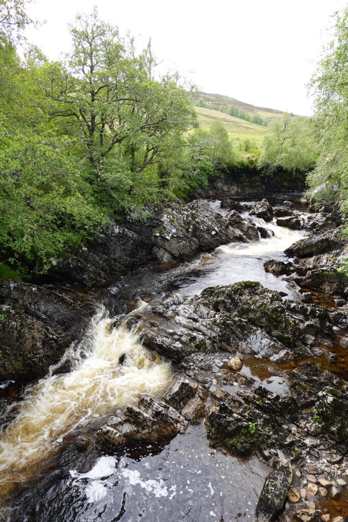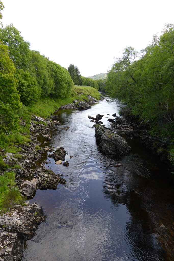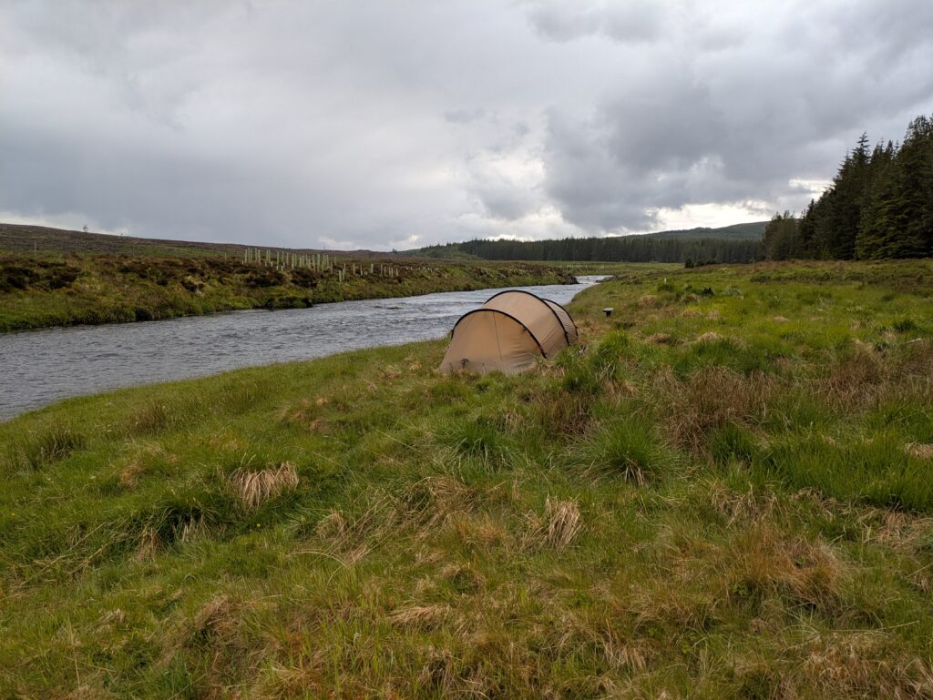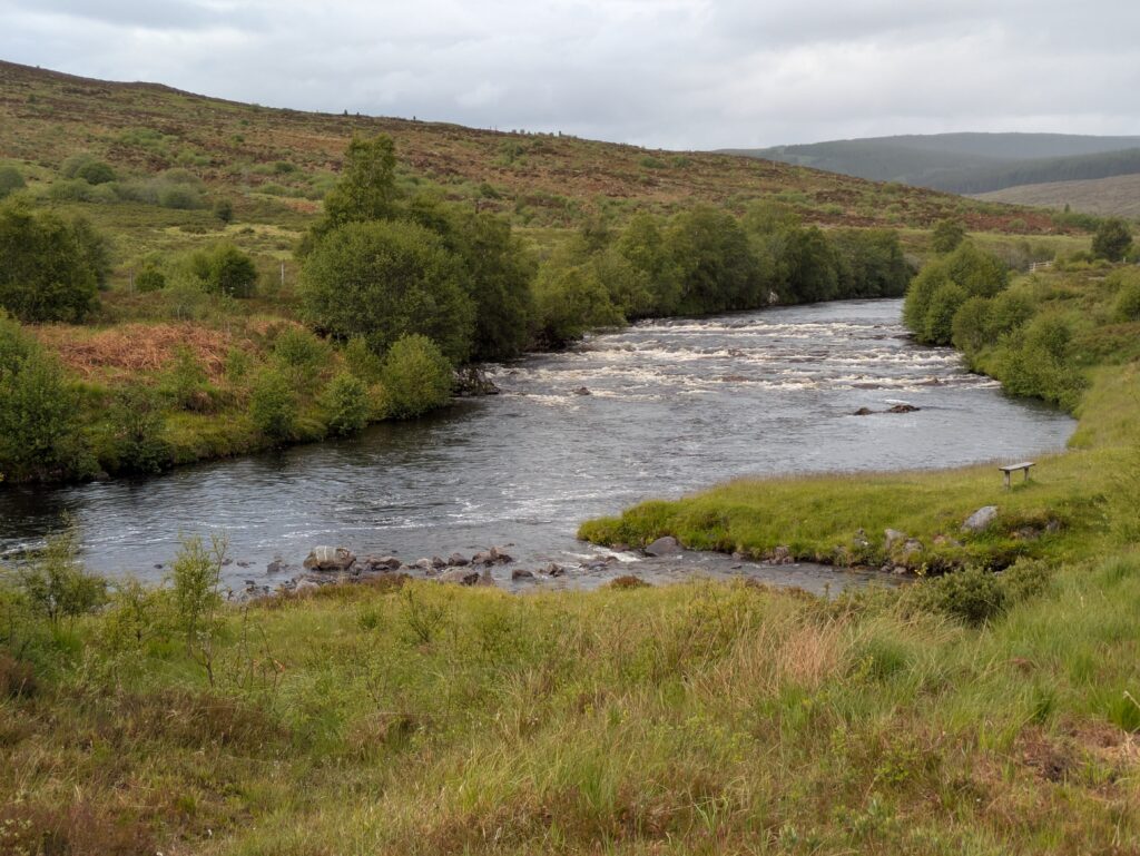 On atteint un tronçon de l’Oykel très clairement dédié à la pêche: il y a des bancs tout le long de la rivière, ainsi que des cabanons de pêcheurs. On croise plusieurs voitures (toutes avec leur support à canne à pêche sur le capot, cela va de soi), et un conducteur s’arrête pour nous saluer et nous dit, “secrètement”, qu’il y a une fishing hut ouverte que personne n’utilise ce soir, et qu’à notre place, il dormirait là-bas, *wink*. 😉 On échange aussi quelques mots sur l’absence inquiétante de poissons — ça parlait aussi de ça à Oykel Bridge.