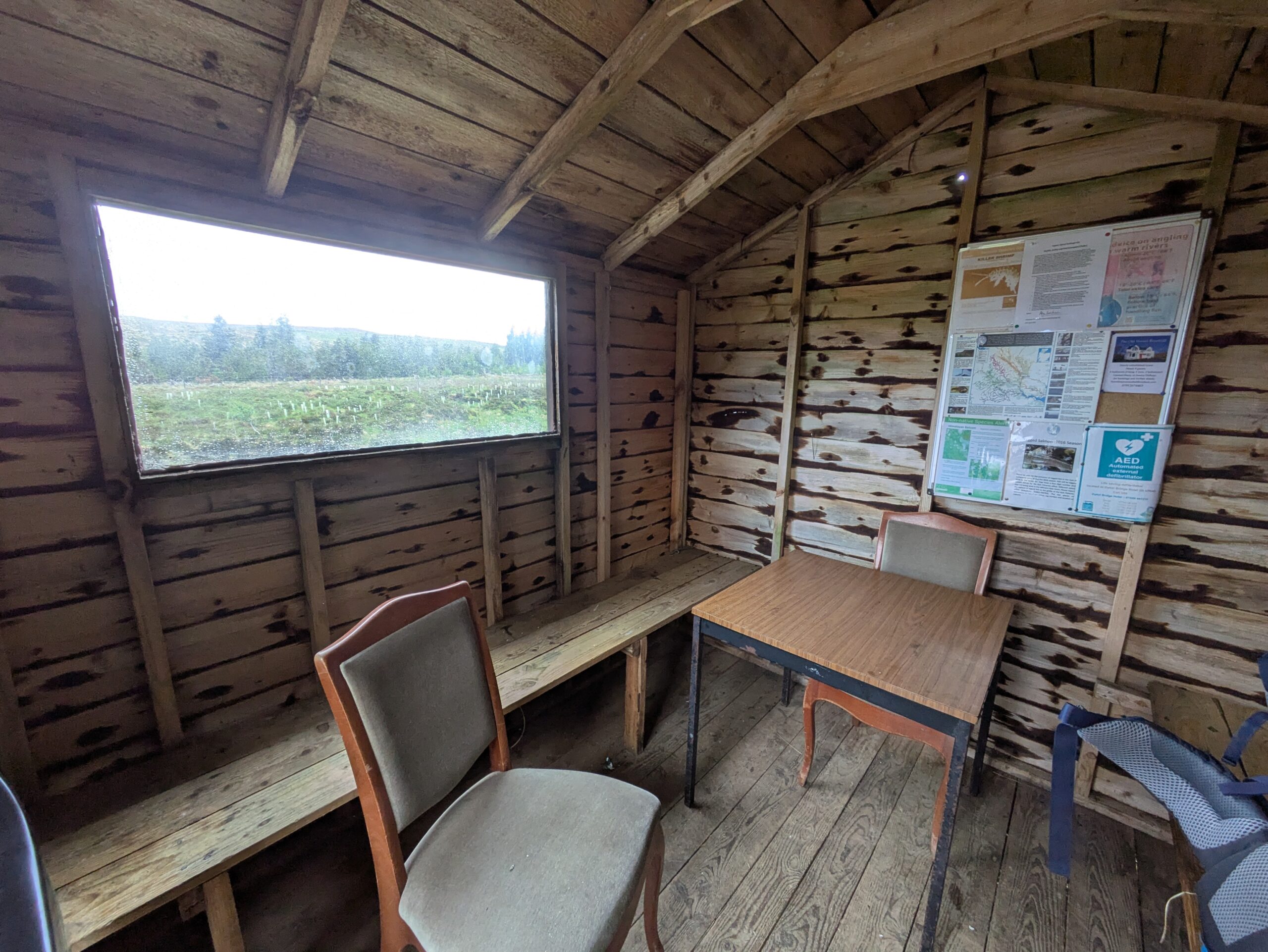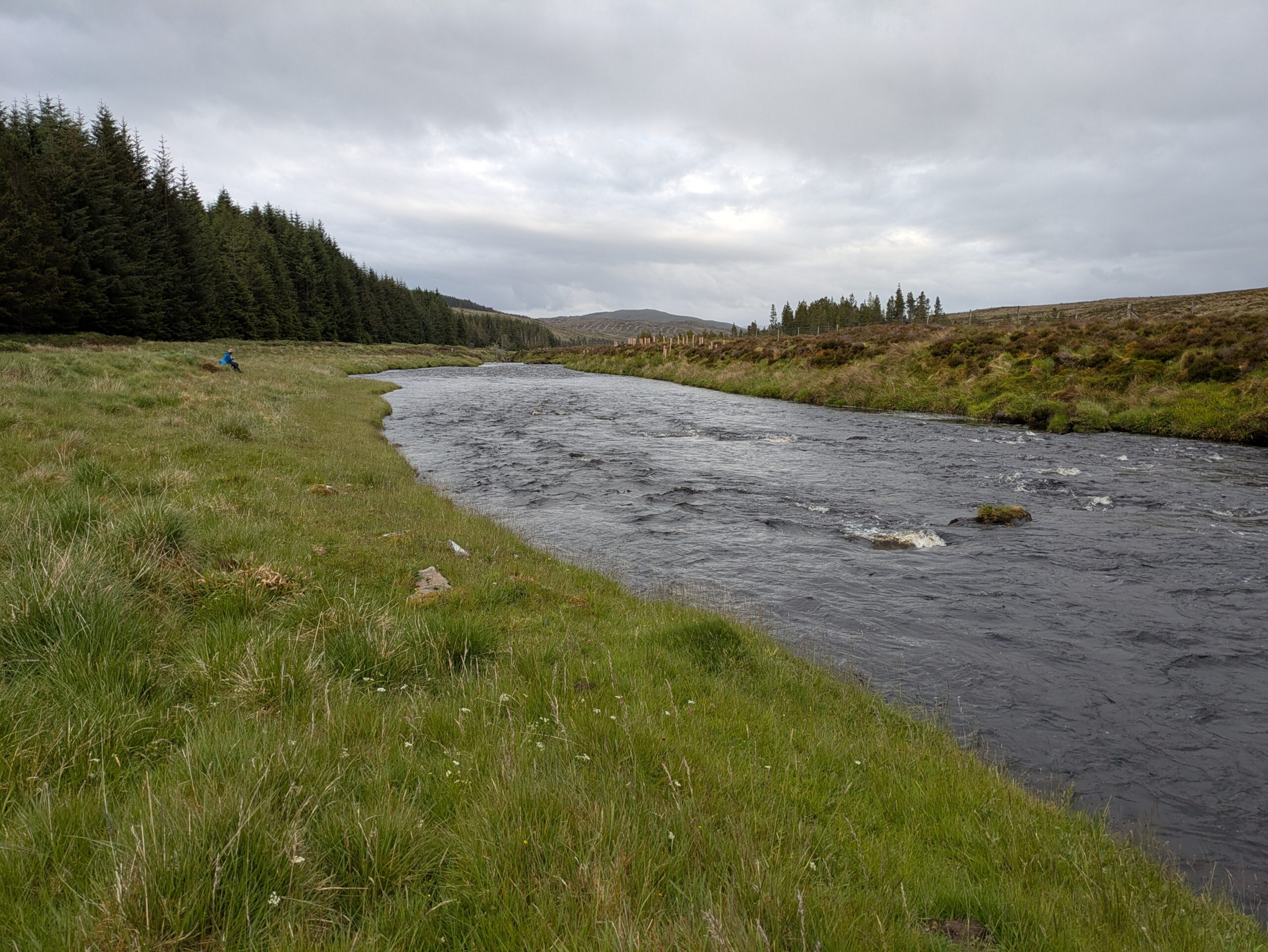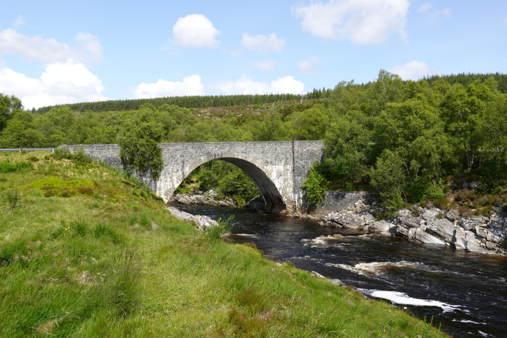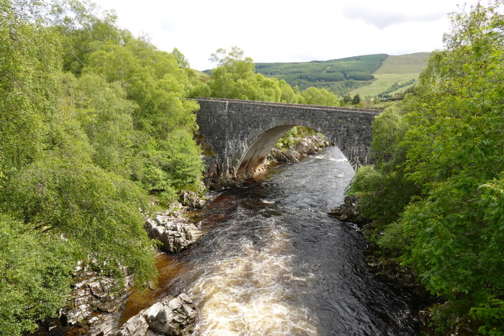 On atteint un tronçon de l’Oykel très clairement dédié à la pêche: il y a des bancs tout le long de la rivière, ainsi que des cabanons de pêcheurs. On croise plusieurs voitures (toutes avec leur support à canne à pêche sur le capot, cela va de soi), et un conducteur s’arrête pour nous saluer et nous dit, “secrètement”, qu’il y a une fishing hut ouverte que personne n’utilise ce soir, et qu’à notre place, il dormirait là-bas, *wink*. 😉 On échange aussi quelques mots sur l’absence inquiétante de poissons — ça parlait aussi de ça à Oykel Bridge.
