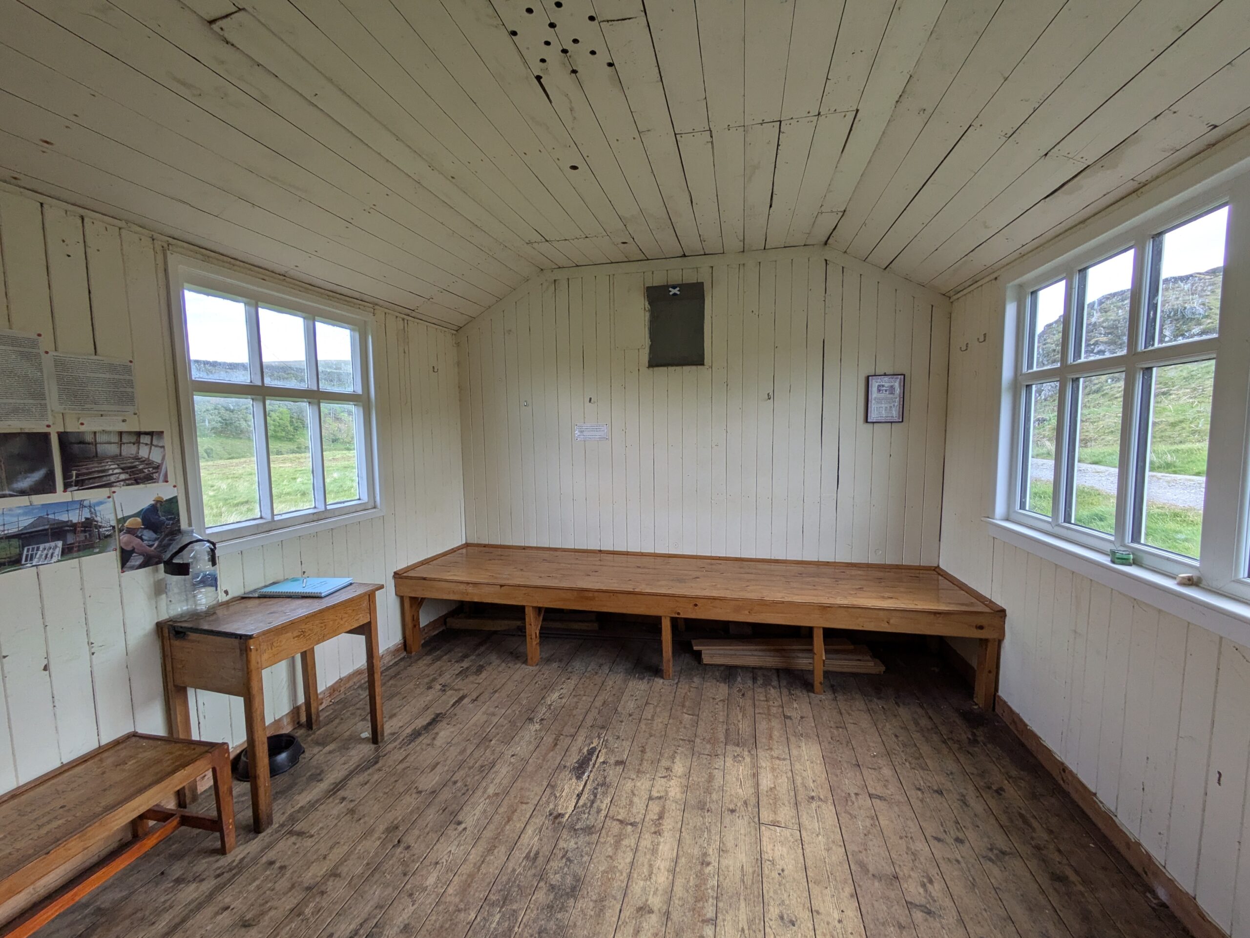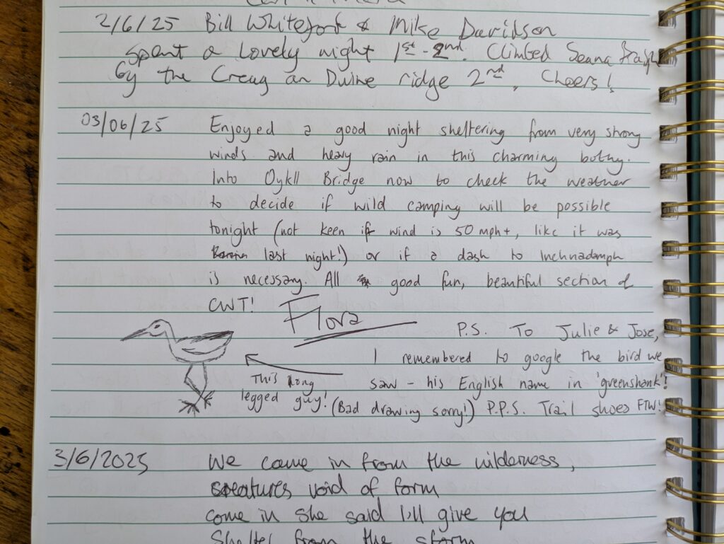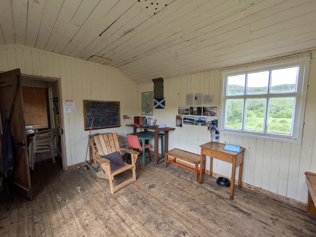 Comme son nom l’indique, ce bothy était anciennement une école, et il reste quelques bureaux et livres, ainsi qu’un tableau noir, héhé. Dans le bothy book, on trouve un message laissé par Flora, qu’on n’a plus vue depuis plusieurs jours (elle n’avait que peu de temps pour terminer le Cape Wrath Trail, donc elle avançait à un rythme fou) mais dont on adore suivre la progression grâce aux bothy books. On commence d’ailleurs à reconnaître les noms des gens qui nous précèdent sur le trail, vu qu’il est d’usage de laisser un message dans chaque bothy passé en chemin, qu’on y dorme ou pas.