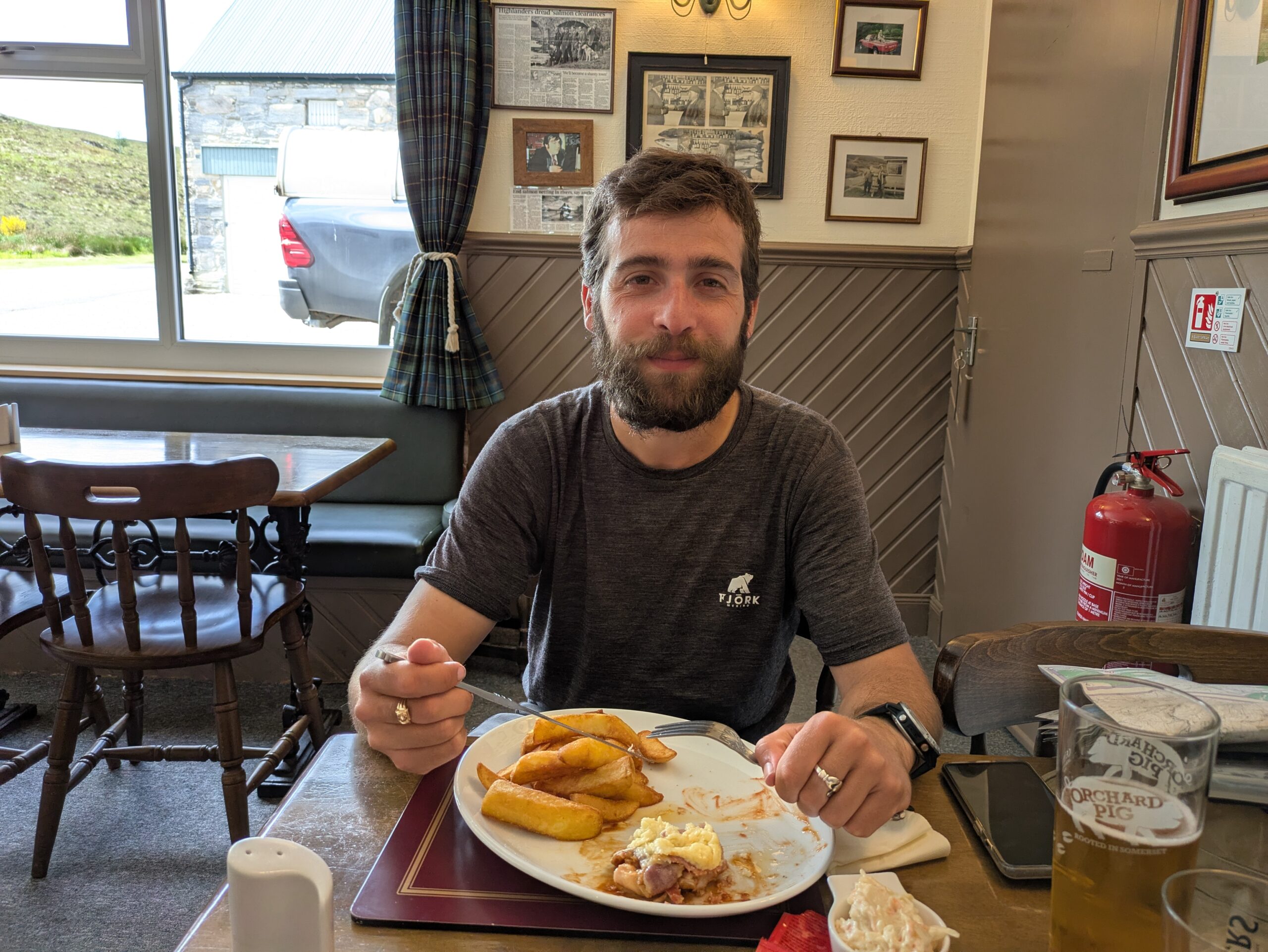 Eh oui, car à 13h, après une quinzaine de km de marche, on se pose au public bar du Oykel Bridge Hotel pour un bon lunch: burger/hunter’s chicken, chunky chips, et un crumble pomme-fraise avec custard, yum.