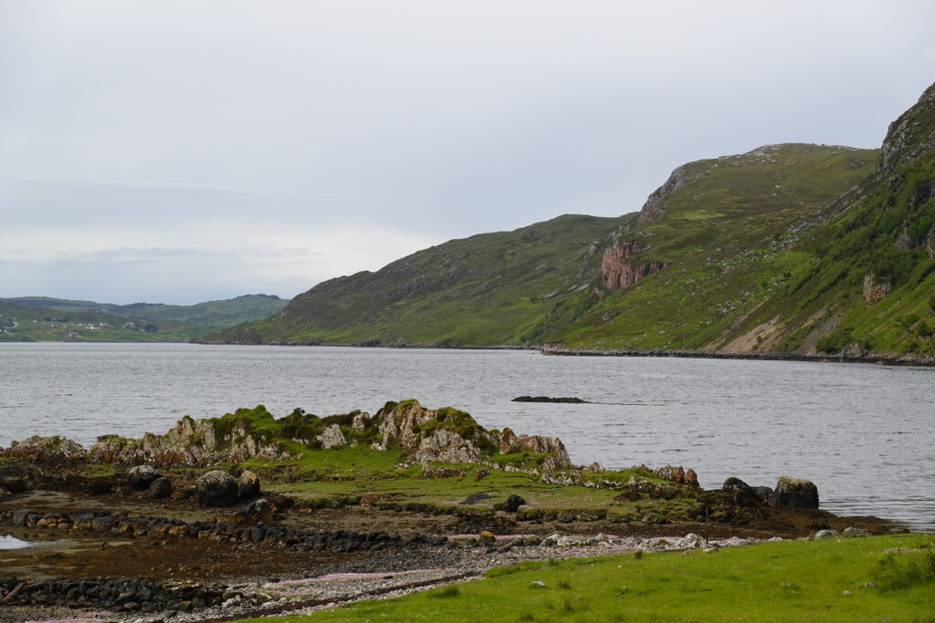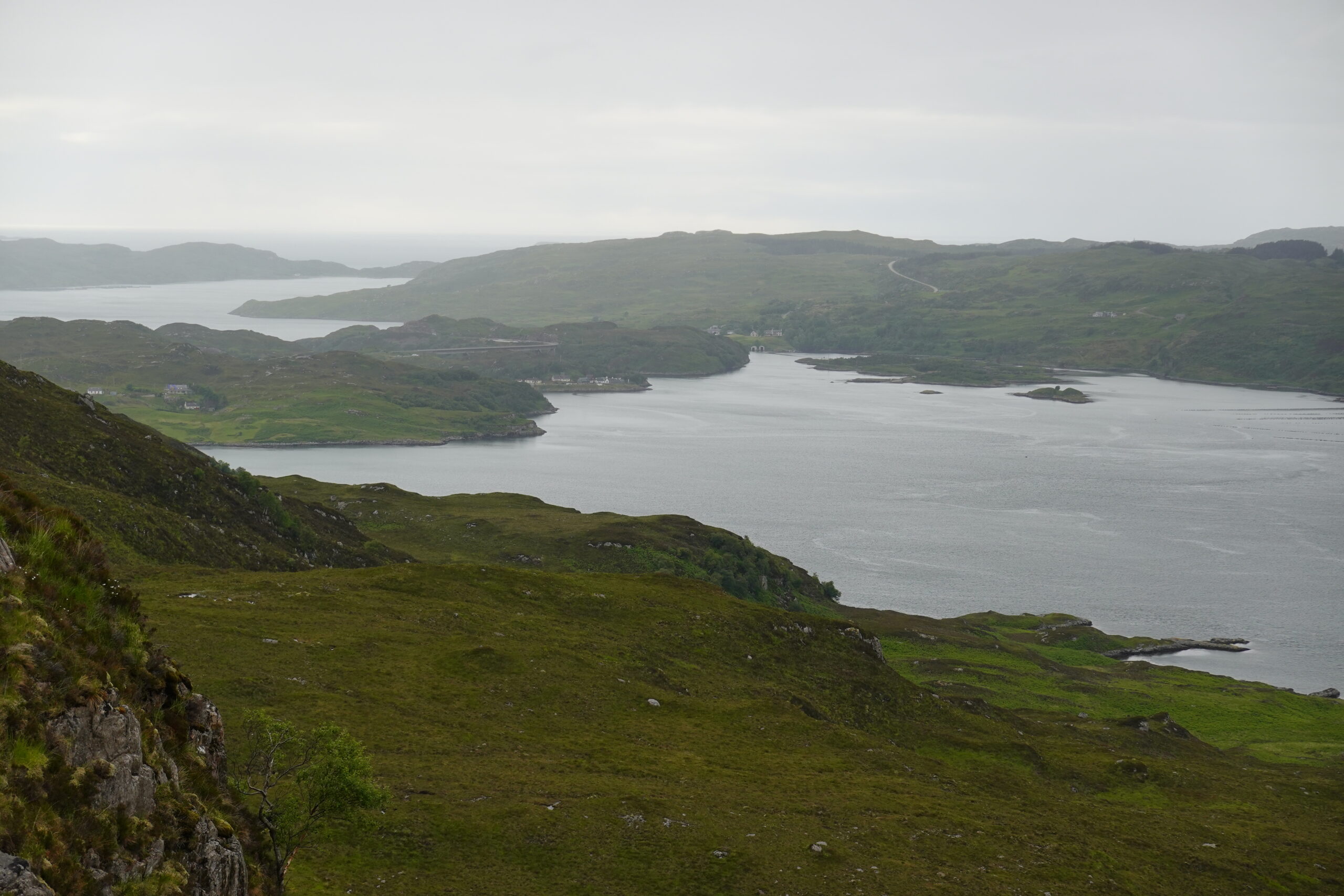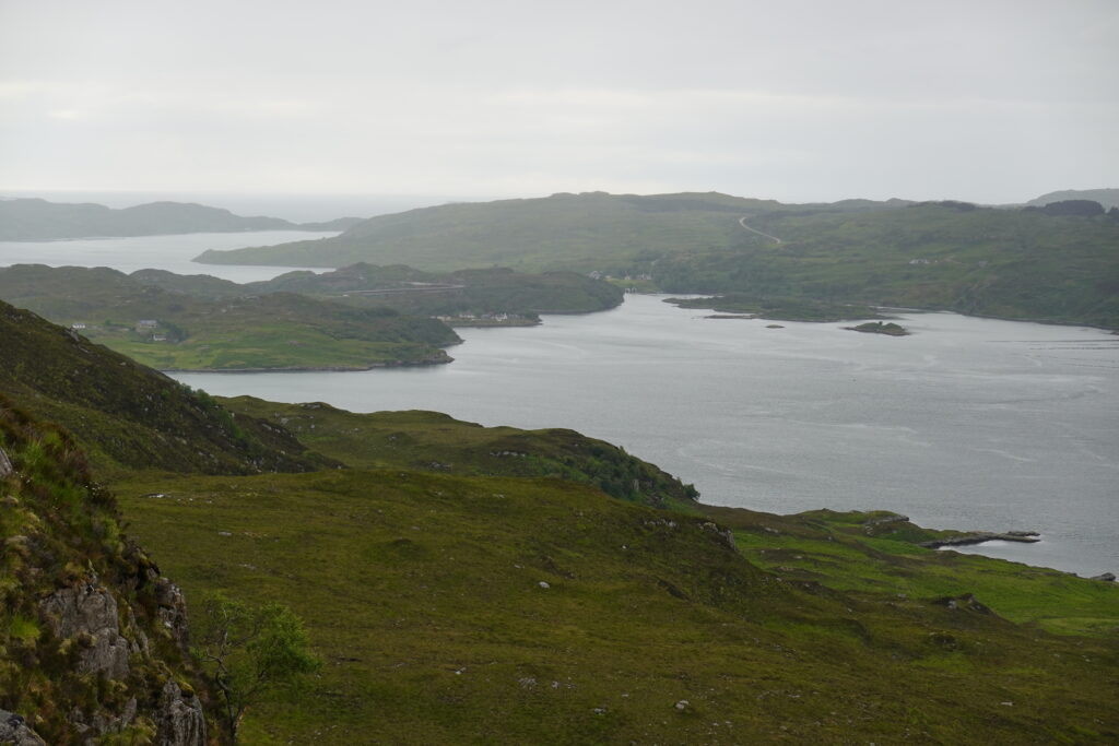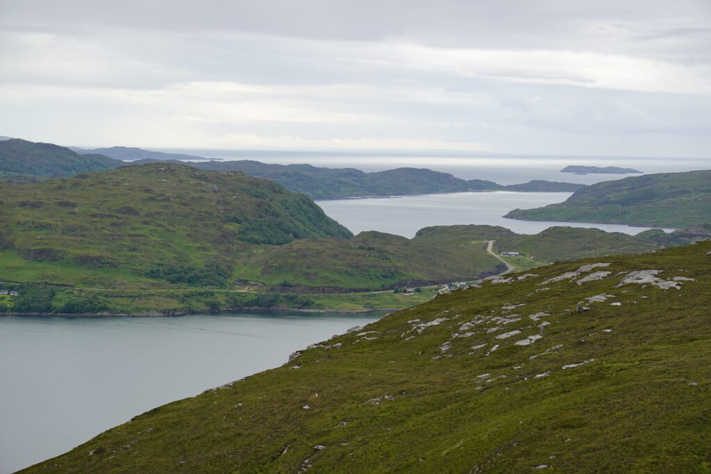 Devant nous, les vues sont tout aussi magiques. On peut voir le pont de Kylesku (sur lequel on a roulé en 2016), la mer et même l’île de Lewis tout au fond, wahou!