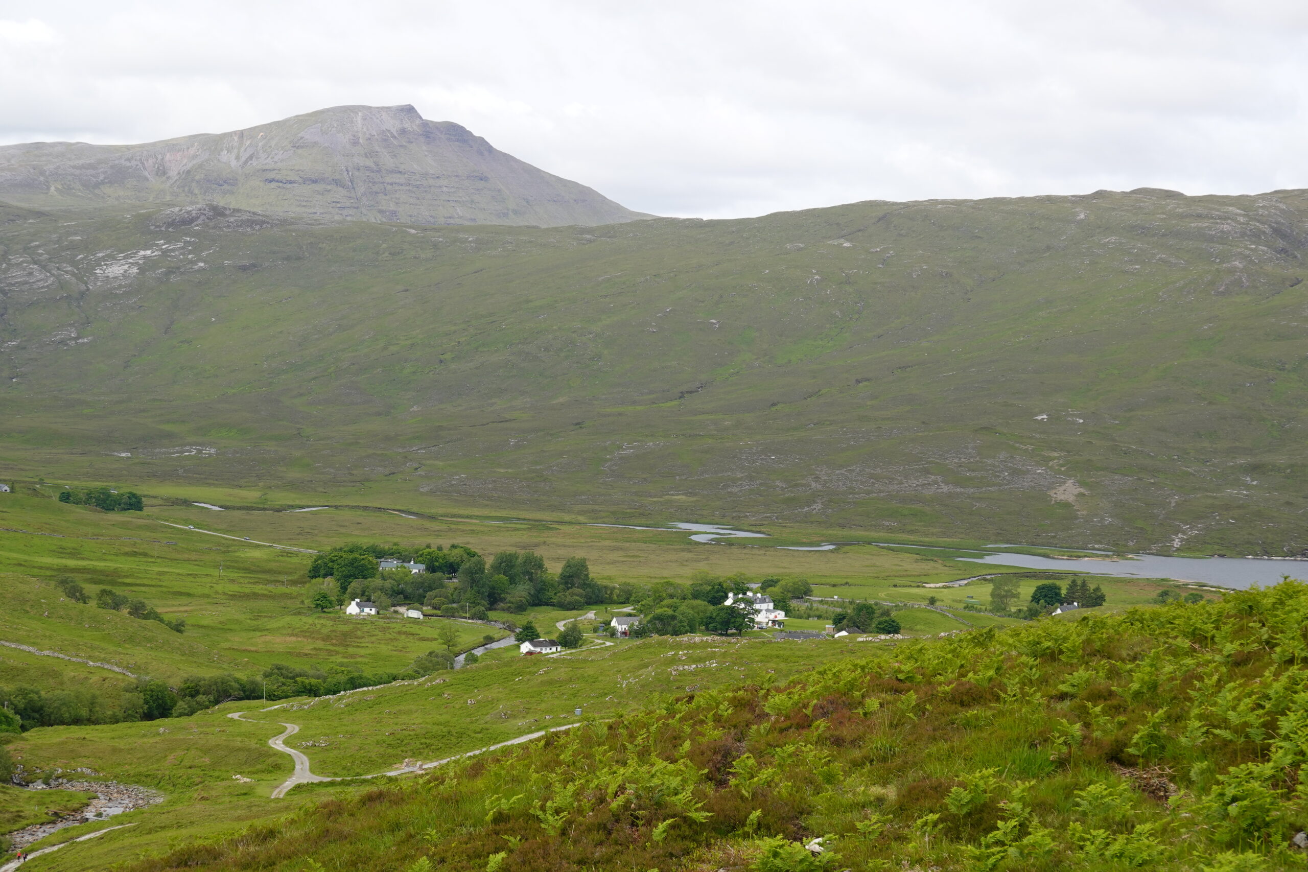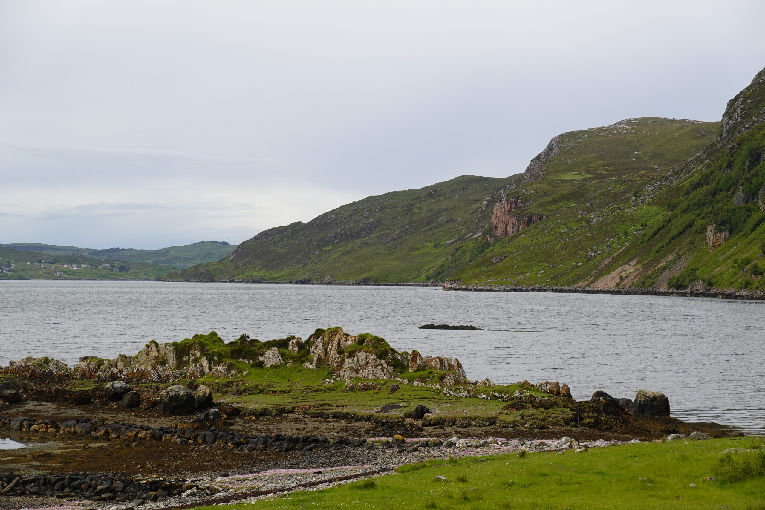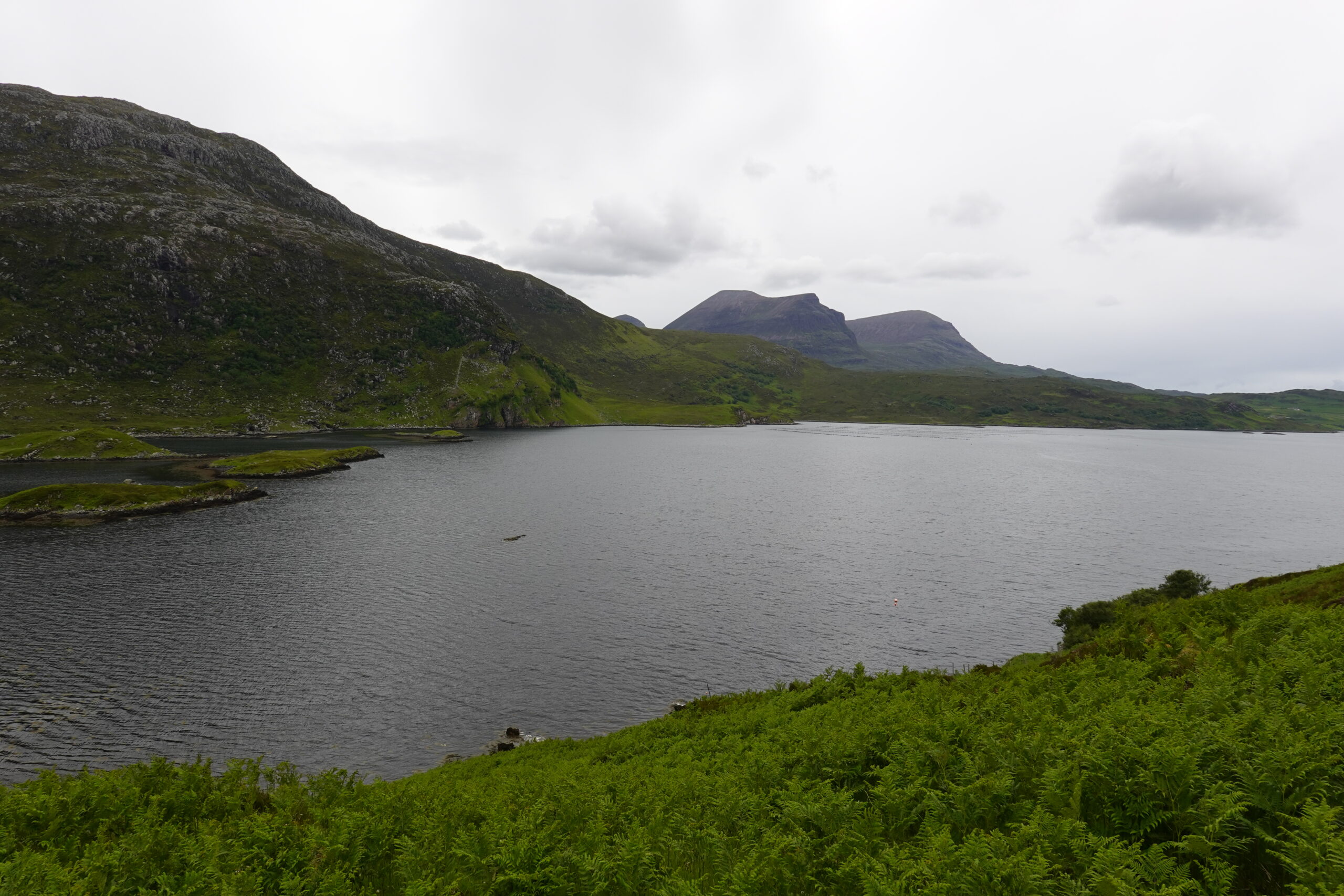 Devant nous, les vues sont tout aussi magiques. On peut voir le pont de Kylesku (sur lequel on a roulé en 2016), la mer et même l’île de Lewis tout au fond, wahou!
