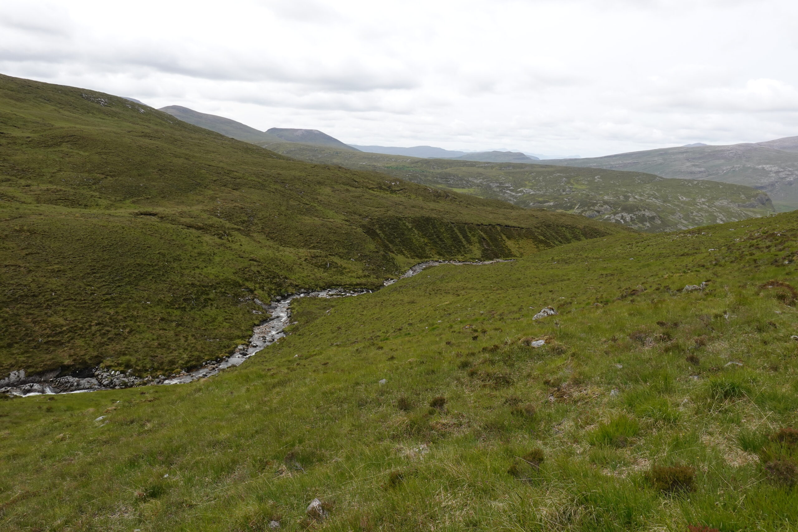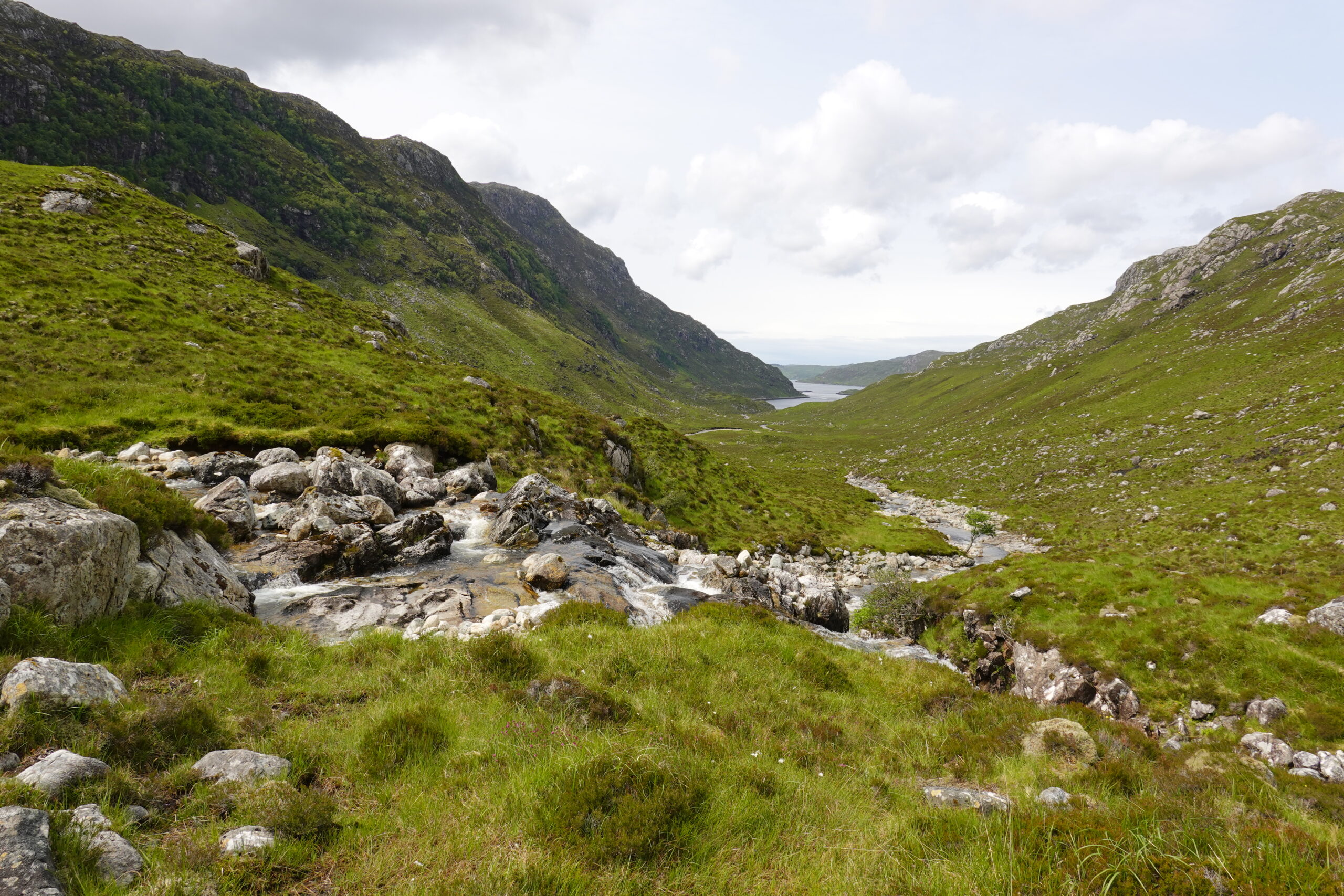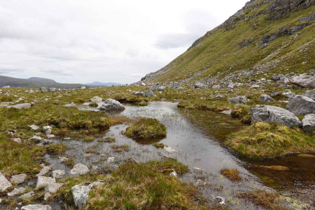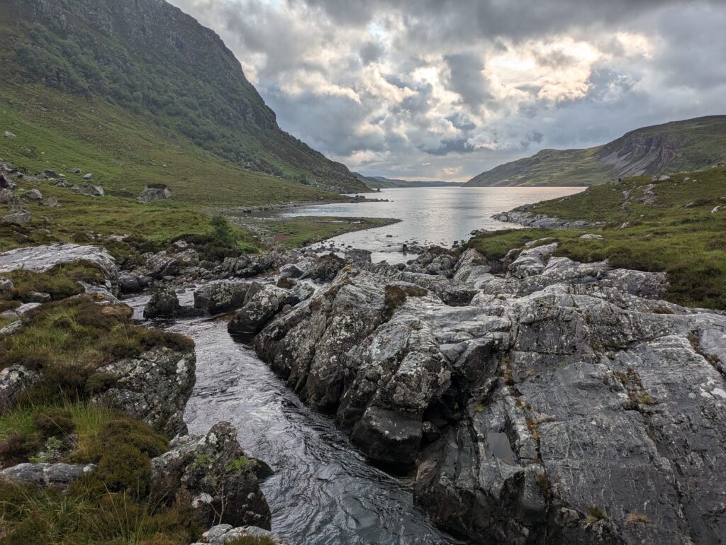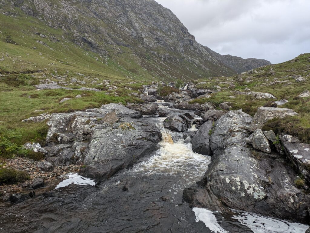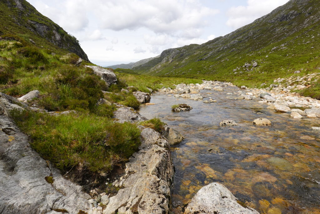 On traverse une rivière, Abhainn an Loch Bhig. Le sentier est de plus en plus boggy et non-existant, mais c’est si beau.