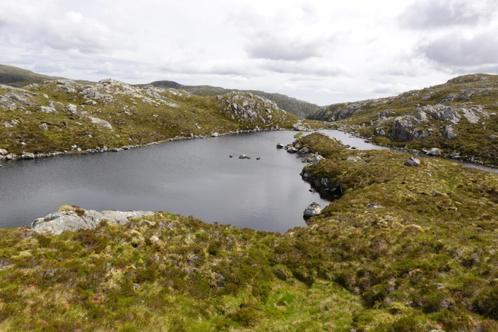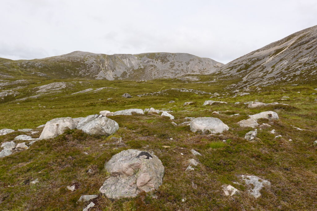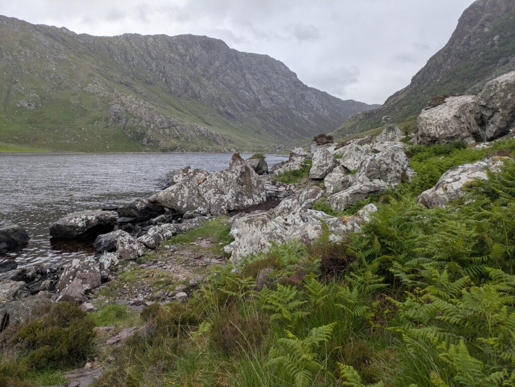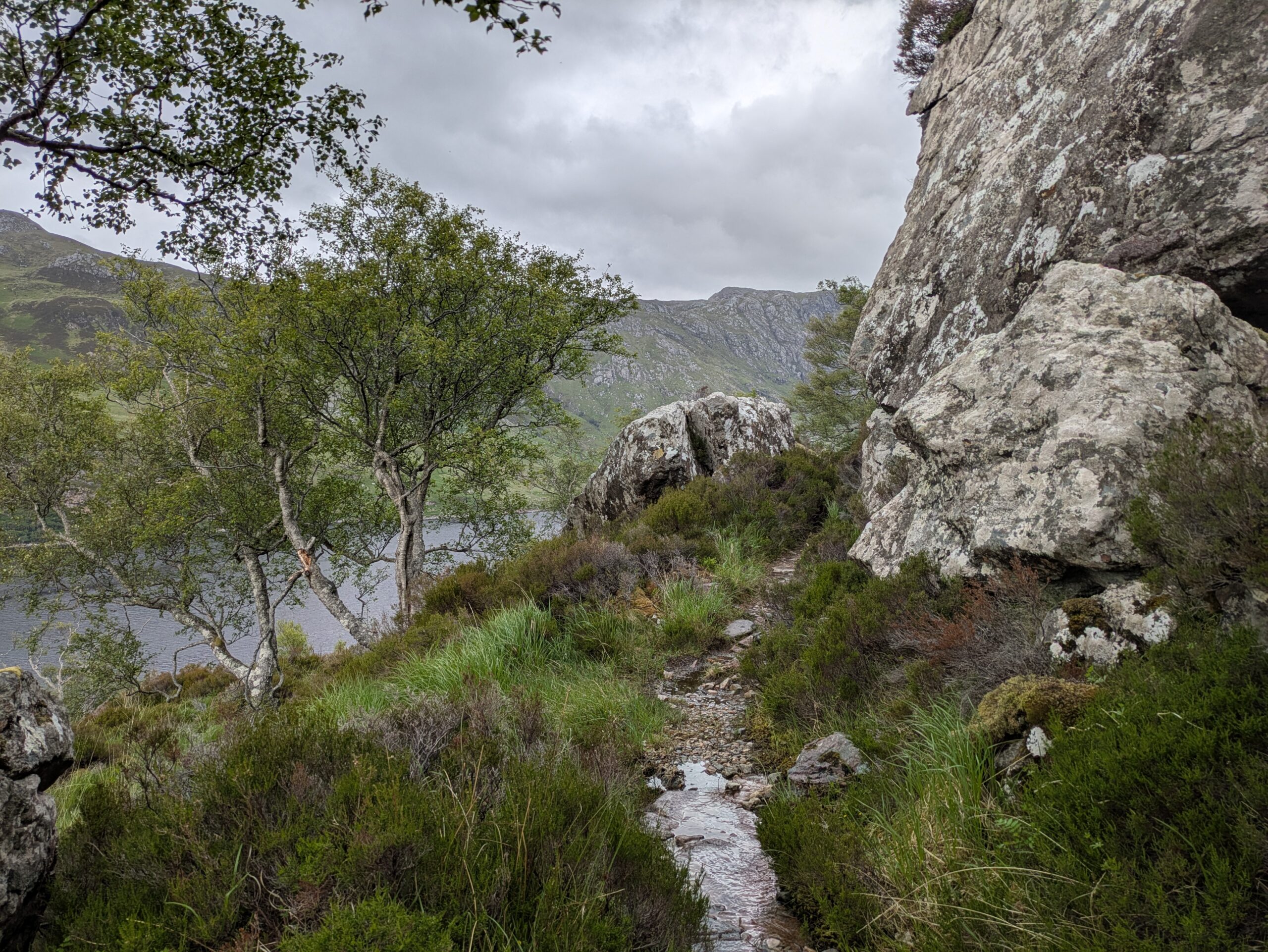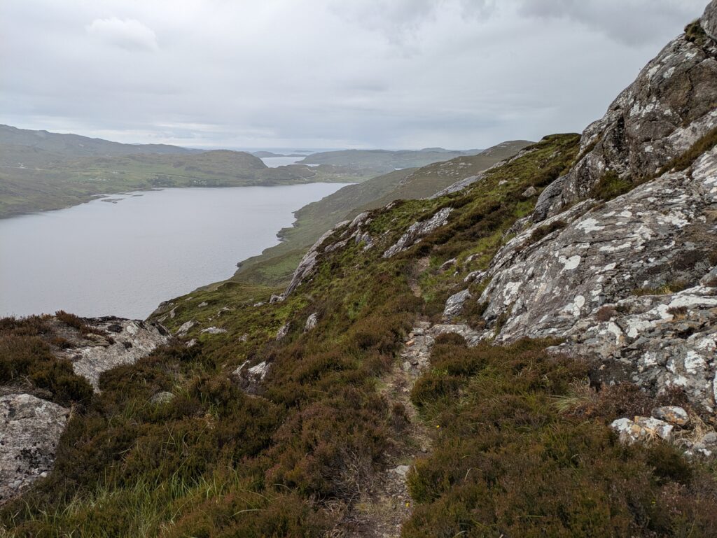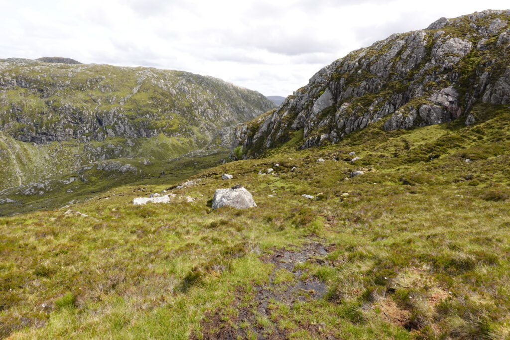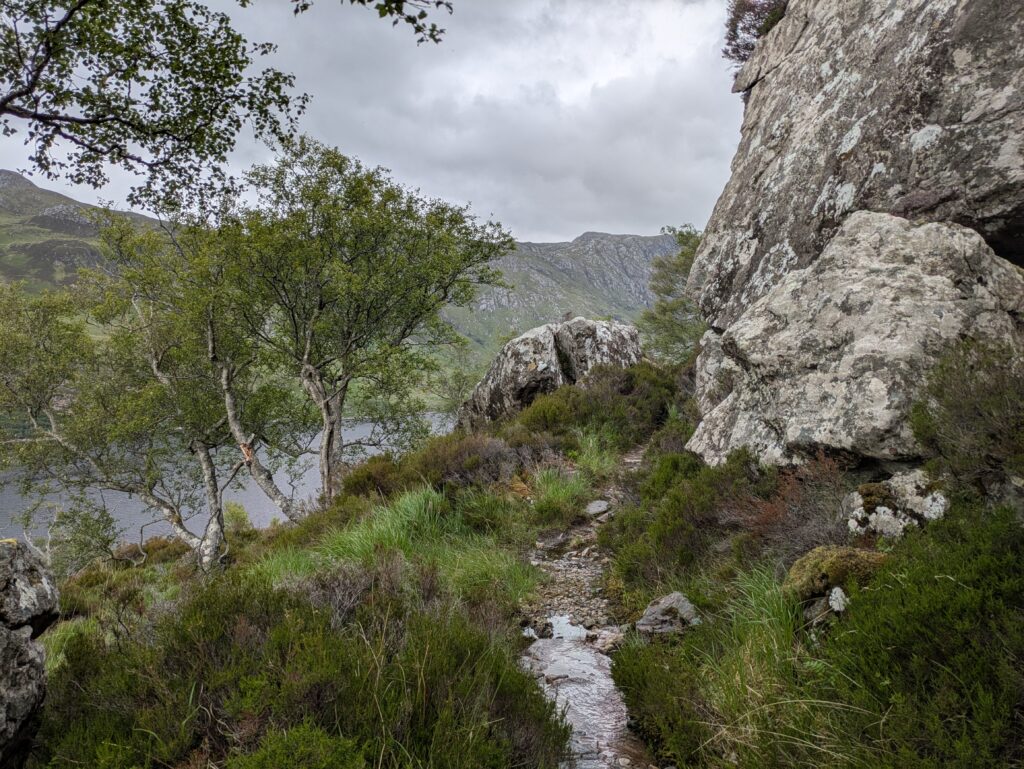 Il pleut par intermittence mais la visibilité est bonne, et la lumière douce. On commence la descente vers Loch Glendhu, sur un sentier boggy et un peu accidenté — il y a d’impressionnants rochers!
