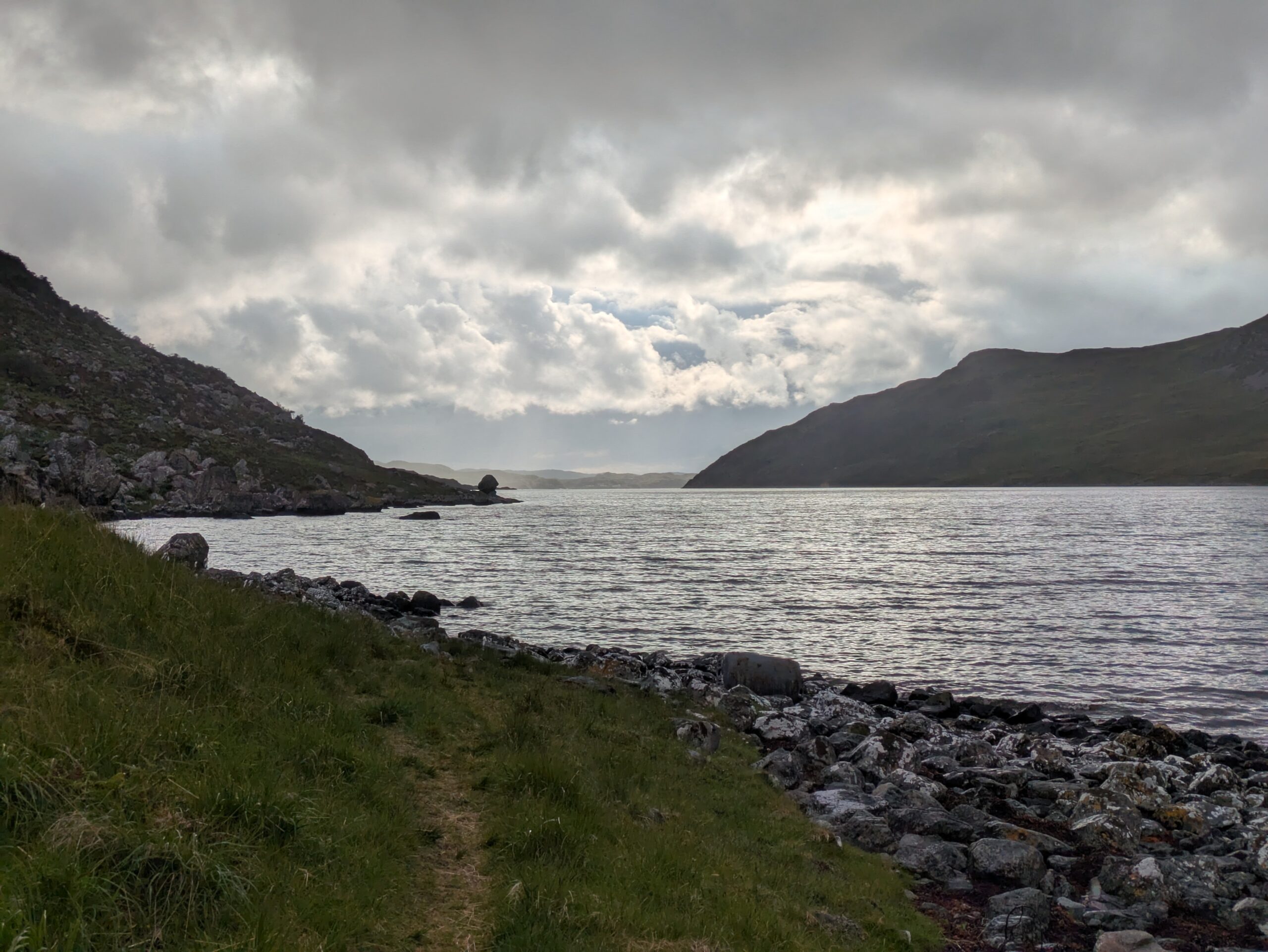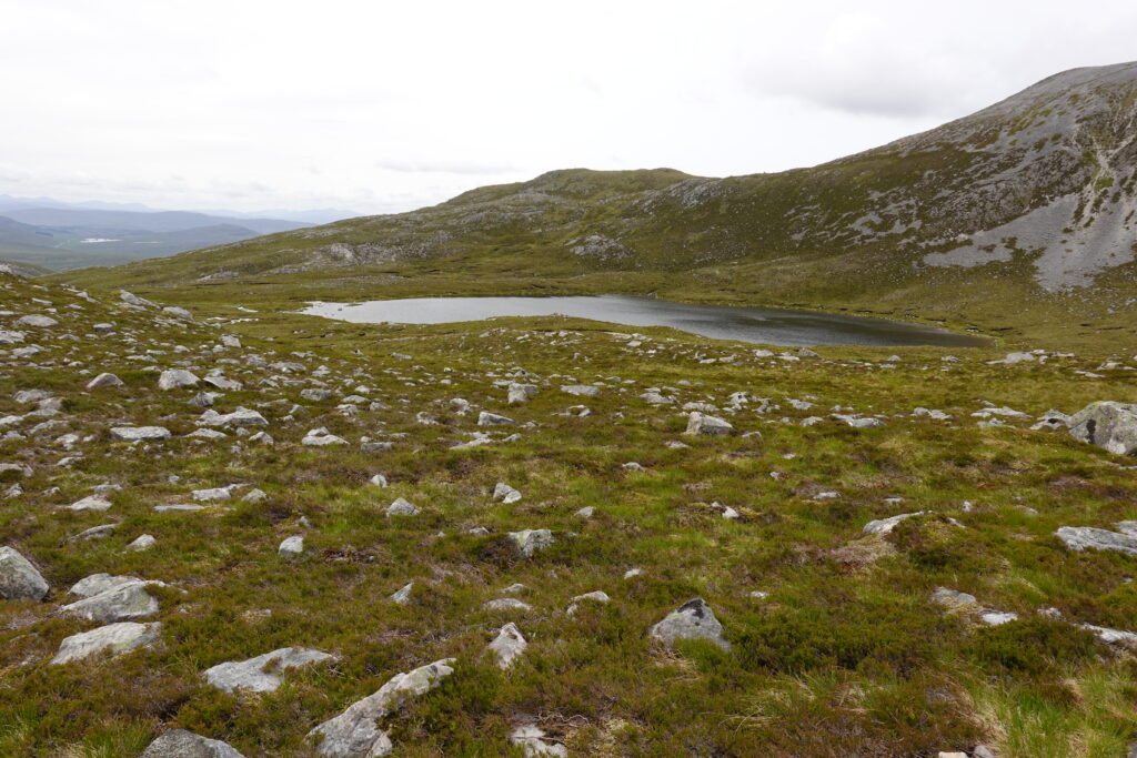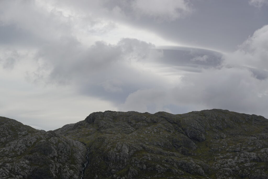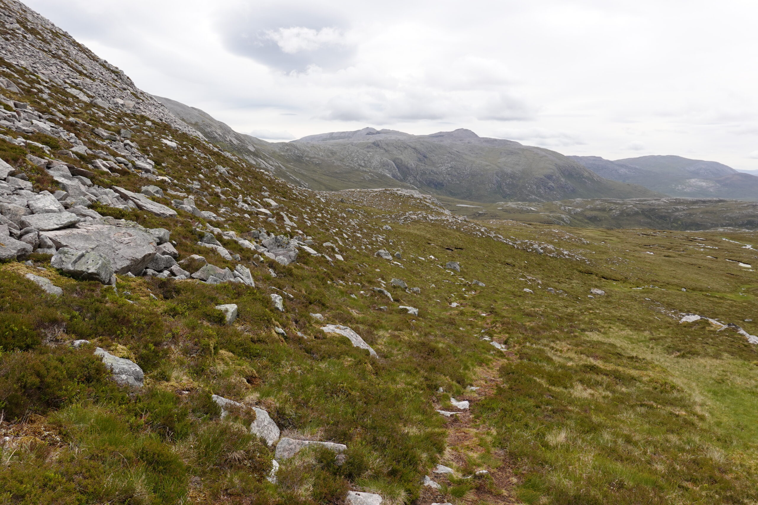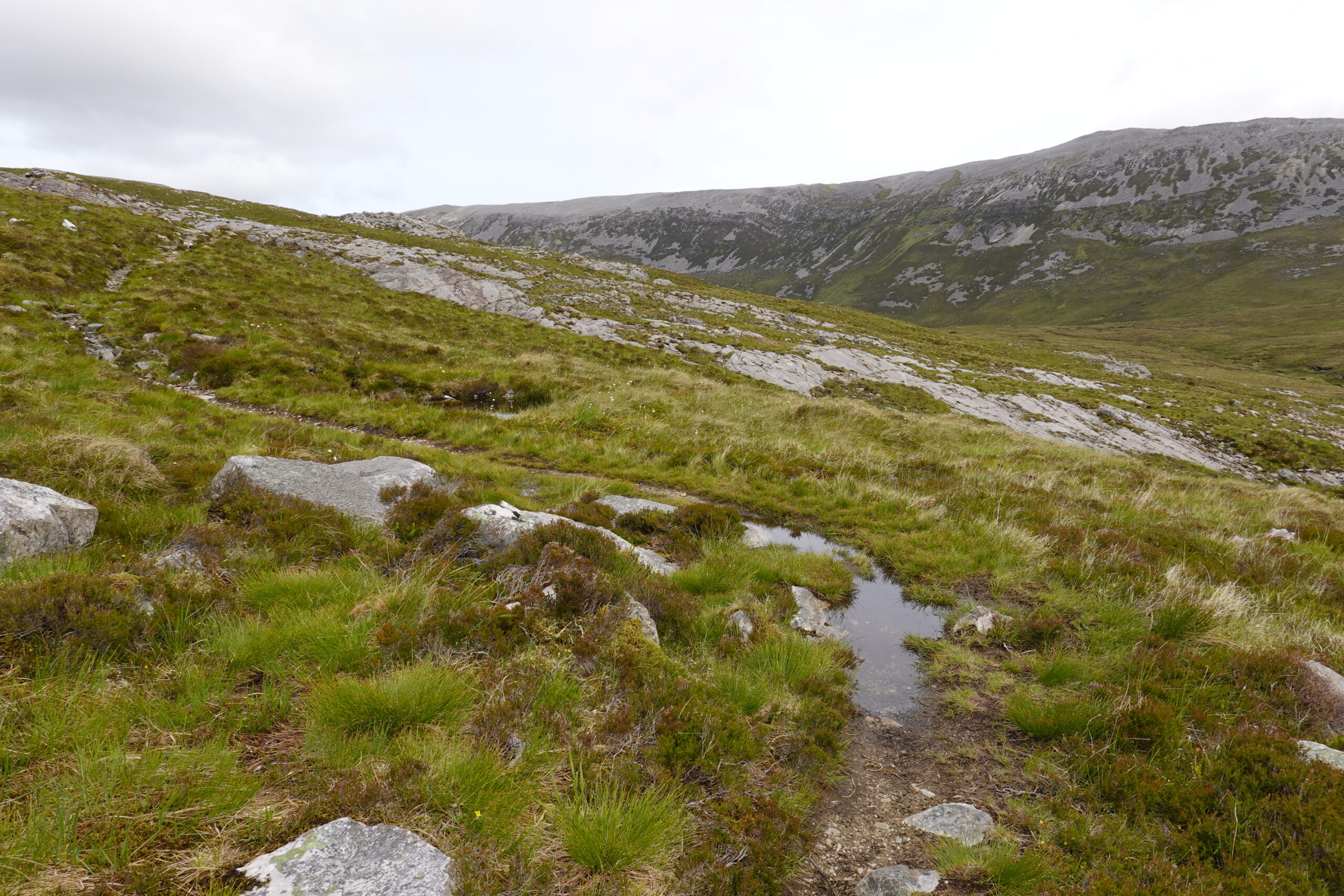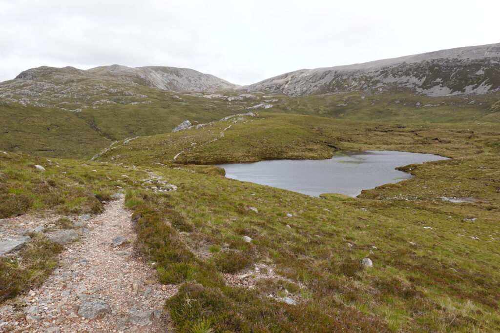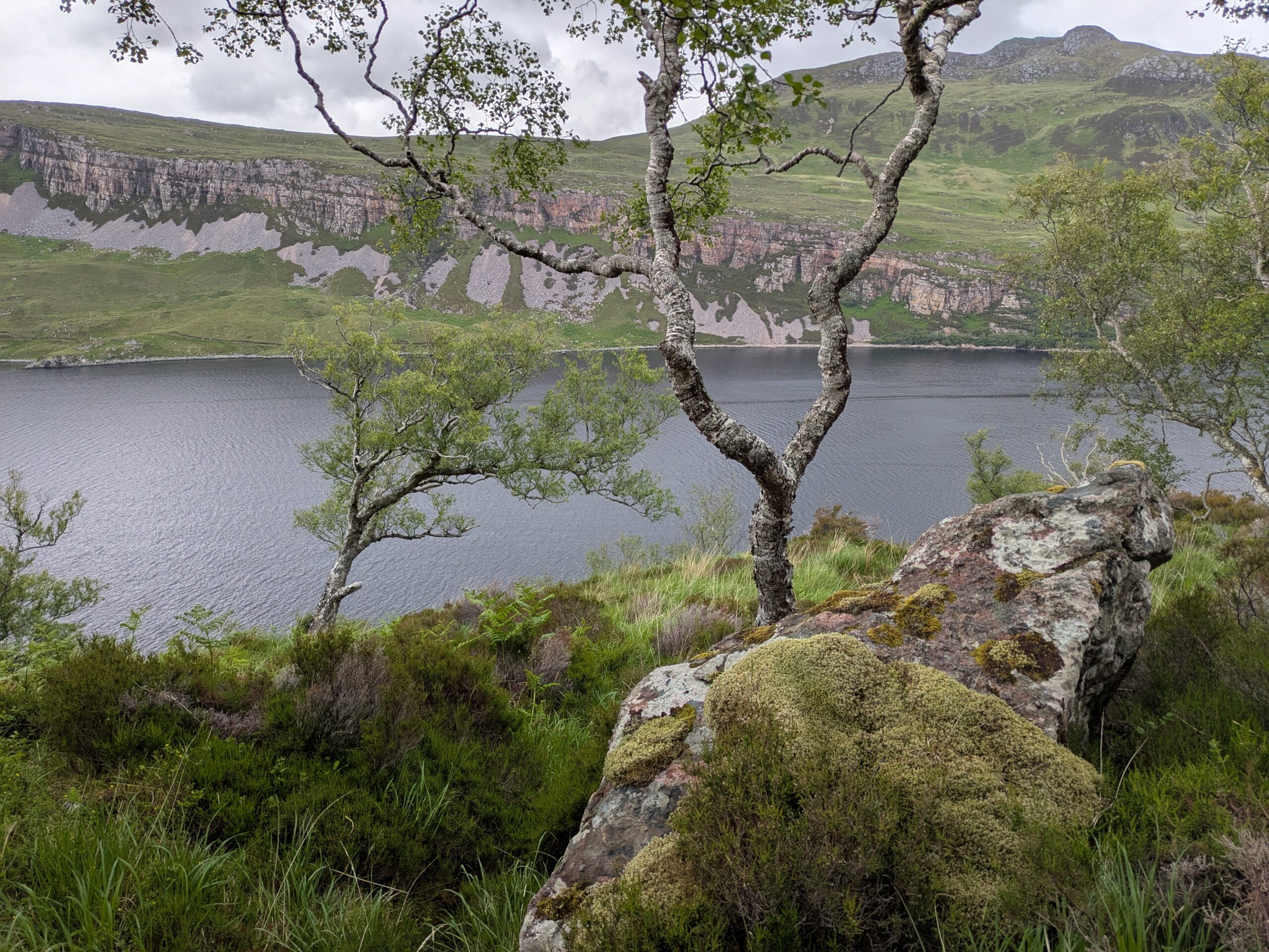 Il pleut par intermittence mais la visibilité est bonne, et la lumière douce. On commence la descente vers Loch Glendhu, sur un sentier boggy et un peu accidenté — il y a d’impressionnants rochers!
