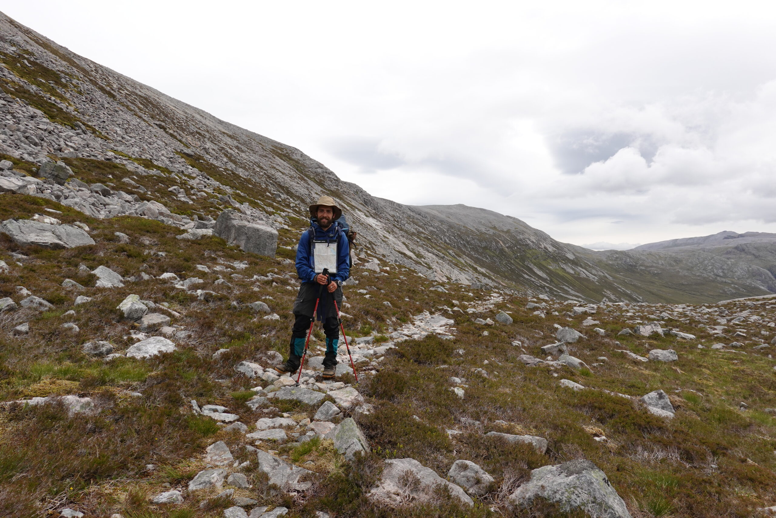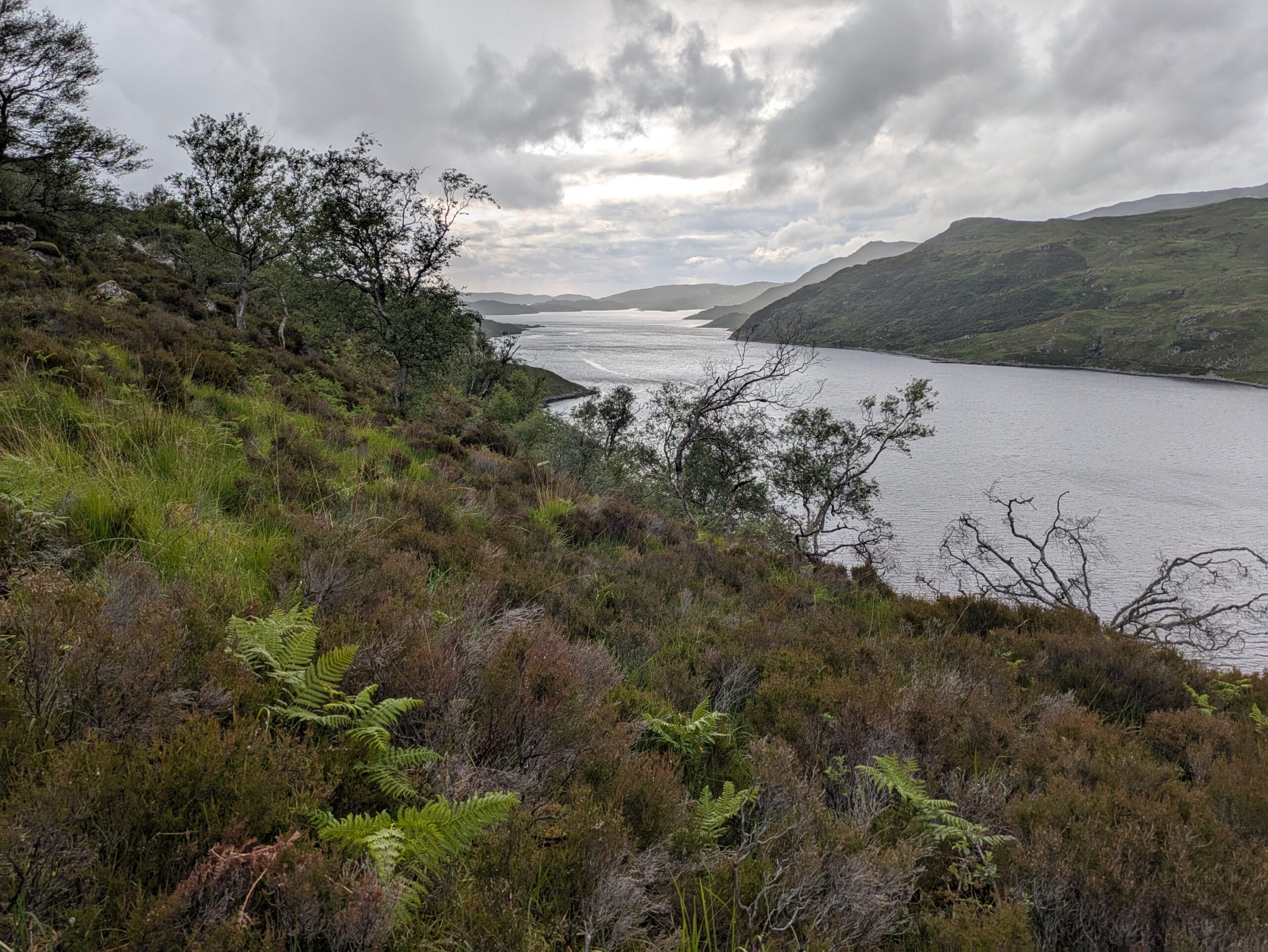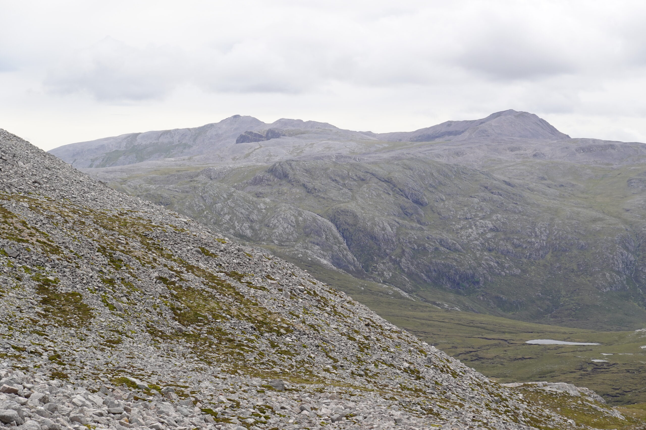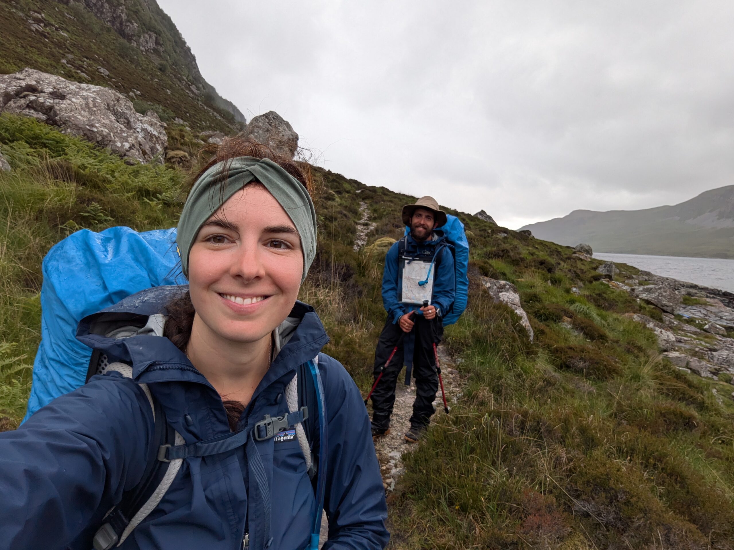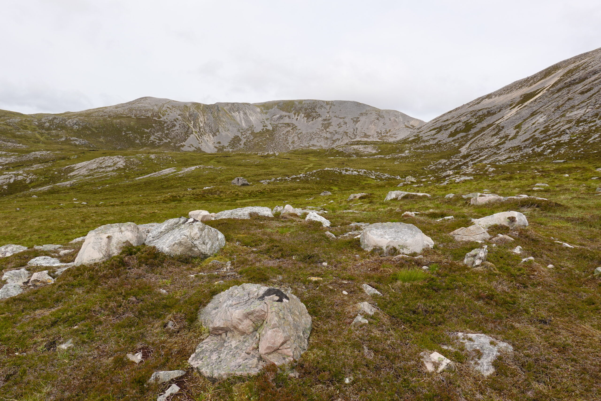 Il pleut par intermittence mais la visibilité est bonne, et la lumière douce. On commence la descente vers Loch Glendhu, sur un sentier boggy et un peu accidenté — il y a d’impressionnants rochers!