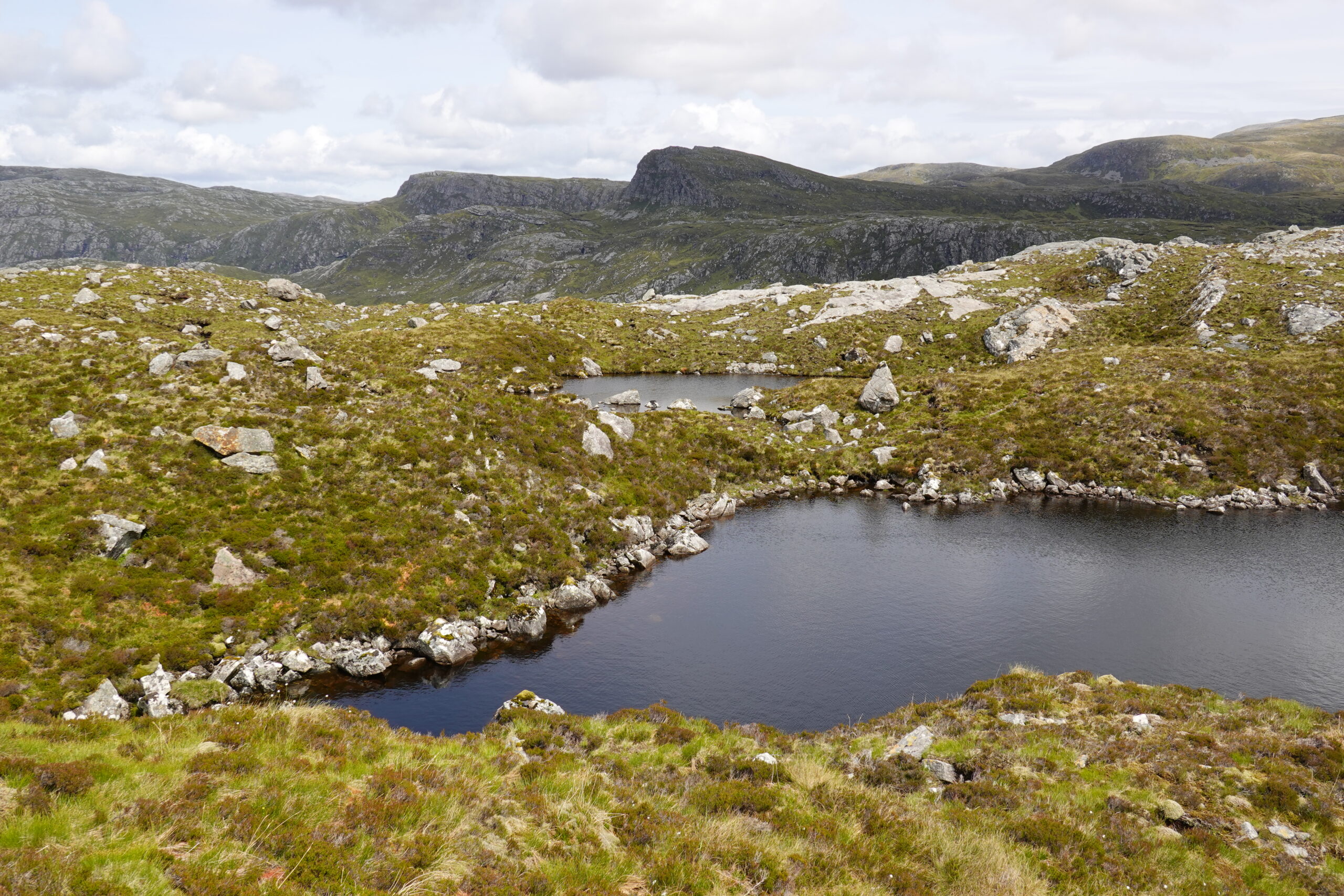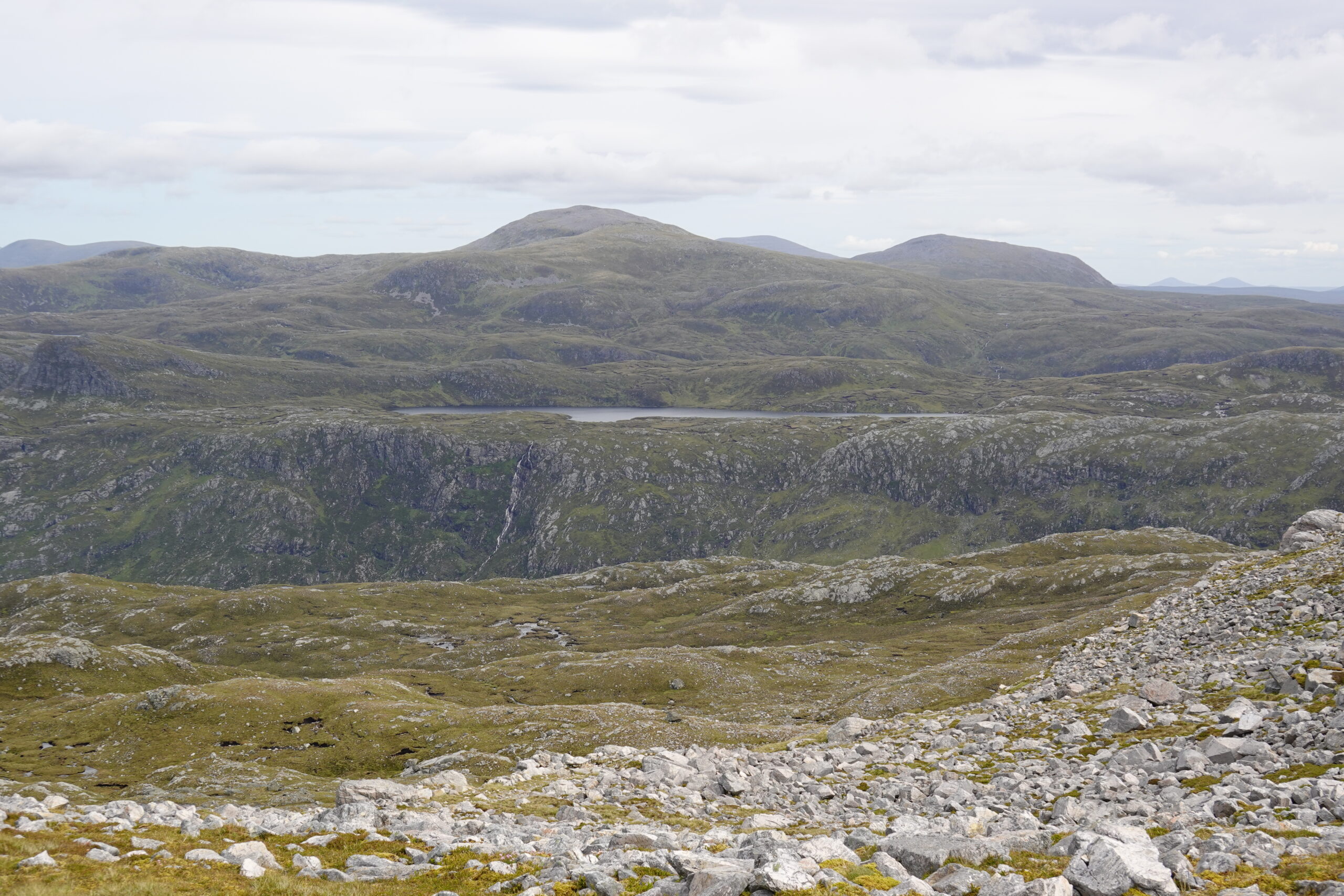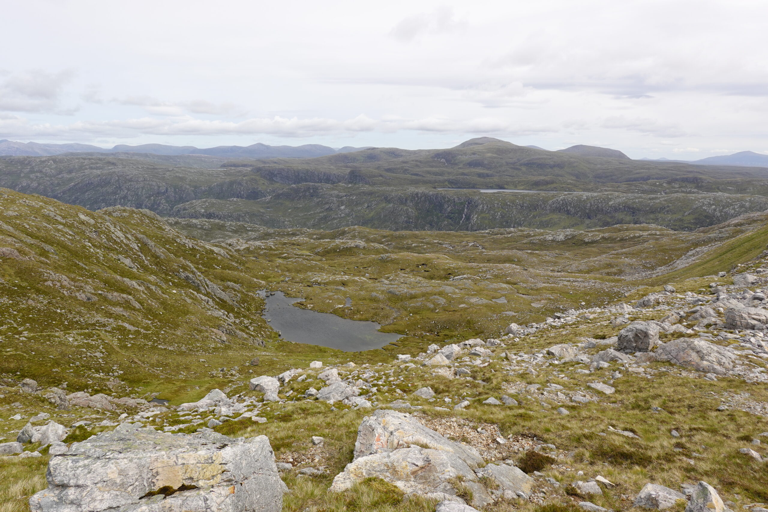De l’autre côté du col, c’est encore plus beau, avec une cascade tombant de Loch nan Caorach, de gros rochers et plein de petits lochans partout.