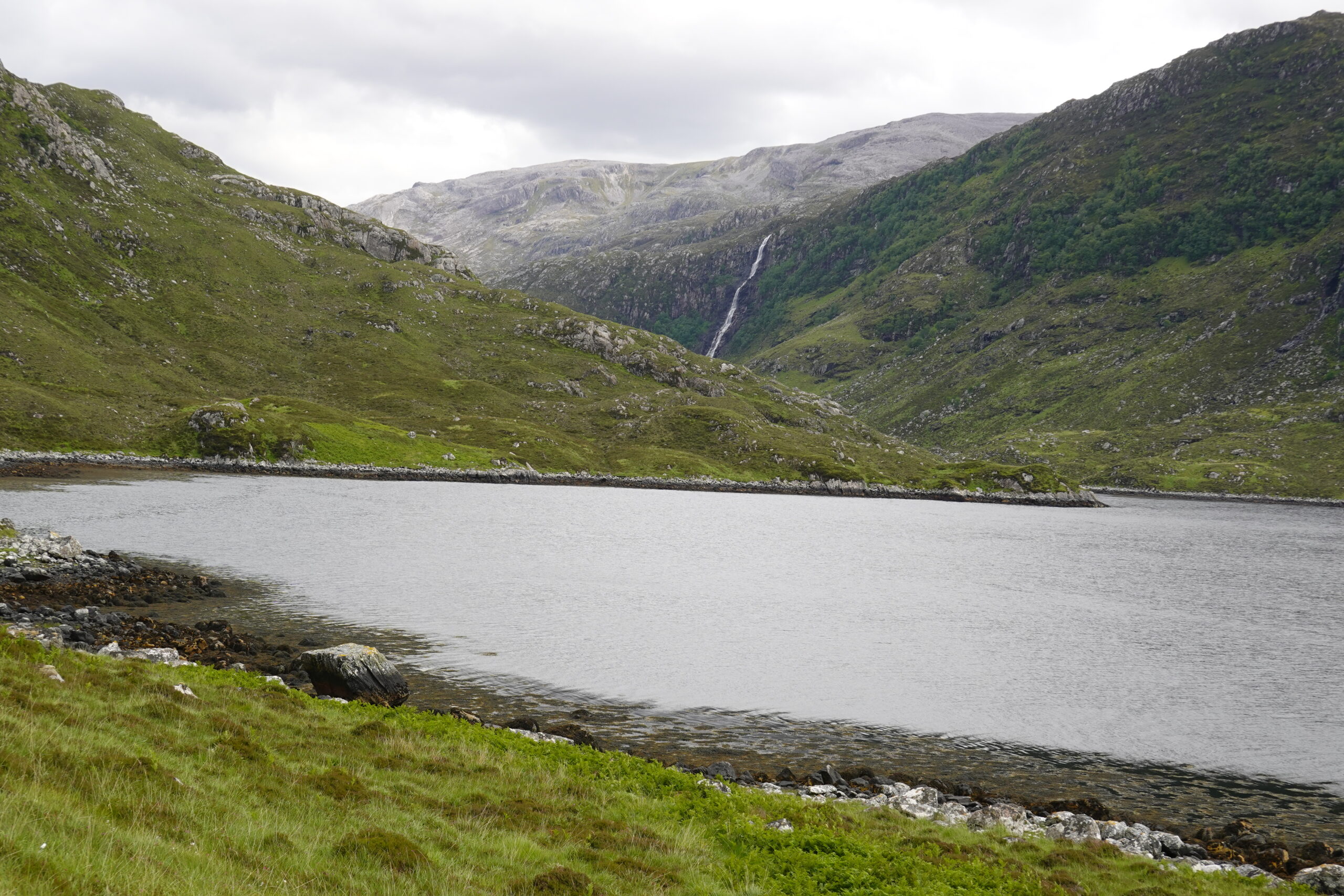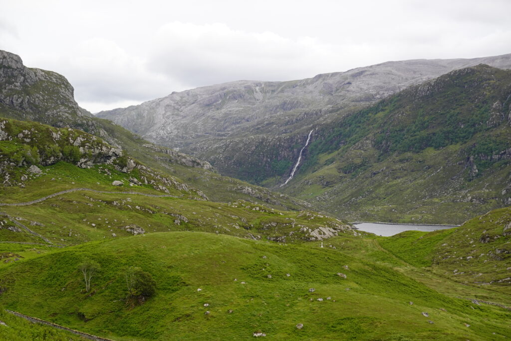 Loch Glencoul apparaît devant nous, magnifique, et on admire la vue sur la cascade Eas a’ Chùal Aluinn, impressionnante.