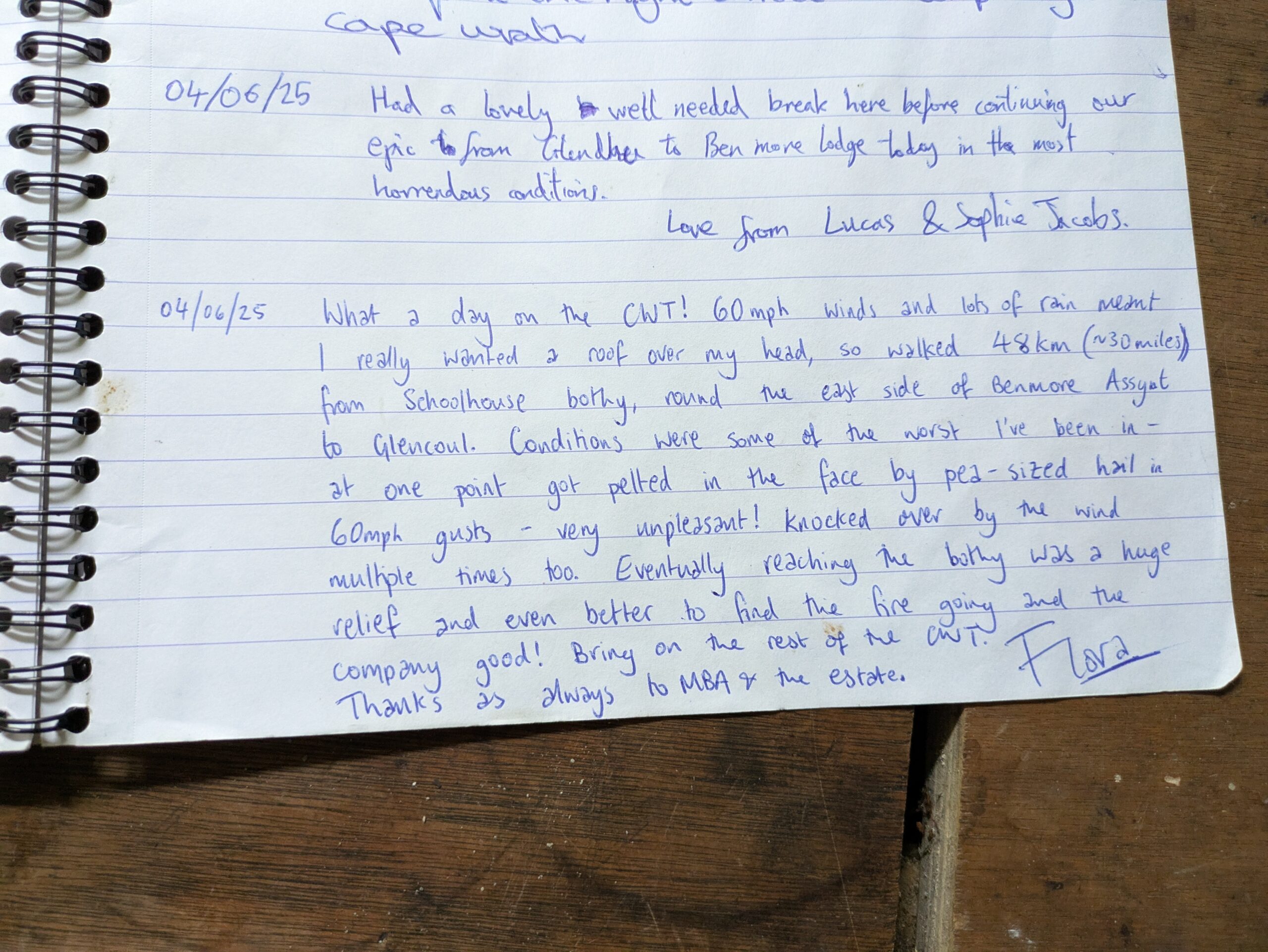 Dans le bothy book, on a pu lire la suite des péripéties de Flora, qui avait, elle, pris l’alternative par l’est de Ben More Assynt. Elle s’est infligé une journée de 48 km dans le vent et la grêle! :0