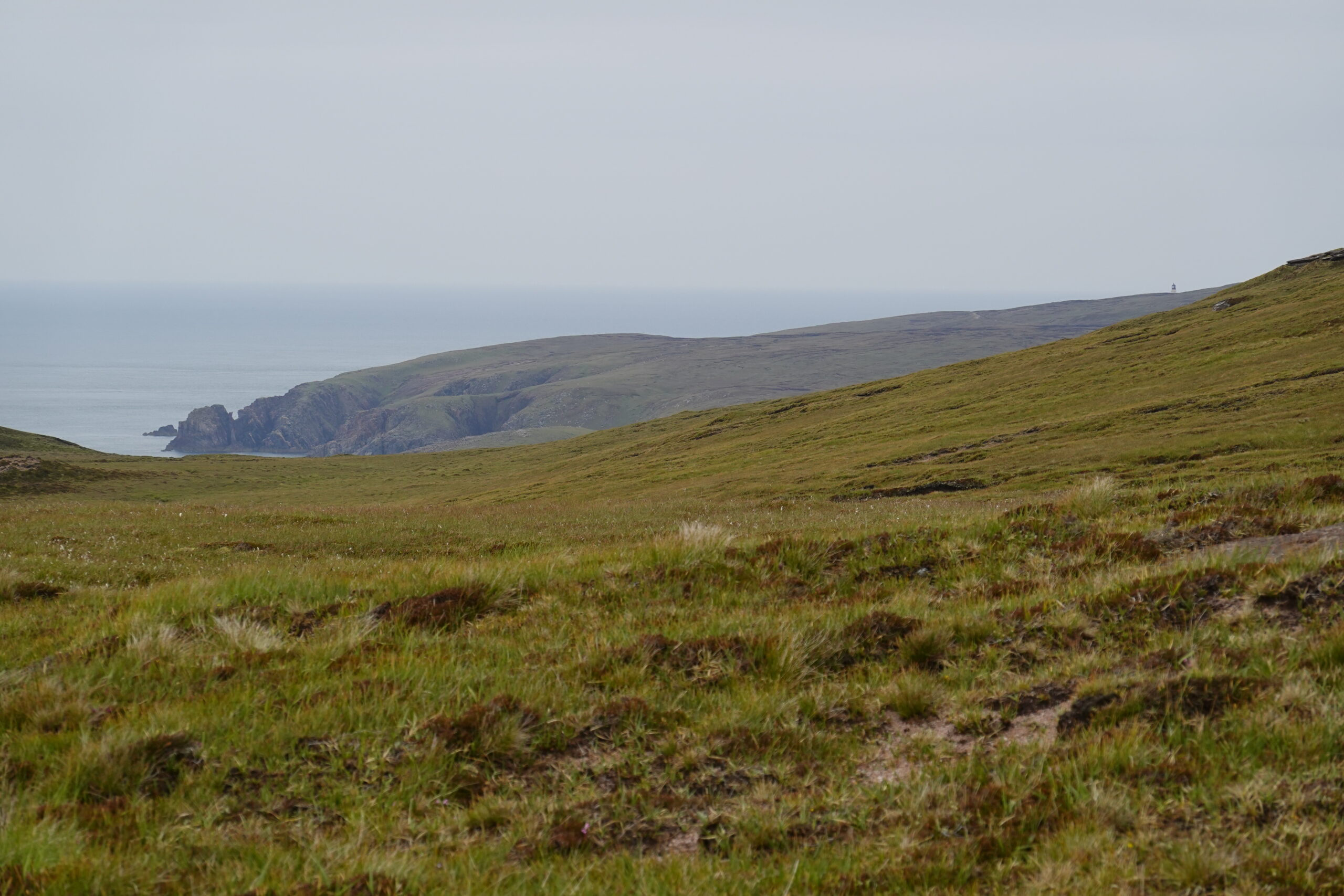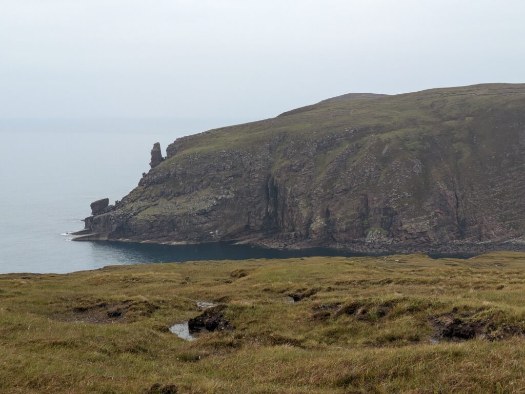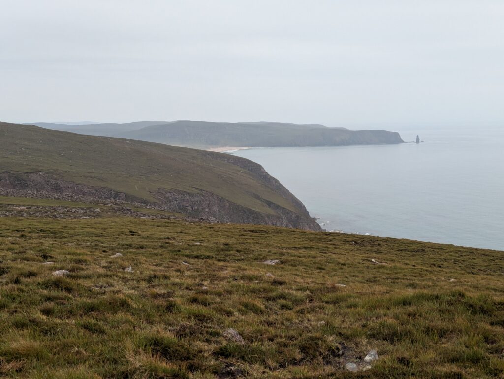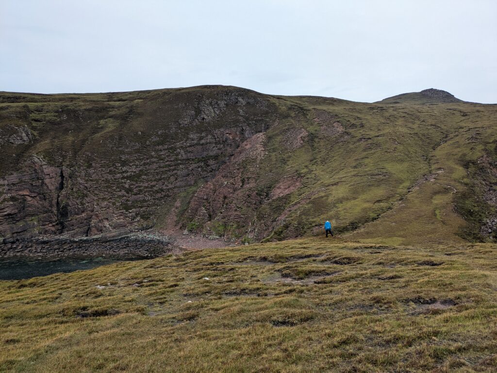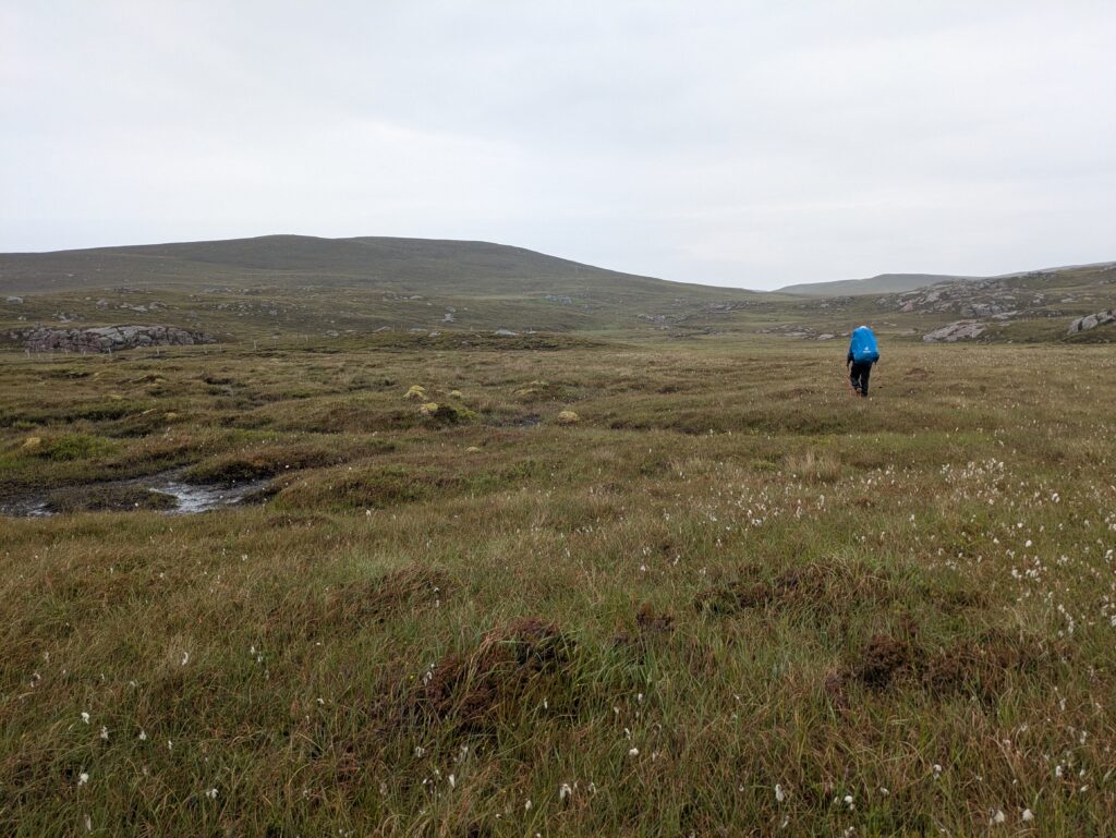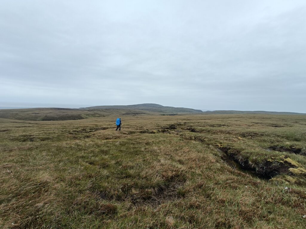 Bref, on attaque les 12 km qui nous séparent de Cape Wrath, le tout sans sentier, à travers la tourbière. On prend l’option côtière, plus difficile (car avec plus de dénivelé) mais bien plus motivante, avec des vues régulières sur les falaises et le phare au loin.