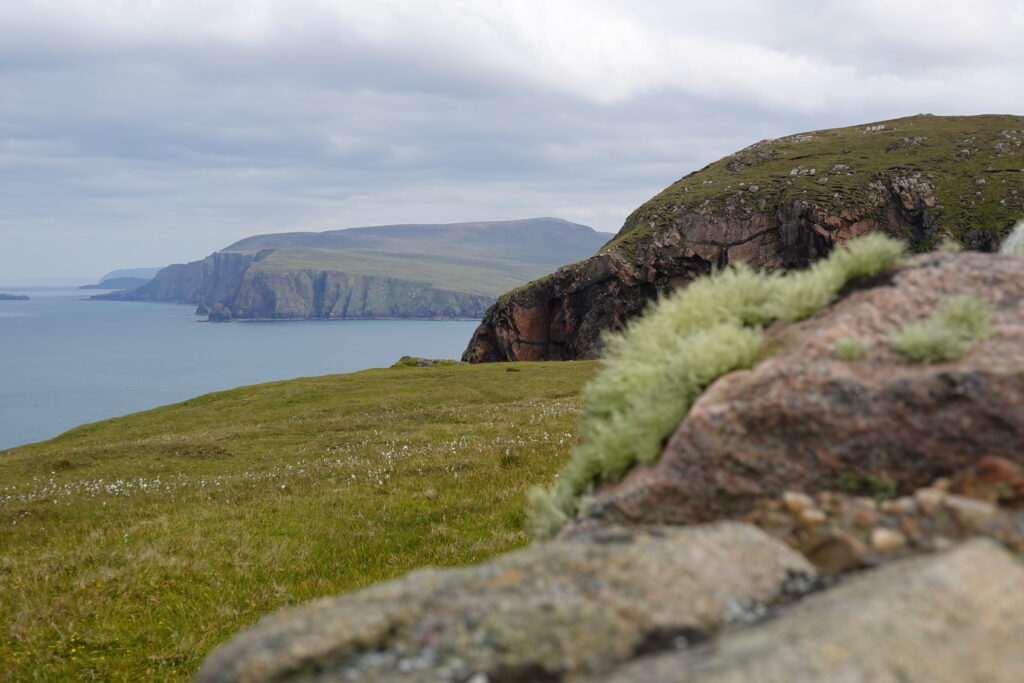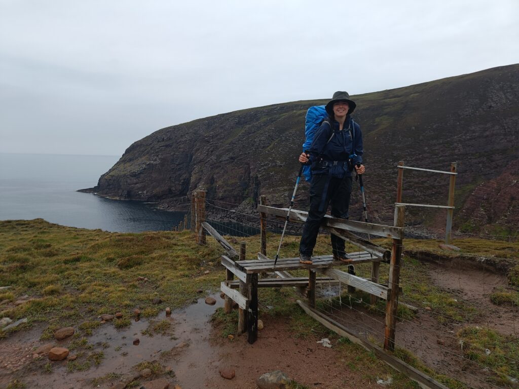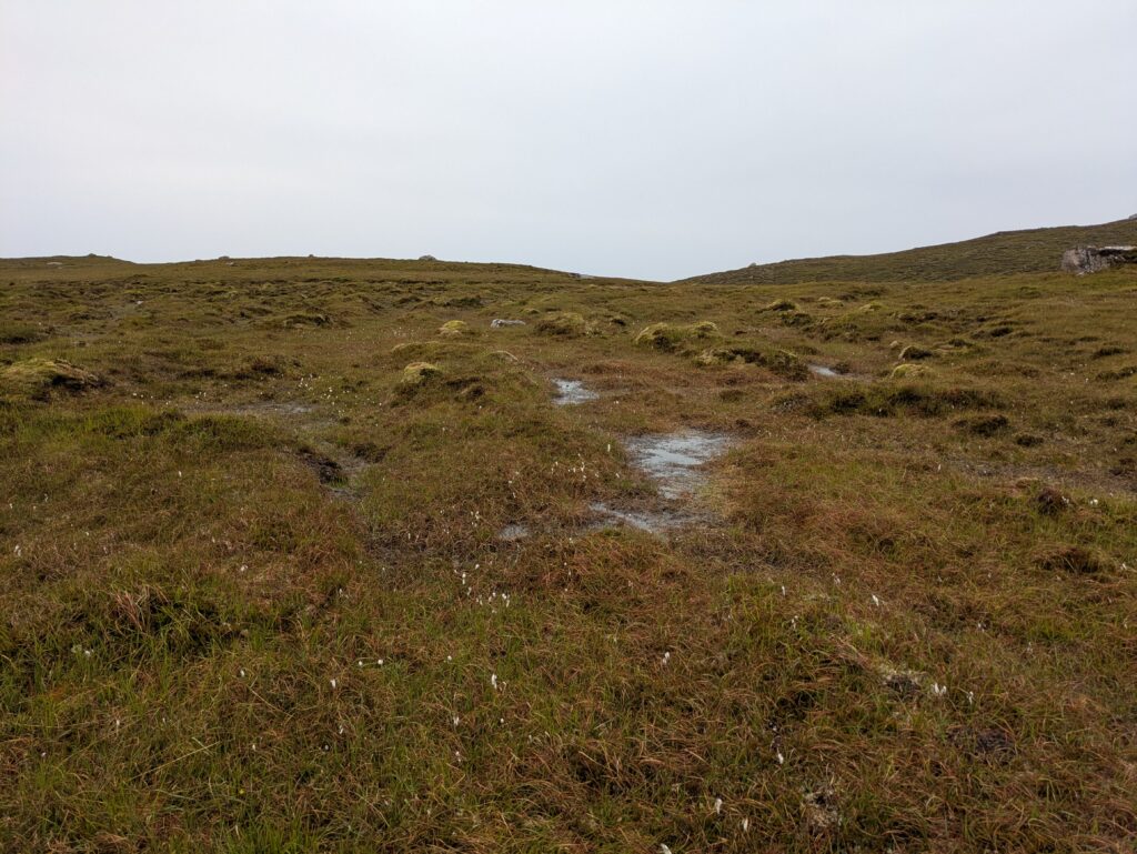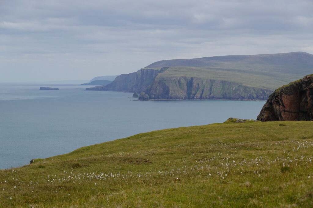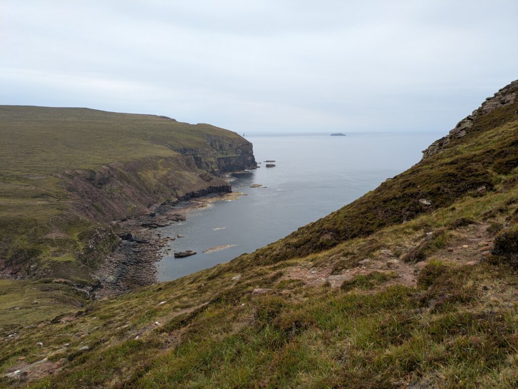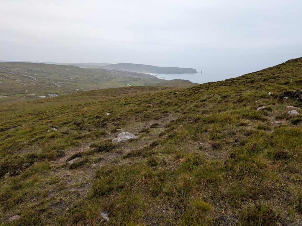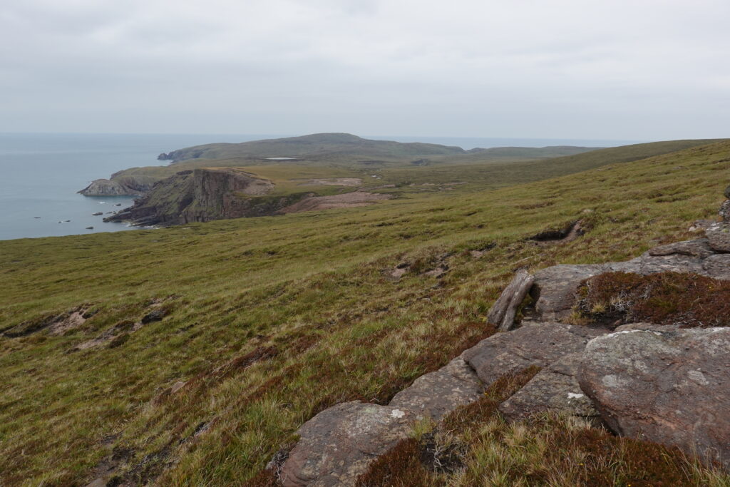 Bref, on attaque les 12 km qui nous séparent de Cape Wrath, le tout sans sentier, à travers la tourbière. On prend l’option côtière, plus difficile (car avec plus de dénivelé) mais bien plus motivante, avec des vues régulières sur les falaises et le phare au loin.