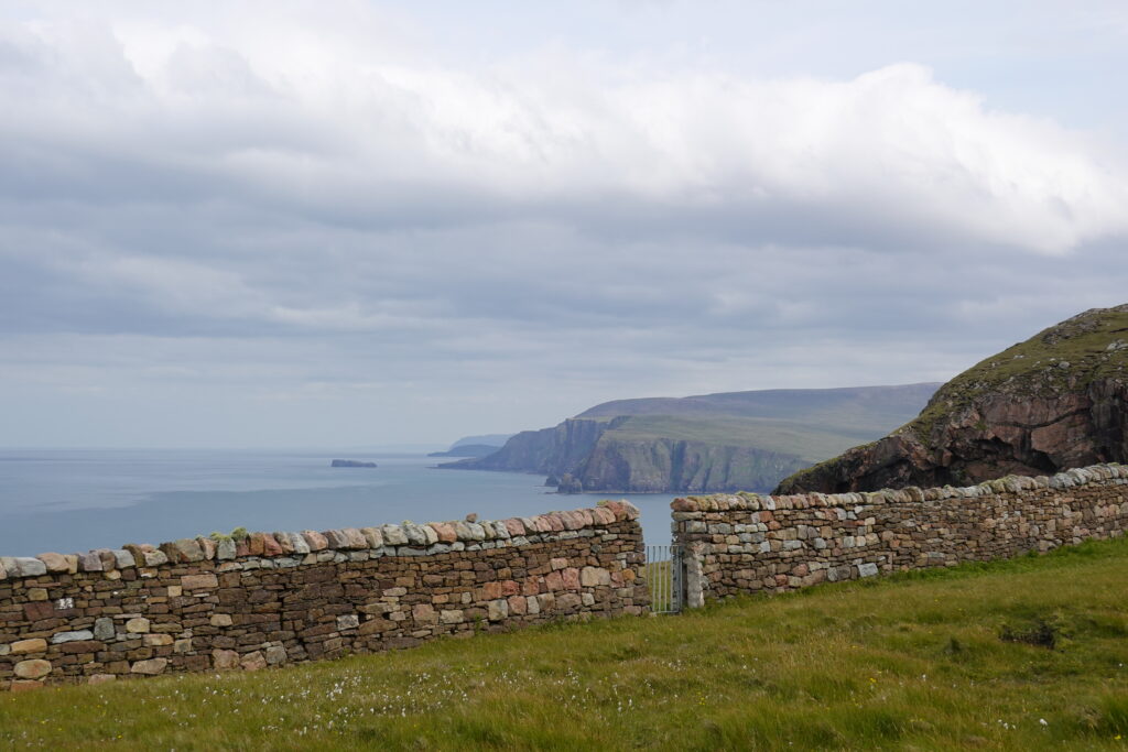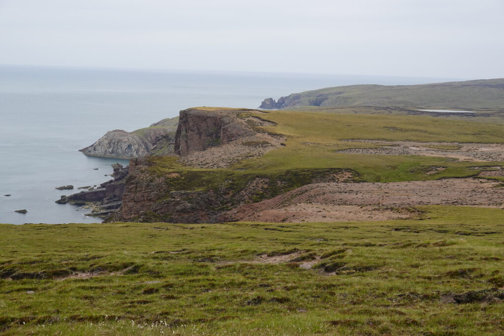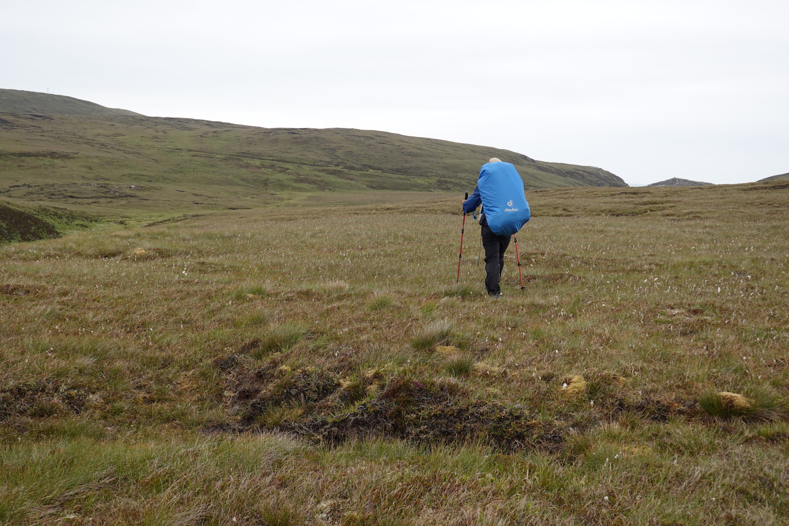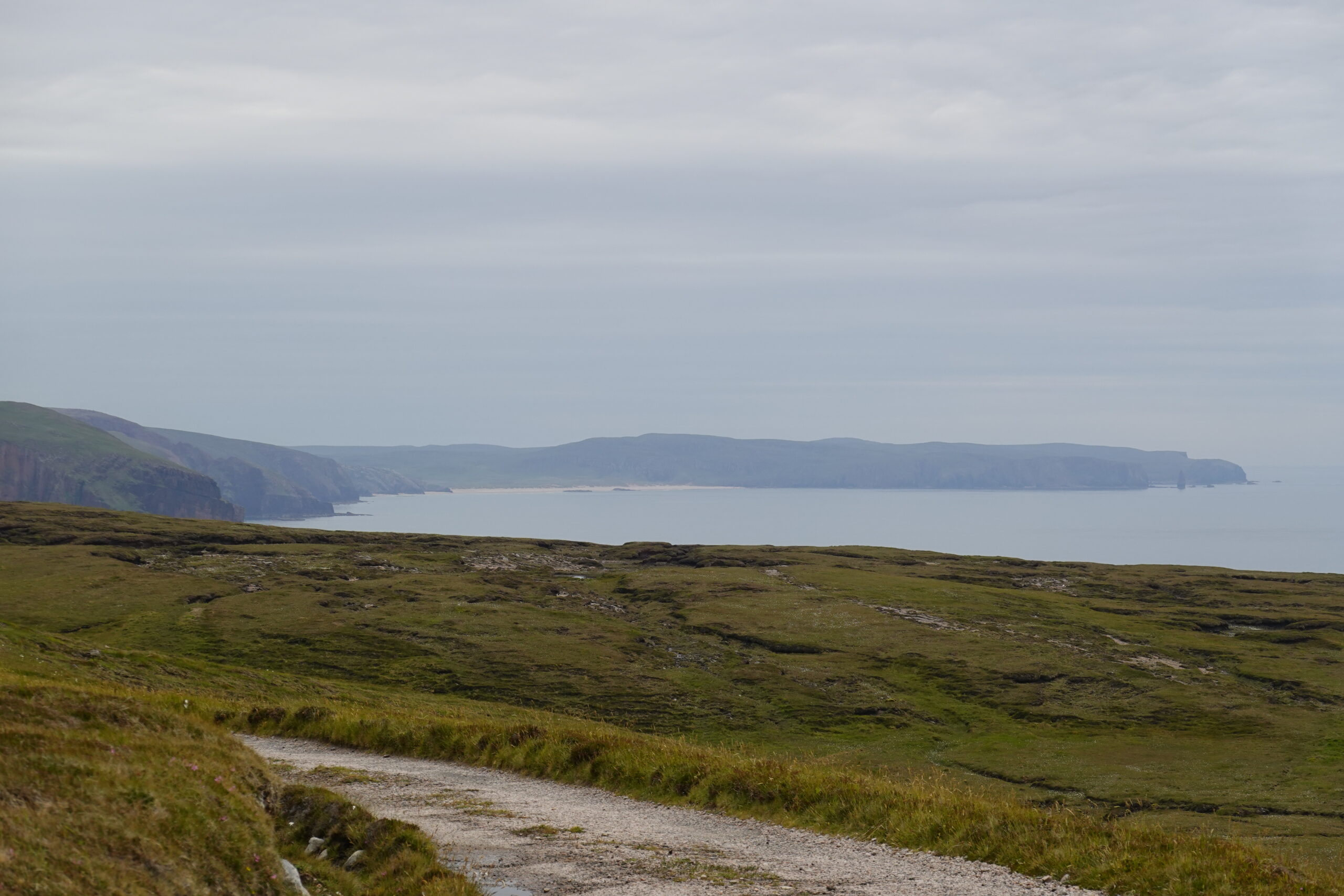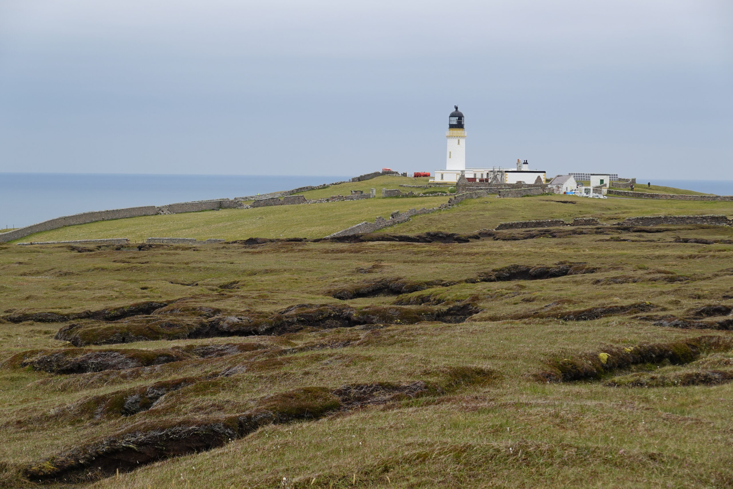 Bref, on attaque les 12 km qui nous séparent de Cape Wrath, le tout sans sentier, à travers la tourbière. On prend l’option côtière, plus difficile (car avec plus de dénivelé) mais bien plus motivante, avec des vues régulières sur les falaises et le phare au loin.