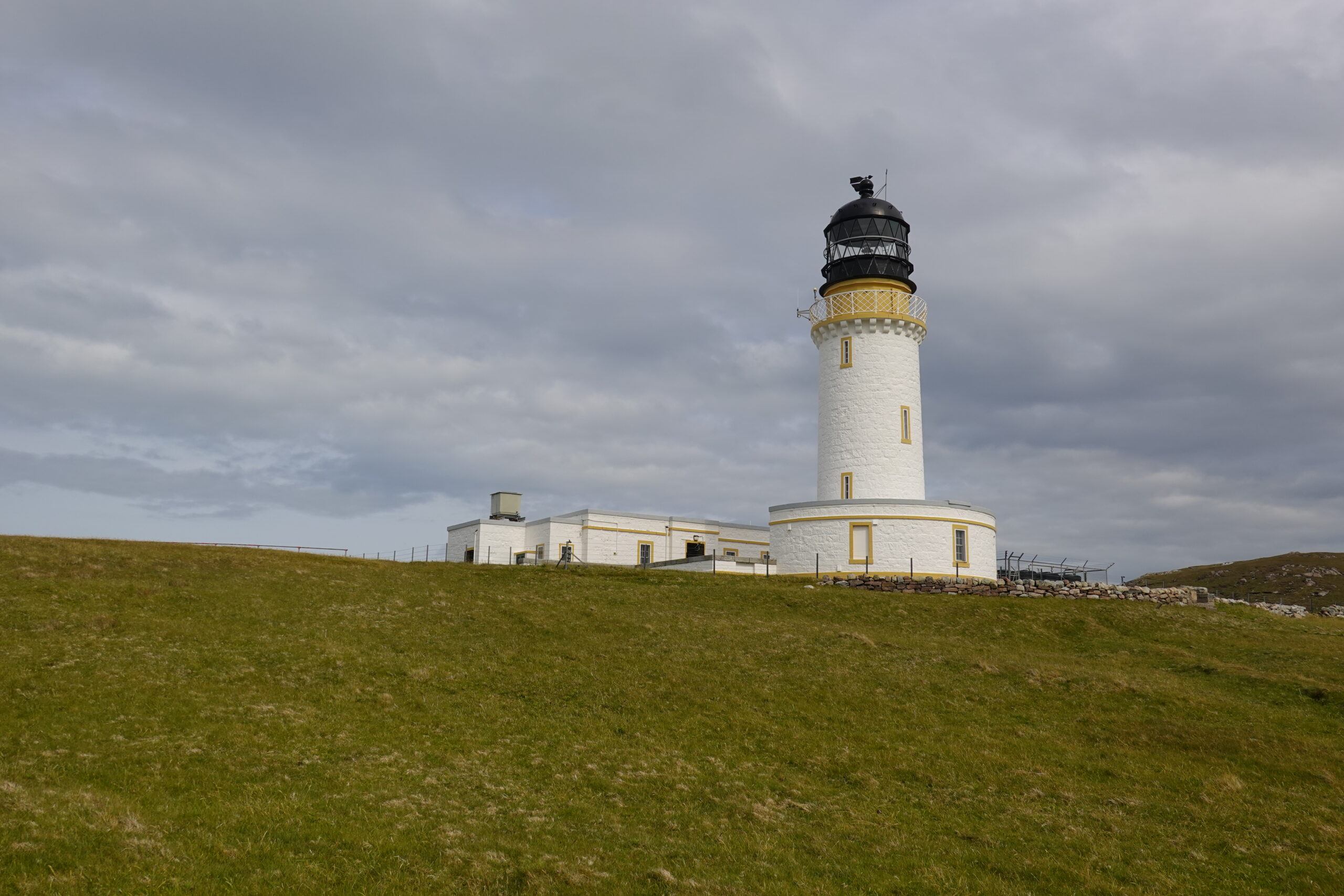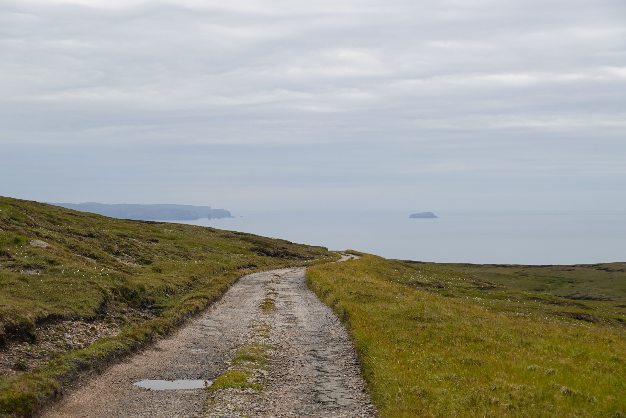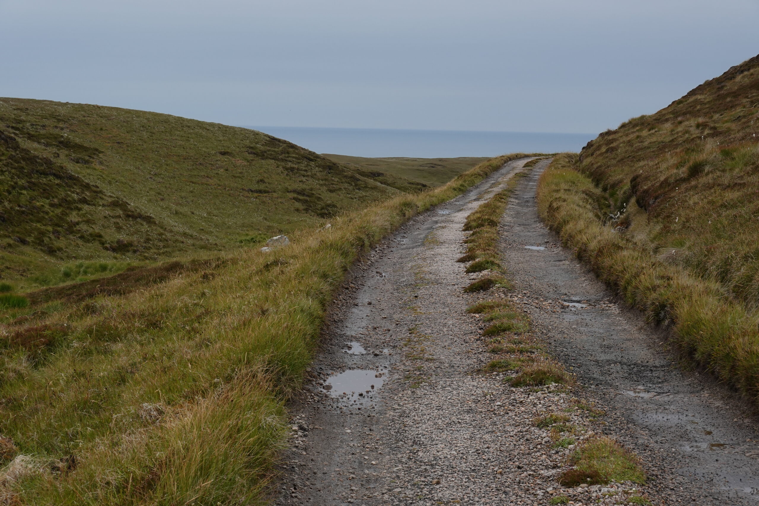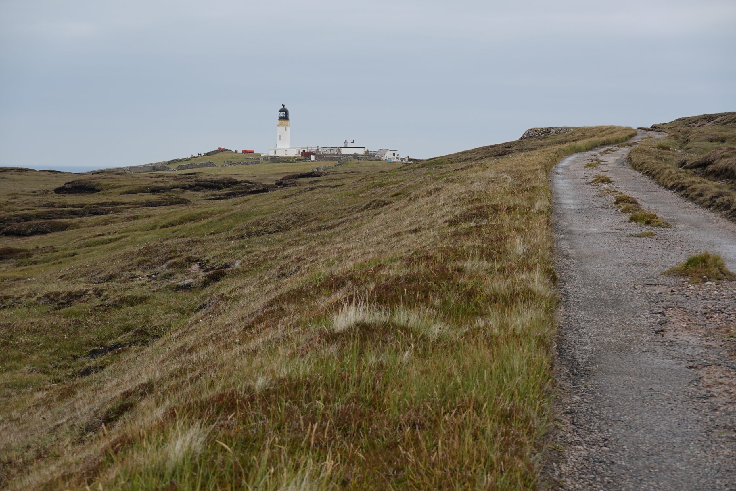 On a quelques petits beugs d’orientation (il n’y a pas de tracé officiel, mais quand même des itinéraires mieux que d’autres pour éviter le plus boggy du bog ainsi qu’un mini canyon) mais on finit par arriver sur le track qui relie Cape Wrath au ferry de Keodale. On se fait dépasser par le minibus qui amène des visiteurs au phare puis on se fait rattraper par un Allemand qui a marché depuis le ferry et nous accompagne pour le dernier kilomètre.