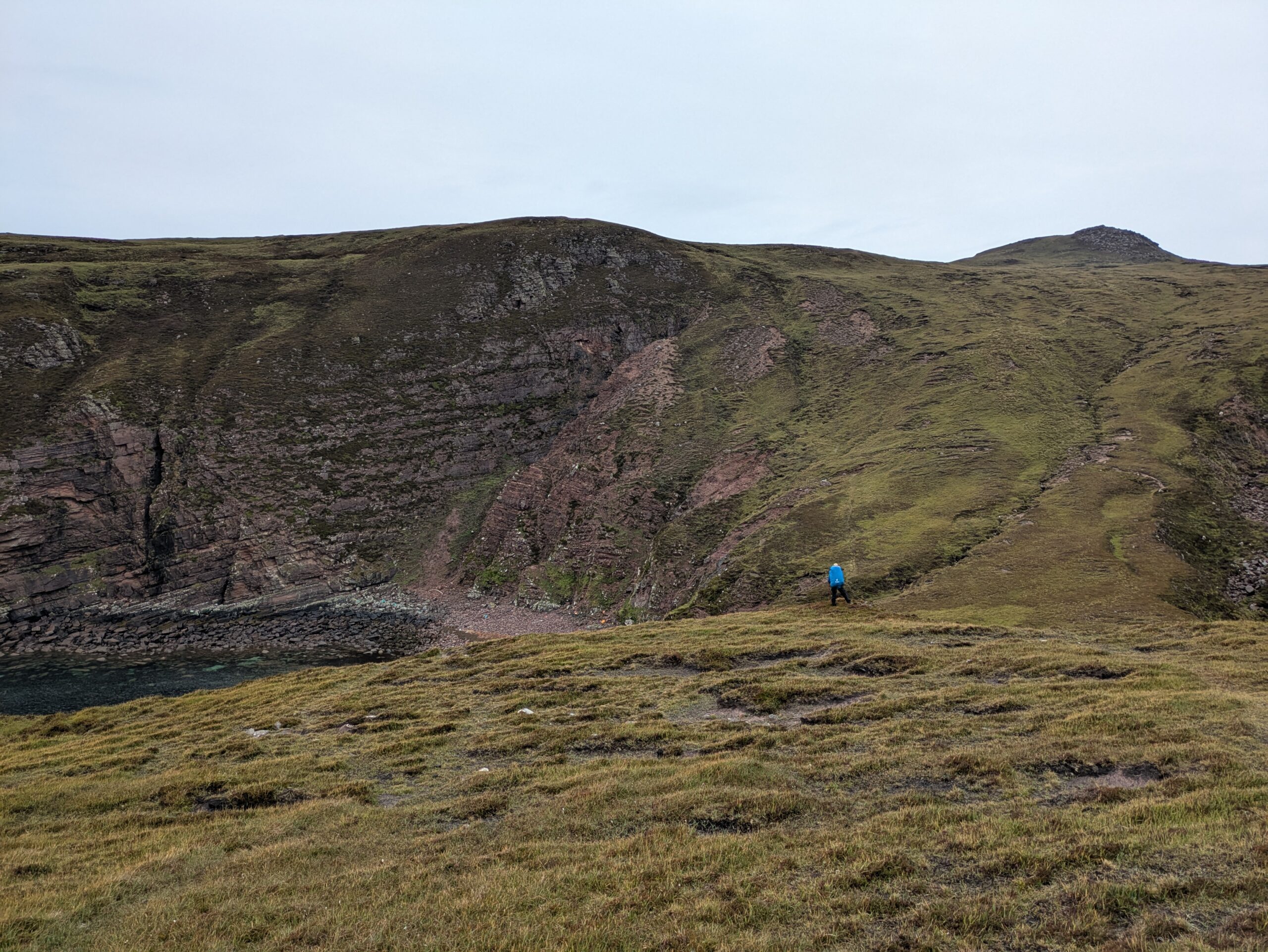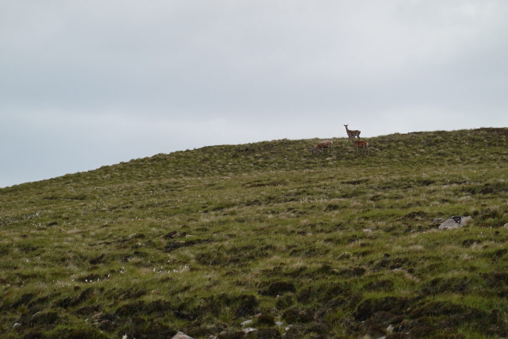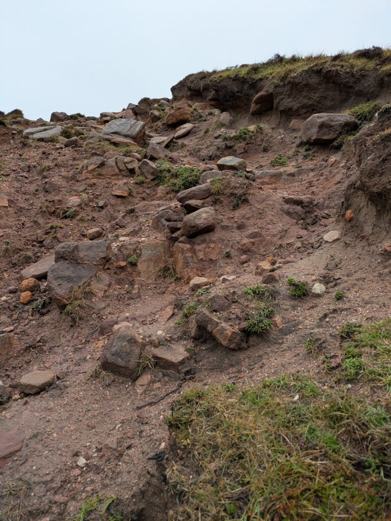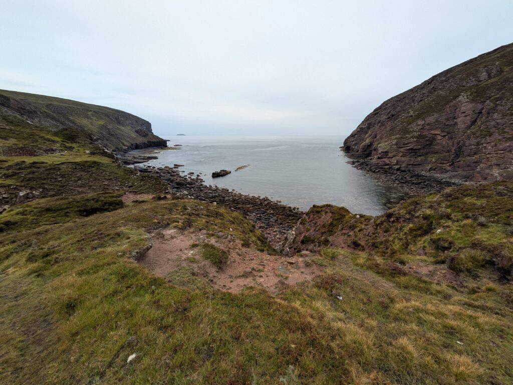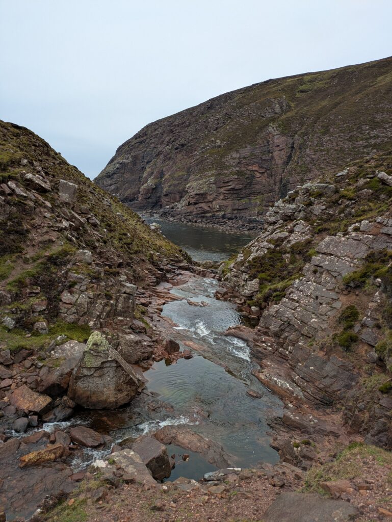 On monte et descend des pentes bien raides, on traverse quelques rivières et burns, et on fait “splotch” dans le bog. 🙂 Les roches des falaises ont de belles teintes rouge-rose. Il fait chaud malgré la pluie fine, et on transpire dans nos K-ways.