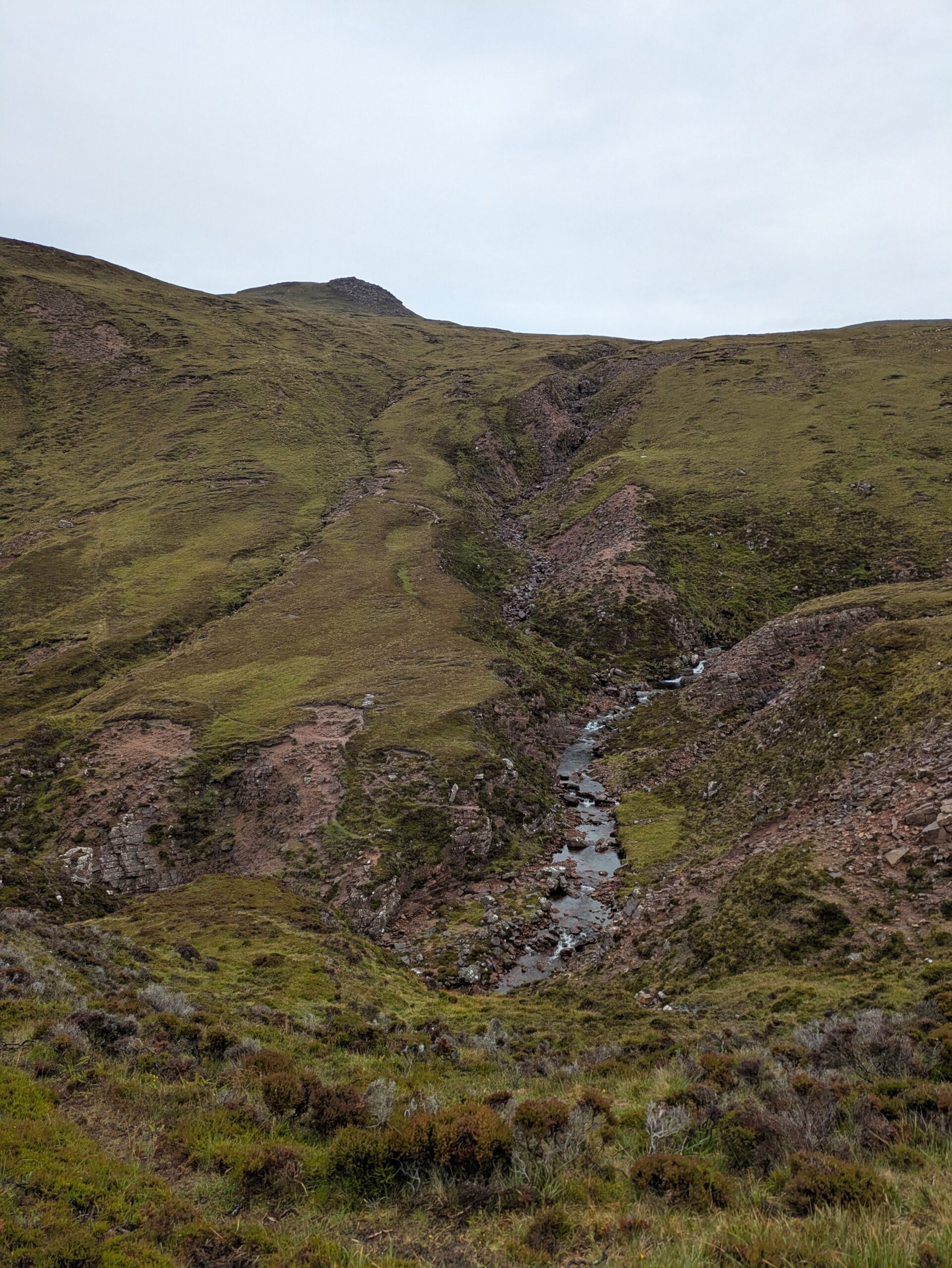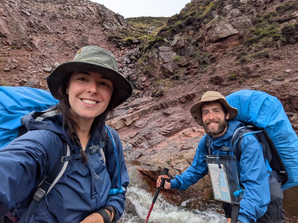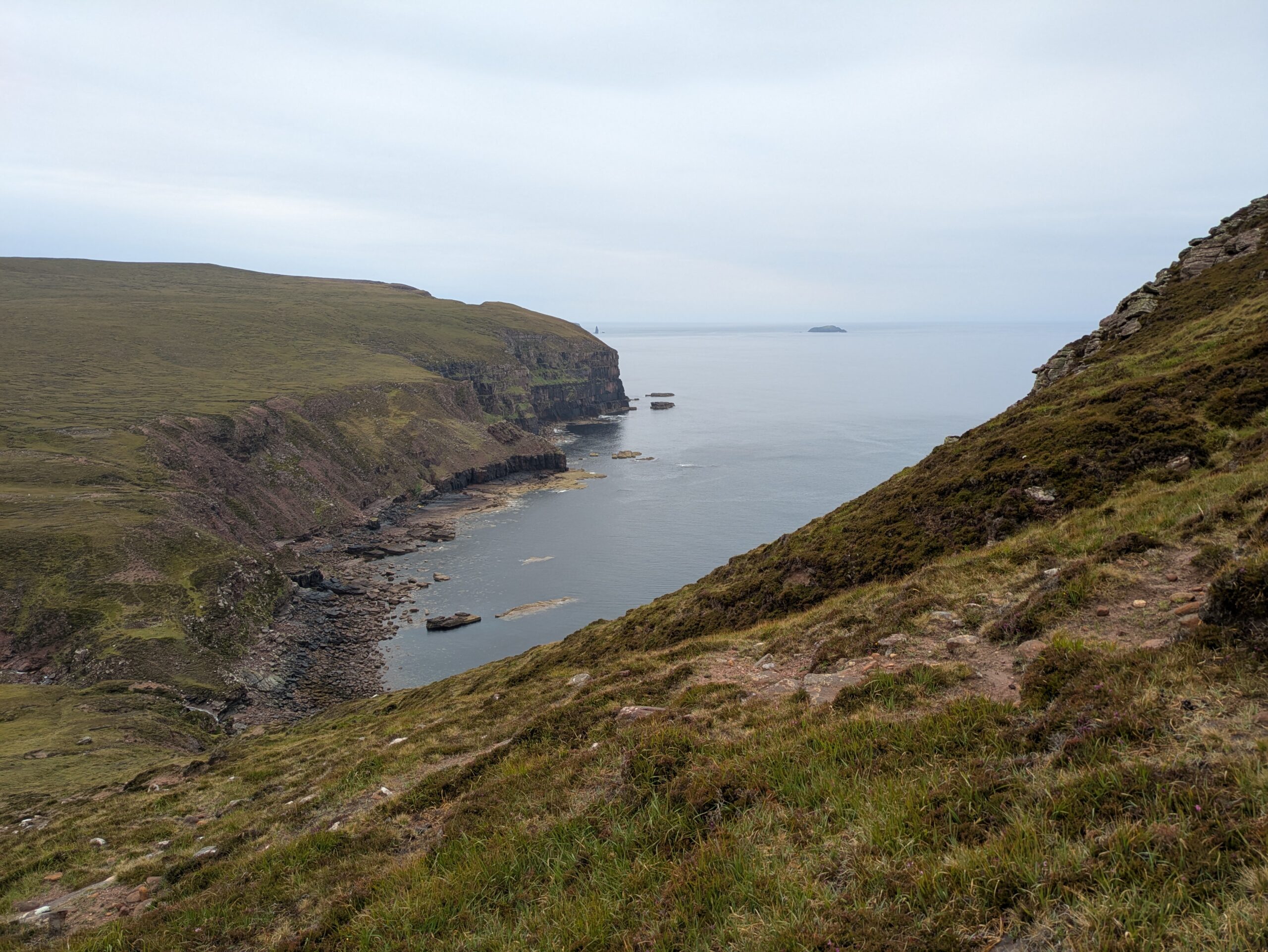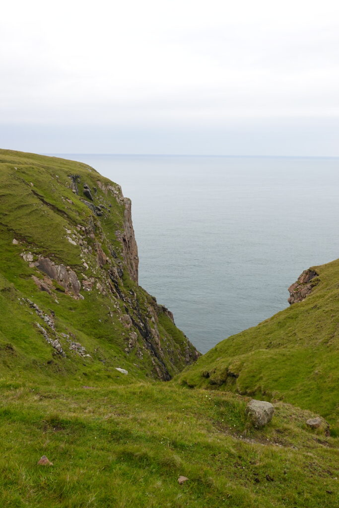 On monte et descend des pentes bien raides, on traverse quelques rivières et burns, et on fait “splotch” dans le bog. 🙂 Les roches des falaises ont de belles teintes rouge-rose. Il fait chaud malgré la pluie fine, et on transpire dans nos K-ways.