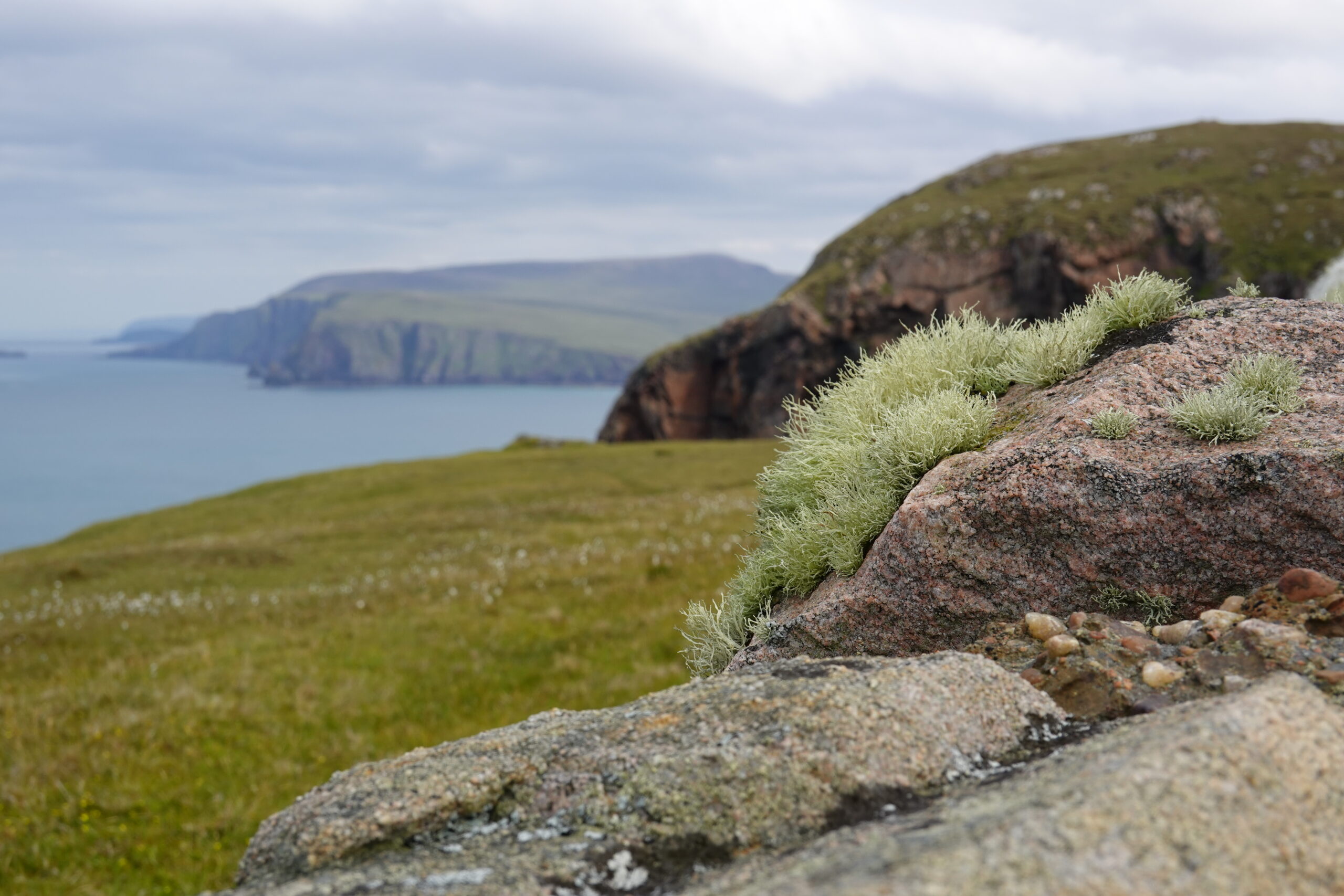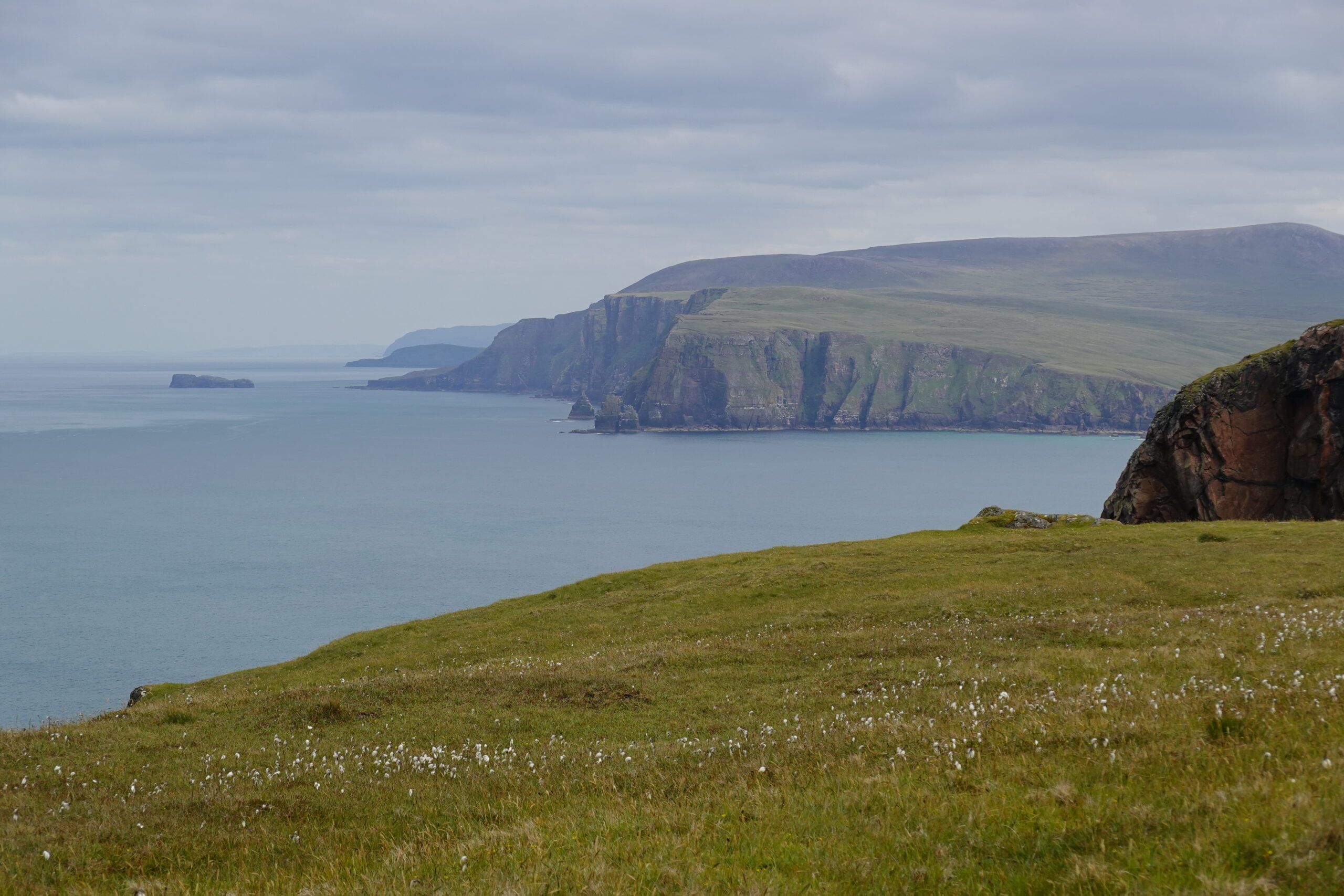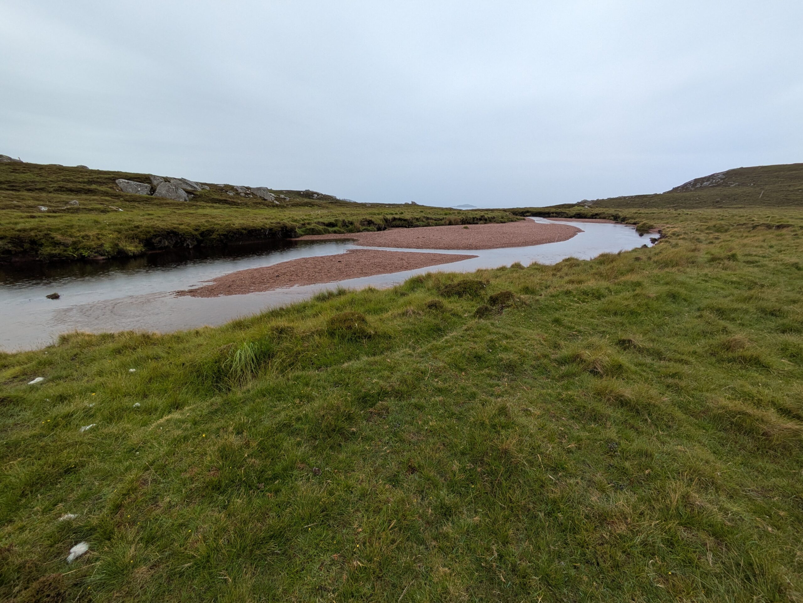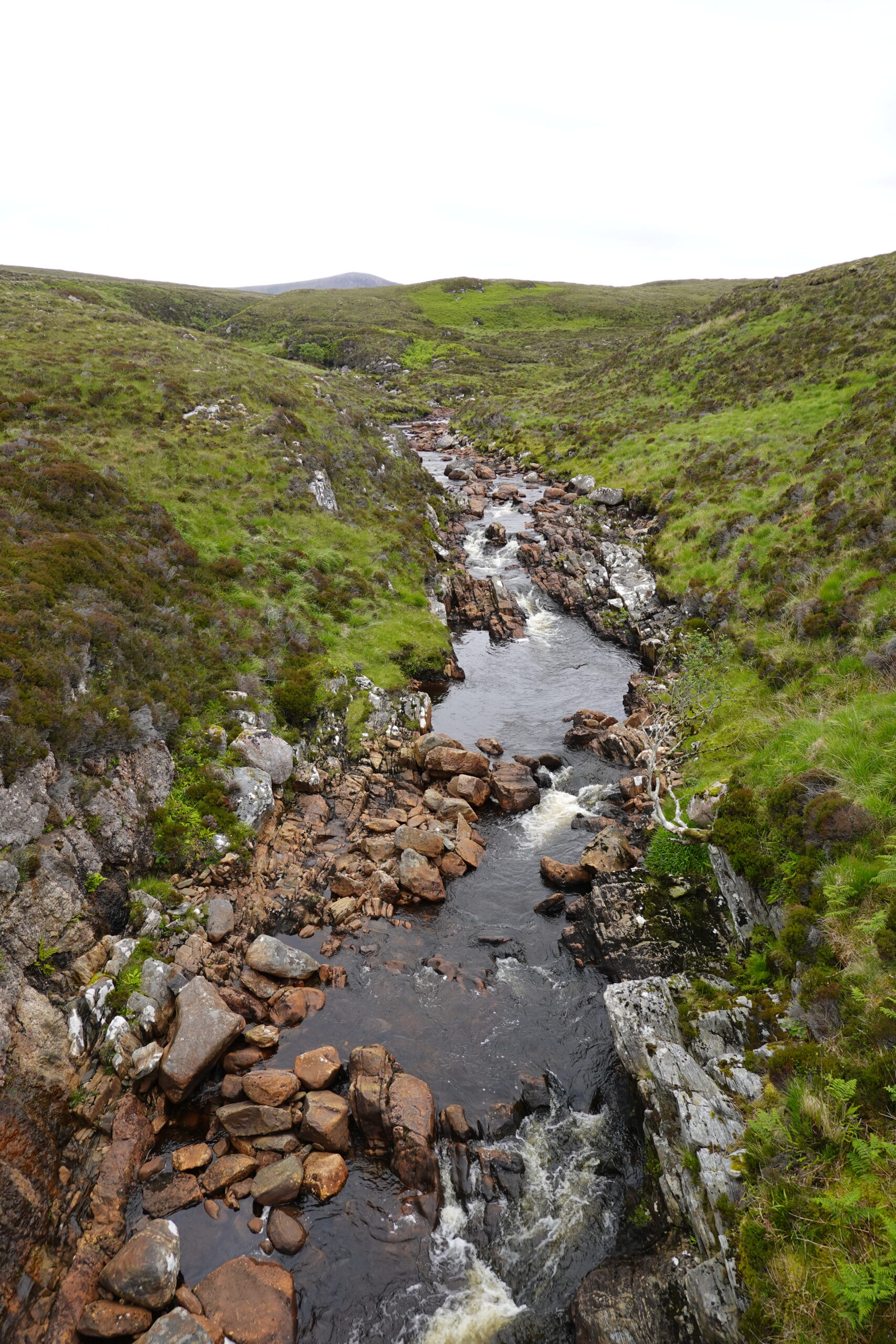 On monte et descend des pentes bien raides, on traverse quelques rivières et burns, et on fait “splotch” dans le bog. 🙂 Les roches des falaises ont de belles teintes rouge-rose. Il fait chaud malgré la pluie fine, et on transpire dans nos K-ways.