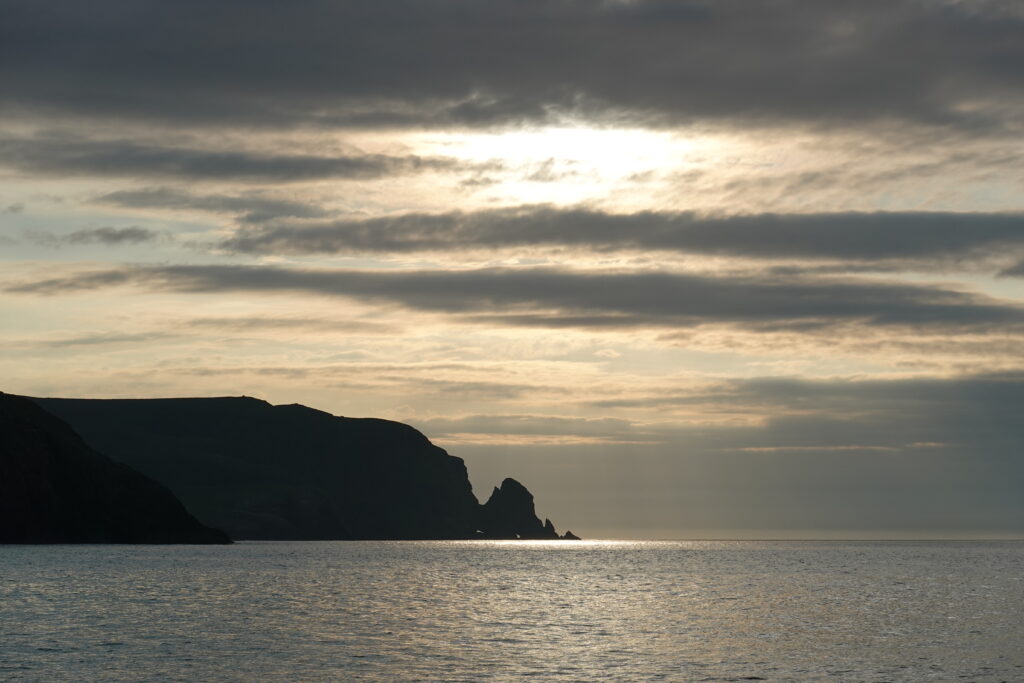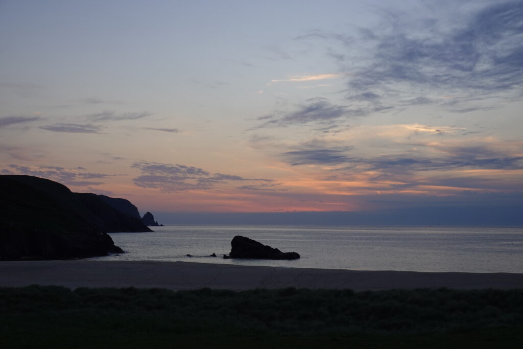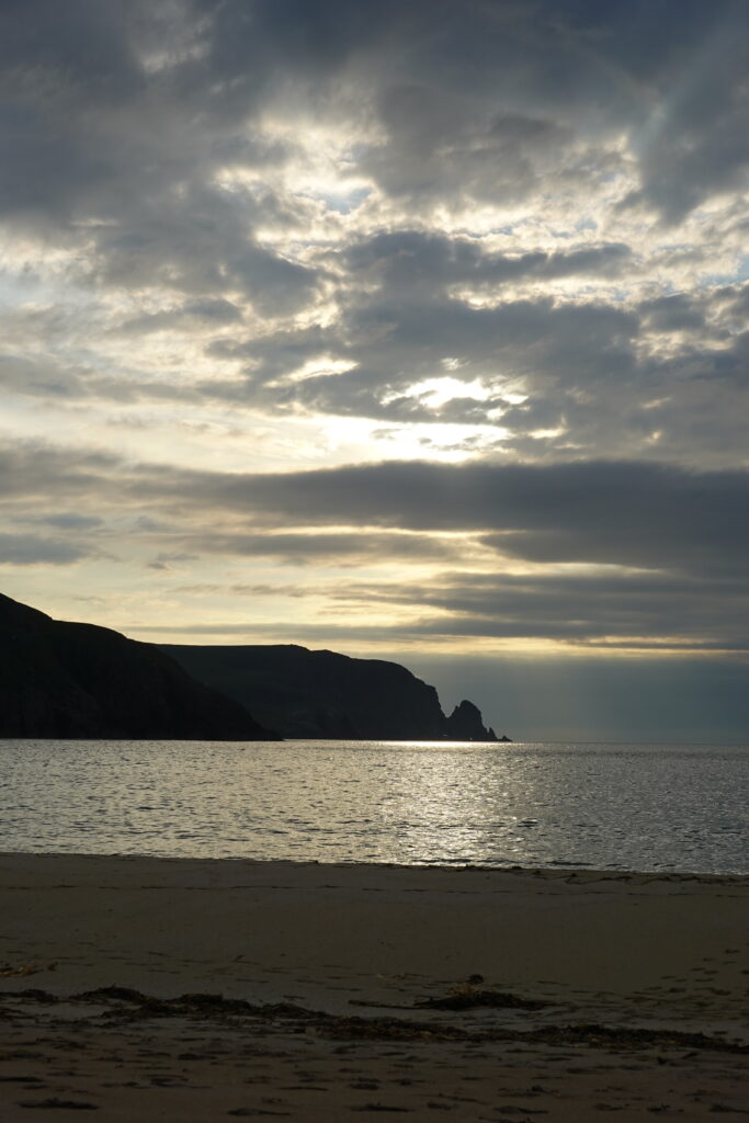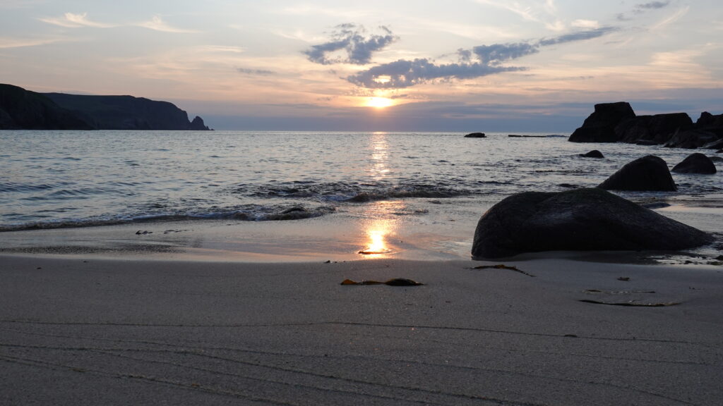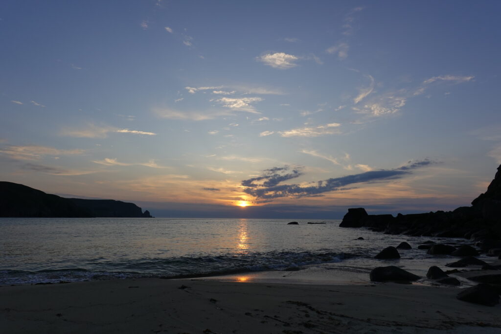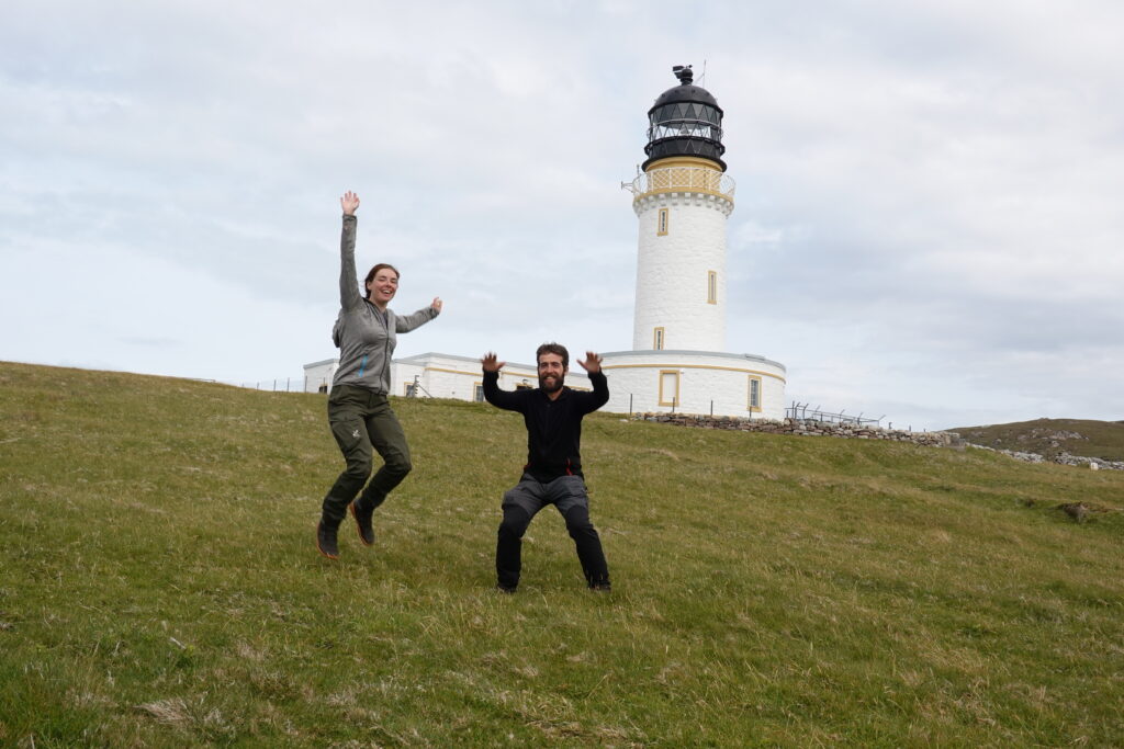 Une journée commencée sous la pluie qui se termine par un plongeon dans l’Atlantique et un coucher de soleil, avec des puffins et phoques dans le coin — on n’aurait pu rêver mieux. Cape Wrath tient son nom du mot Norse pour “Turning Point” (car c’est là que les bateaux norvégiens tournaient vers l’est direction chez eux), et il marque aussi un tournant pour nous, la fin de ce trek dont on a rêvé durant tant de mois.