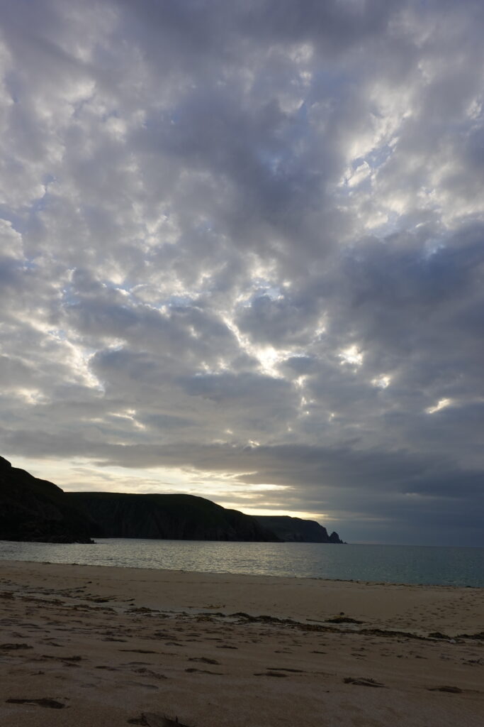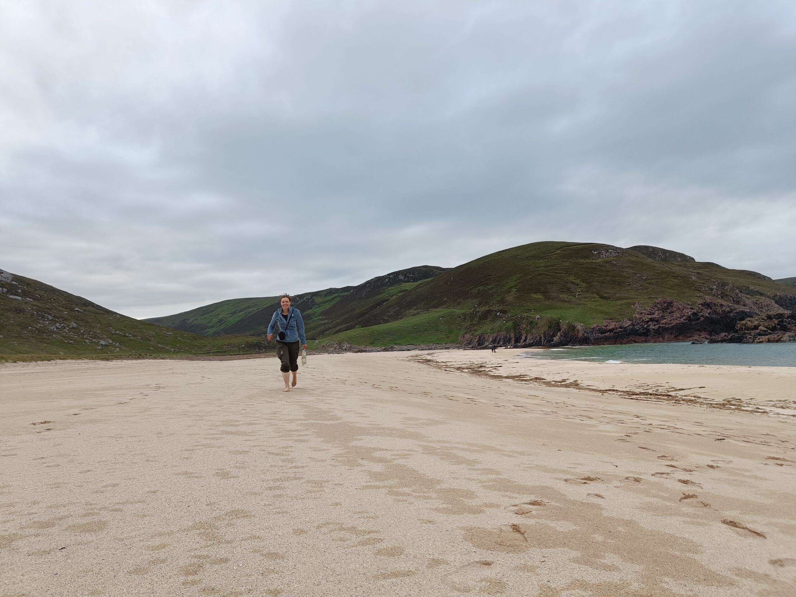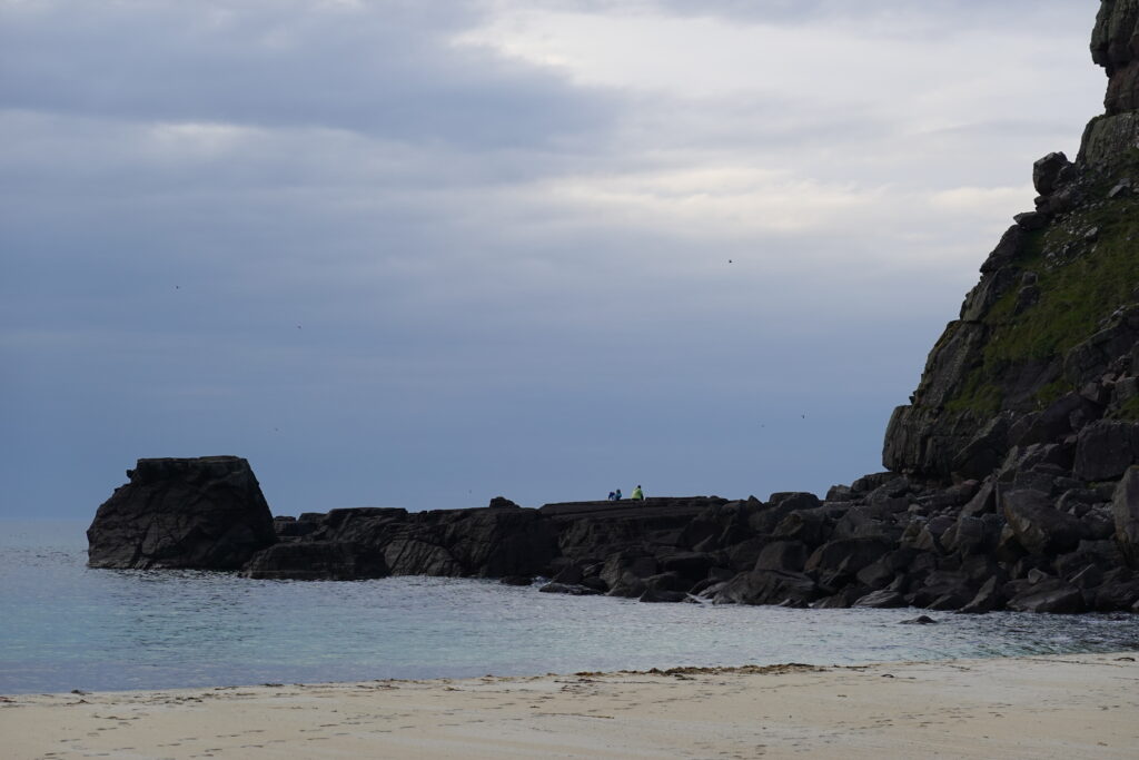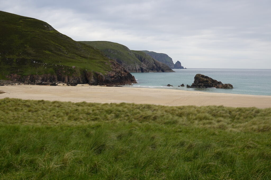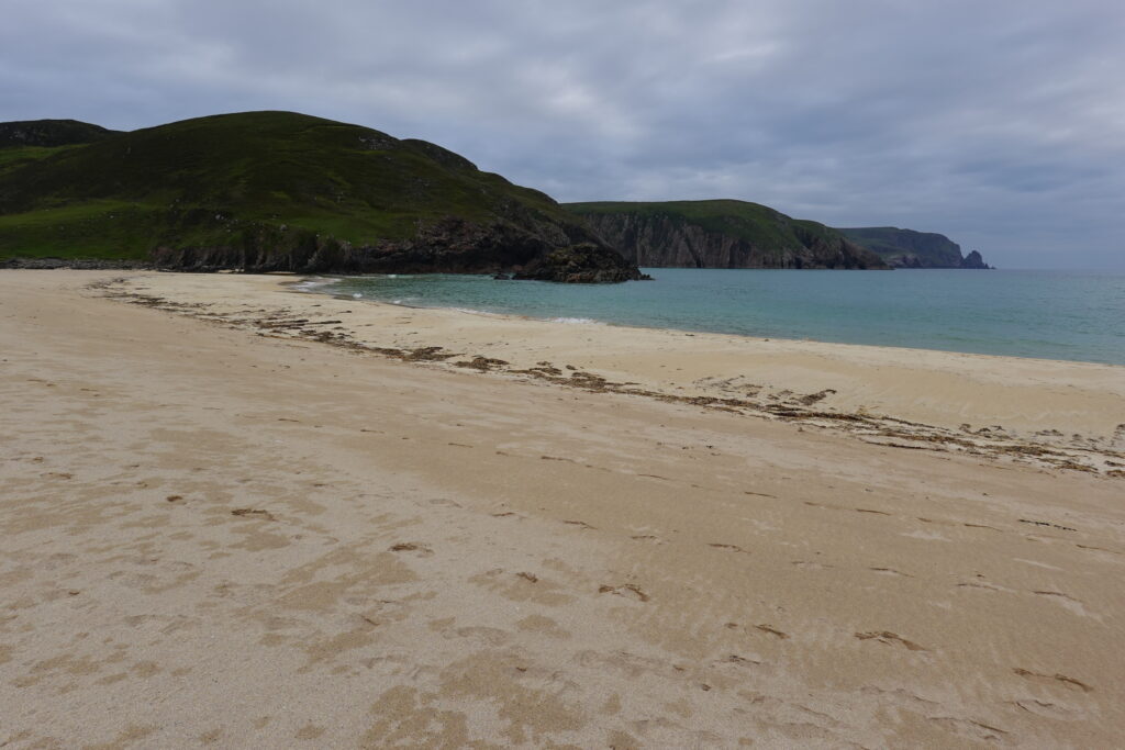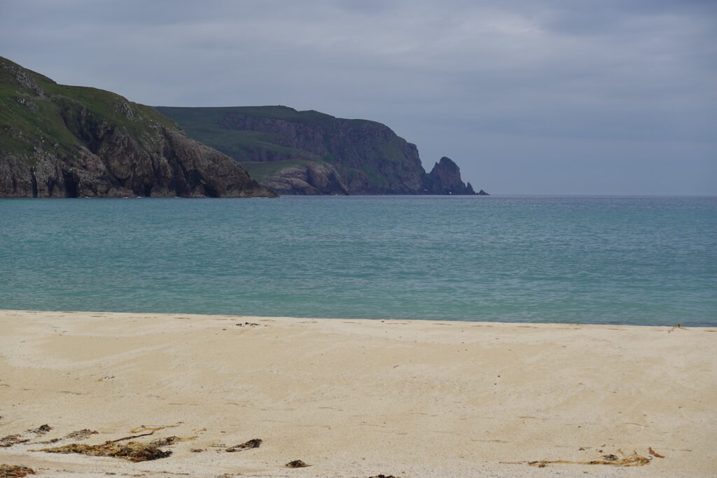 C’est un peu laborieux car José sent soudainement son talon, mais quelle sacrée récompense en atteignant Kearvaig! La petite baie est magnifique, avec sa plage de sable blanc bordée de falaises et son eau turquoise.