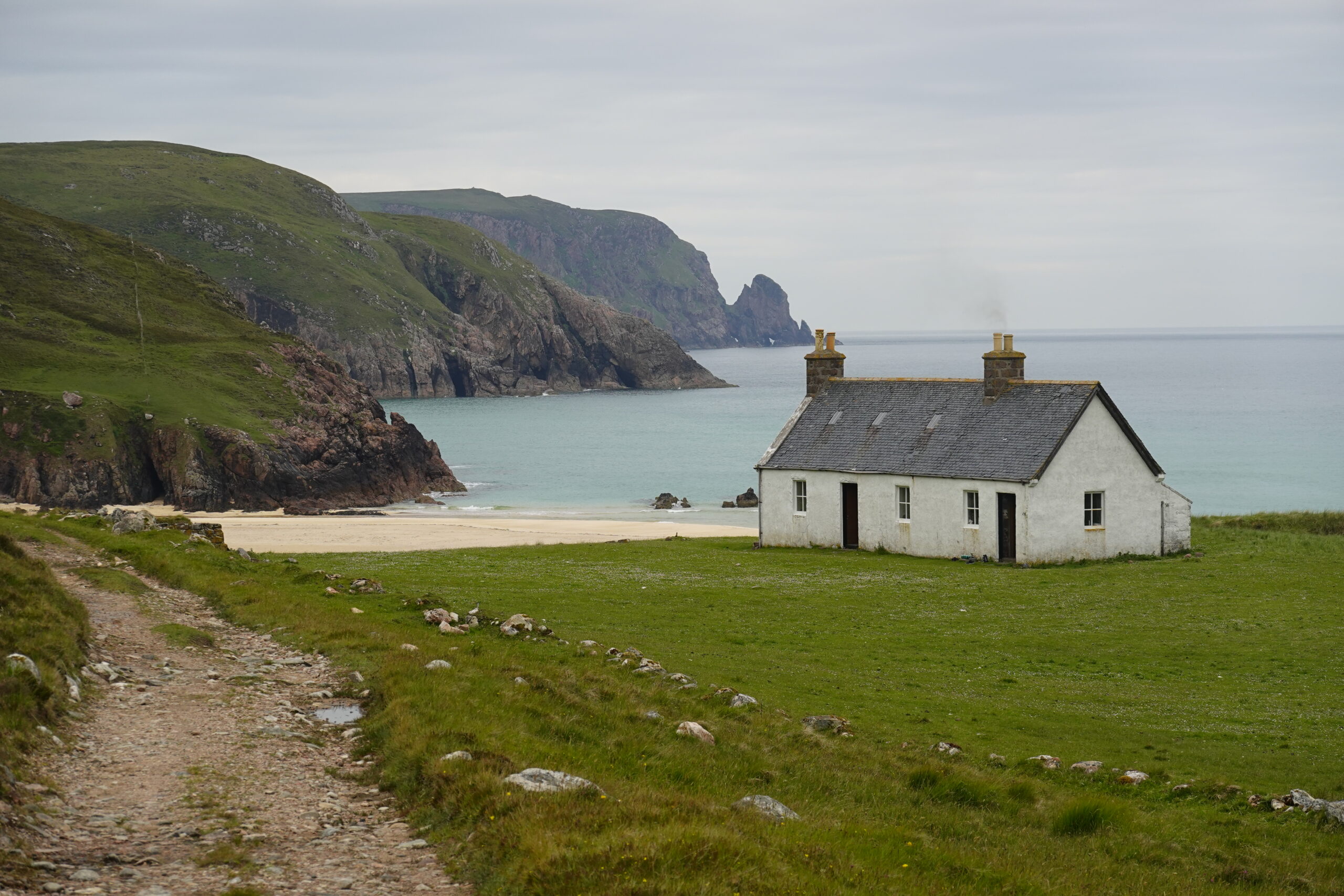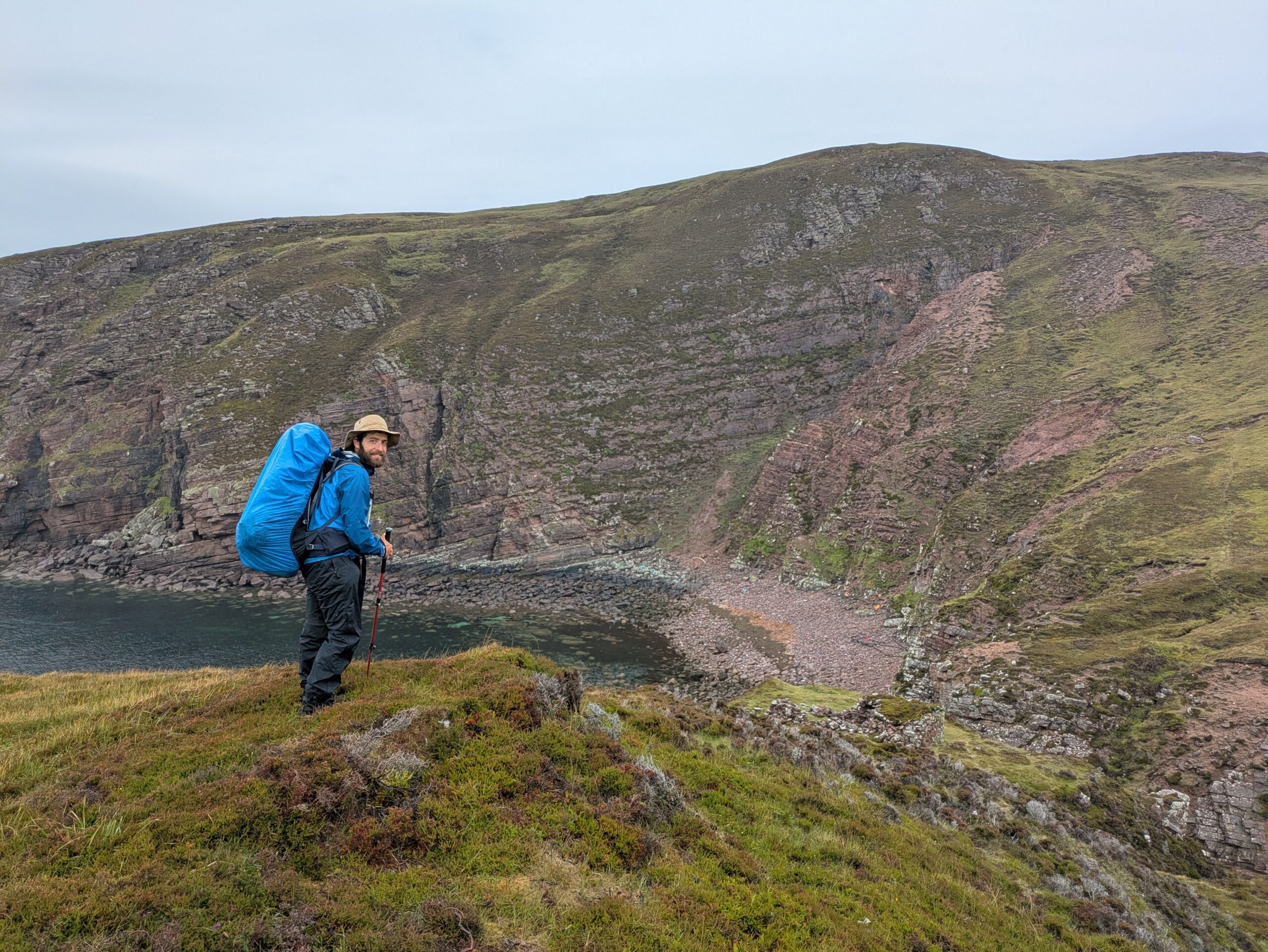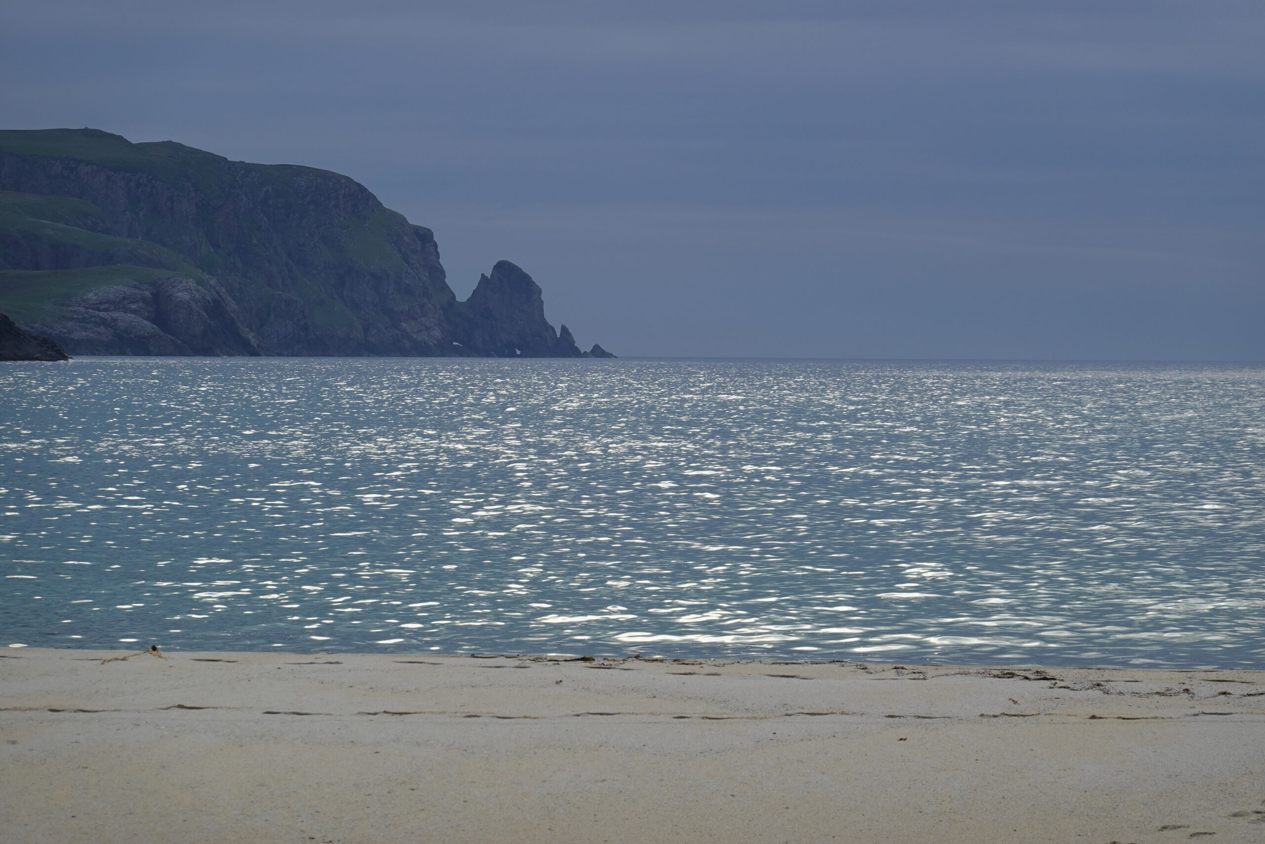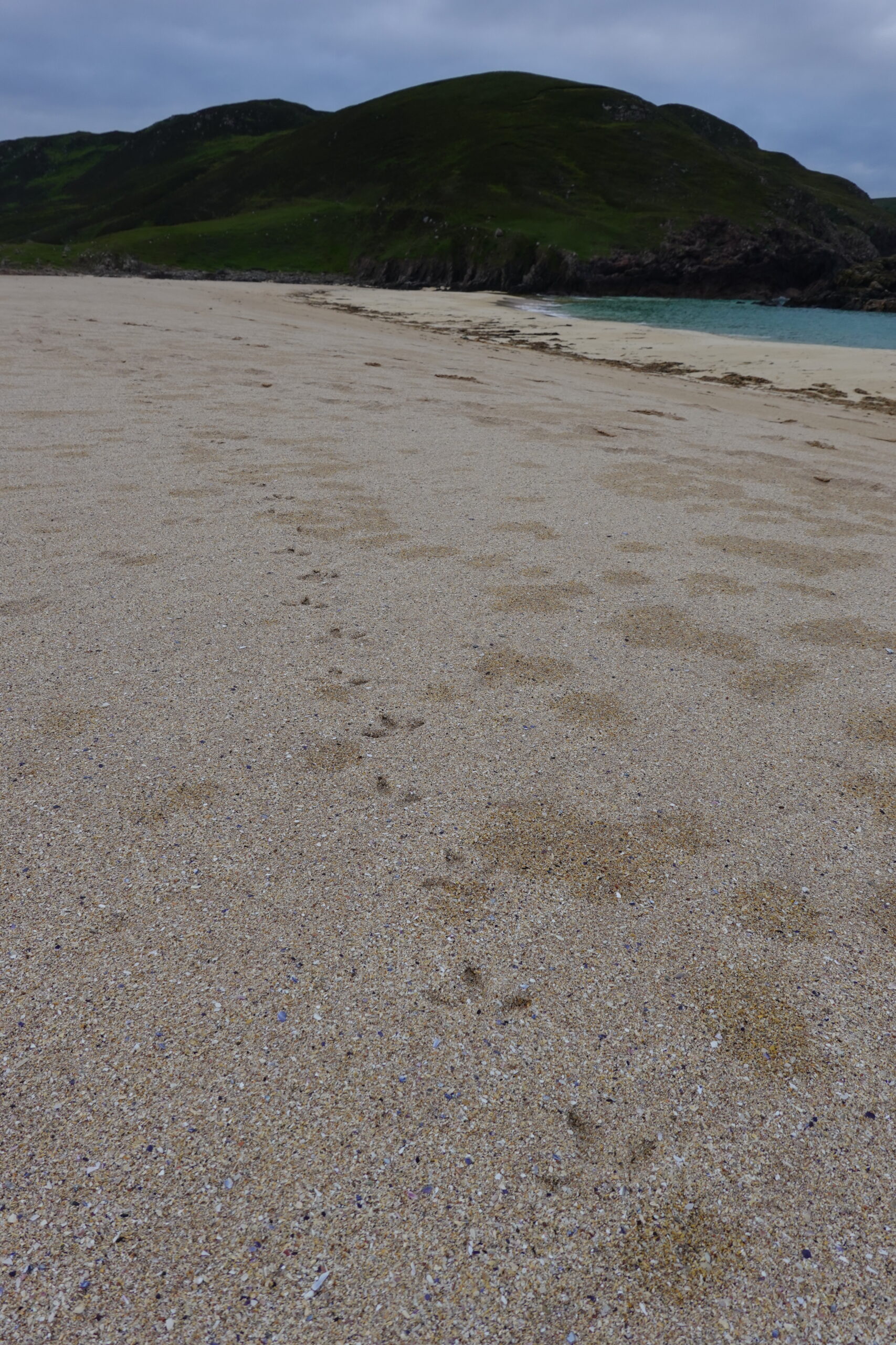 C’est un peu laborieux car José sent soudainement son talon, mais quelle sacrée récompense en atteignant Kearvaig! La petite baie est magnifique, avec sa plage de sable blanc bordée de falaises et son eau turquoise.