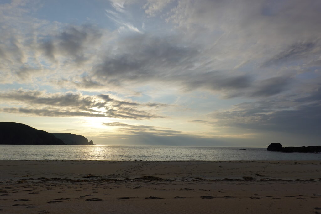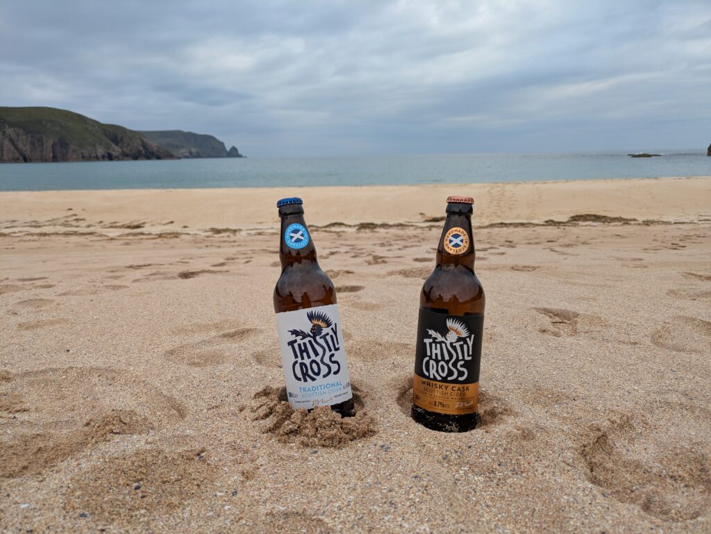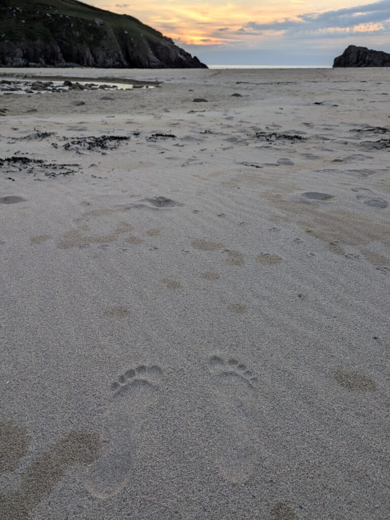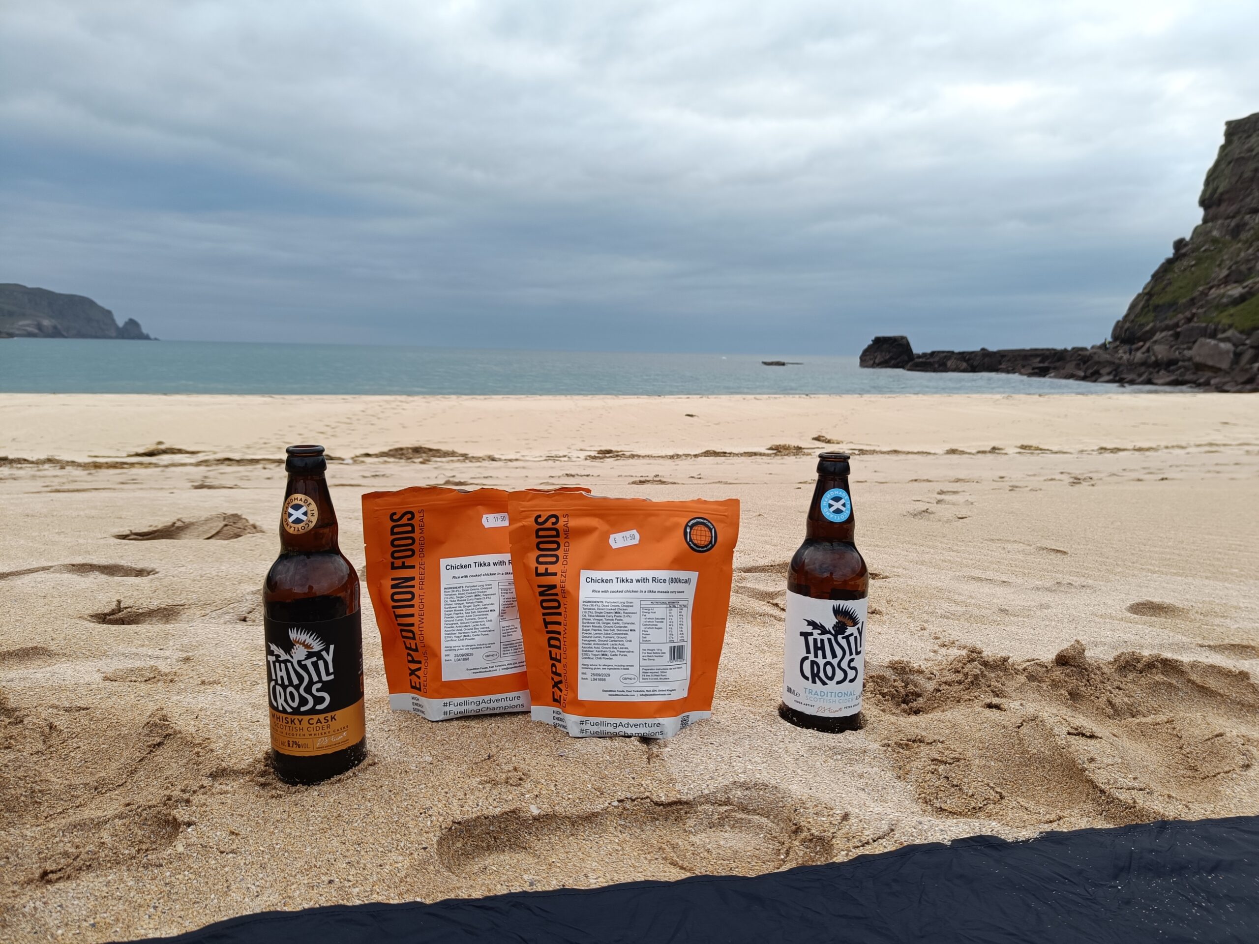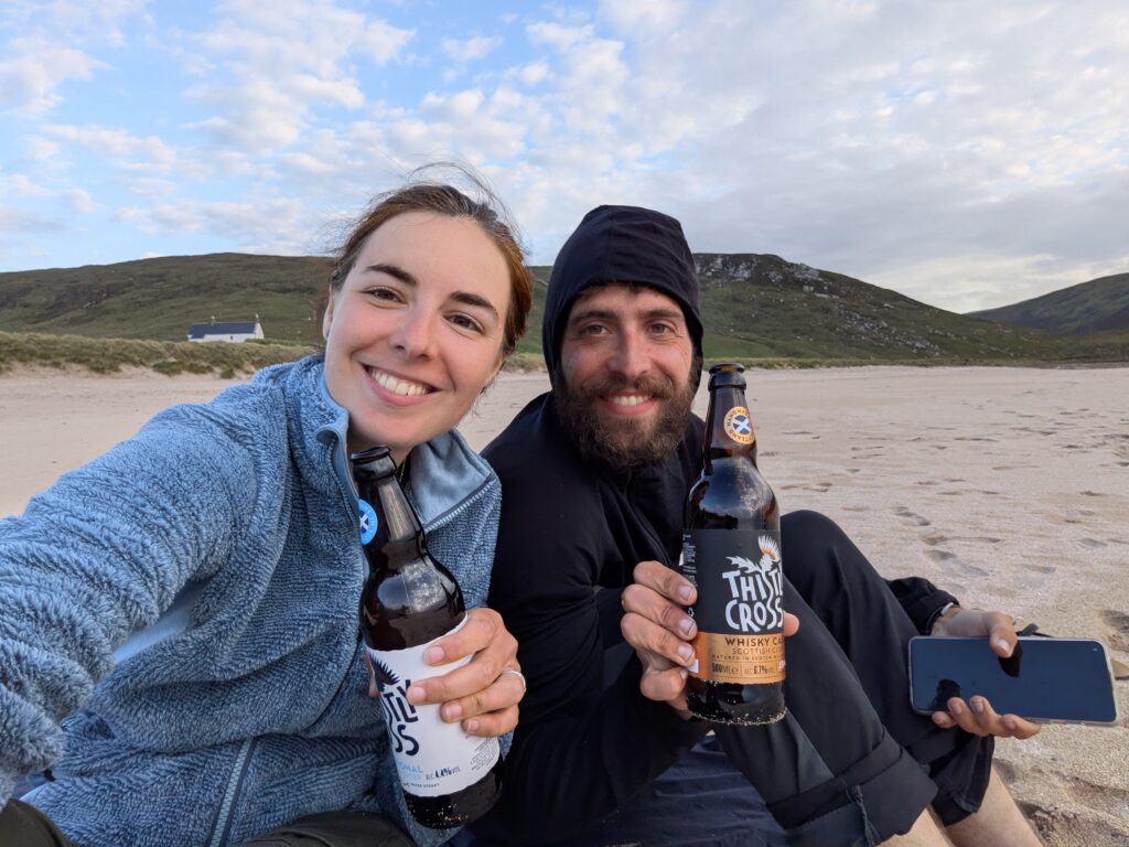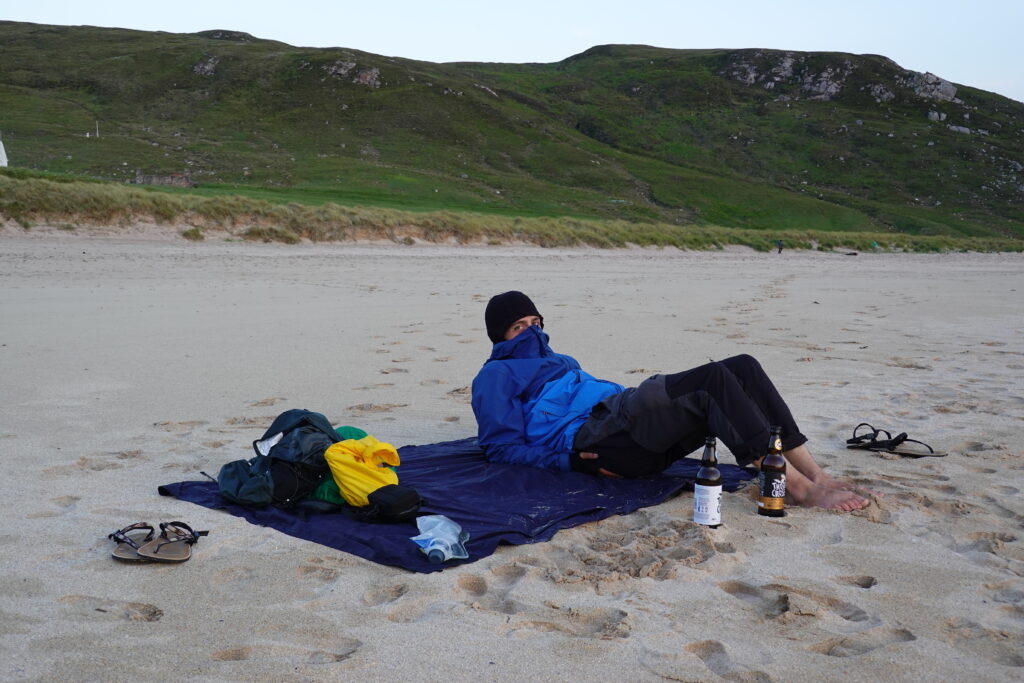 Je vais chercher de l’eau douce à la rivière, puis on s’installe dans le sable pour manger un bon Chicken Tikka, accompagné des Thistly Cross Ciders achetés à Kinlochbervie. On avait oublié le couteau suisse pour décapsuler les bouteilles, donc j’ai fait un petit sprint jusqu’au bothy pour le récupérer, pieds nus, gambadant comme une chèvre sauvage dans les dunes couvertes de Marram grass (ammophile) — ramassant quelques tiques au passage, arf. Je débordais vraiment d’énergie! ^^