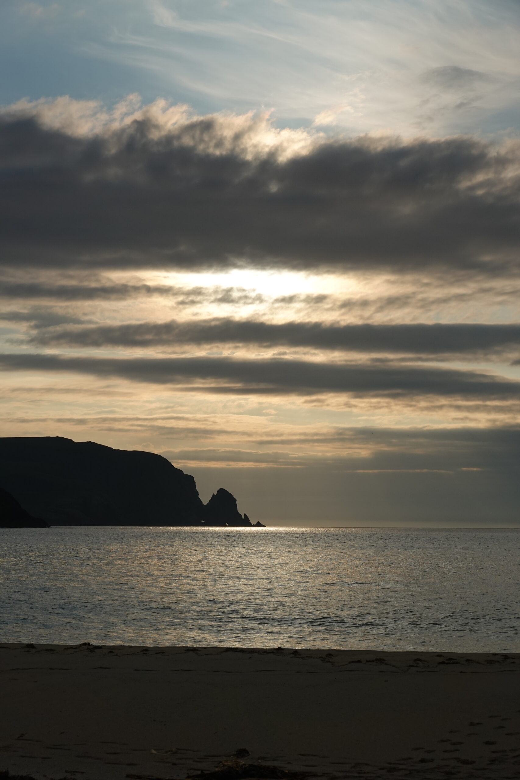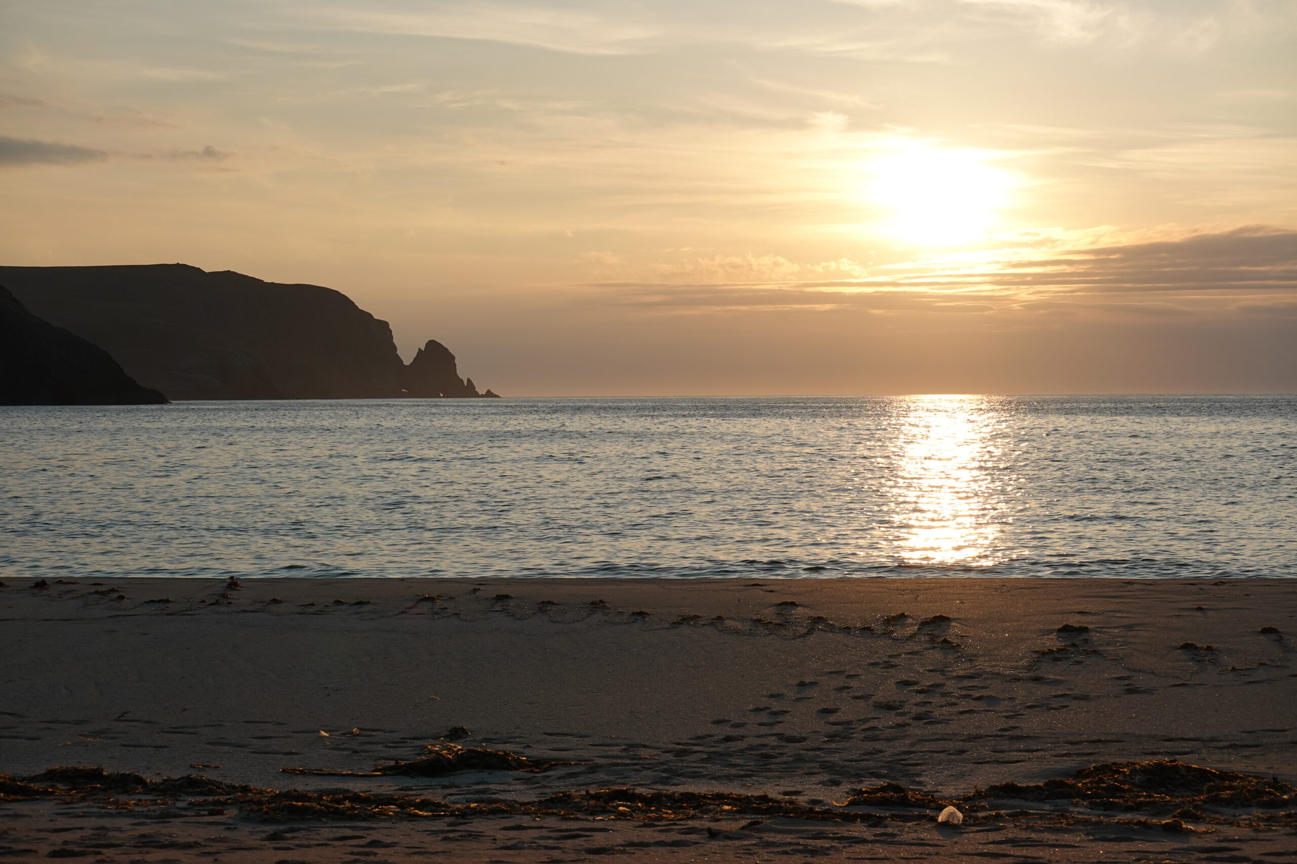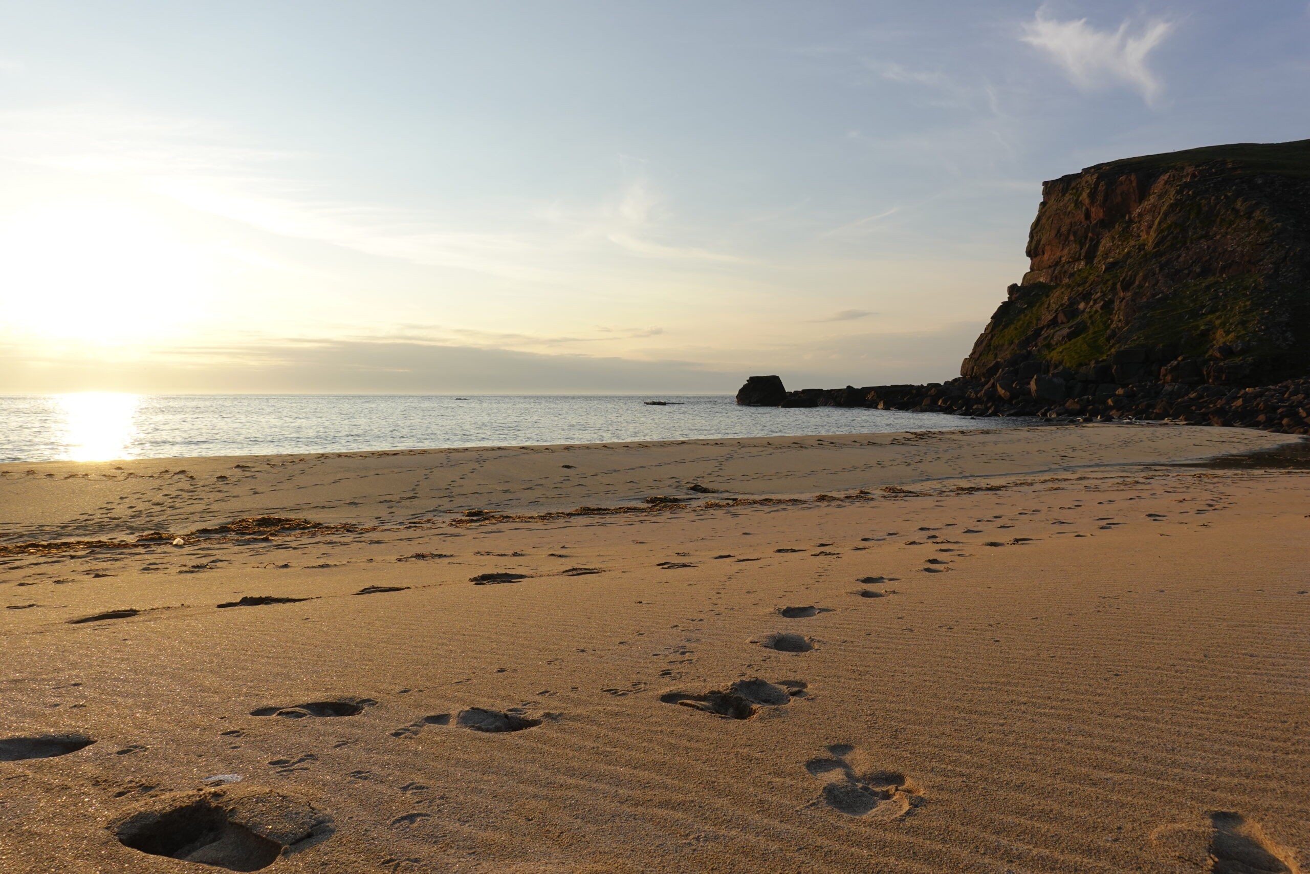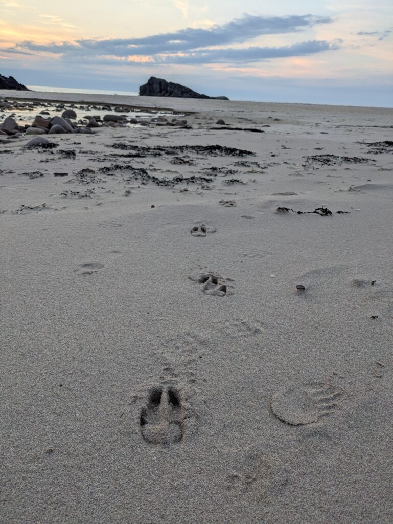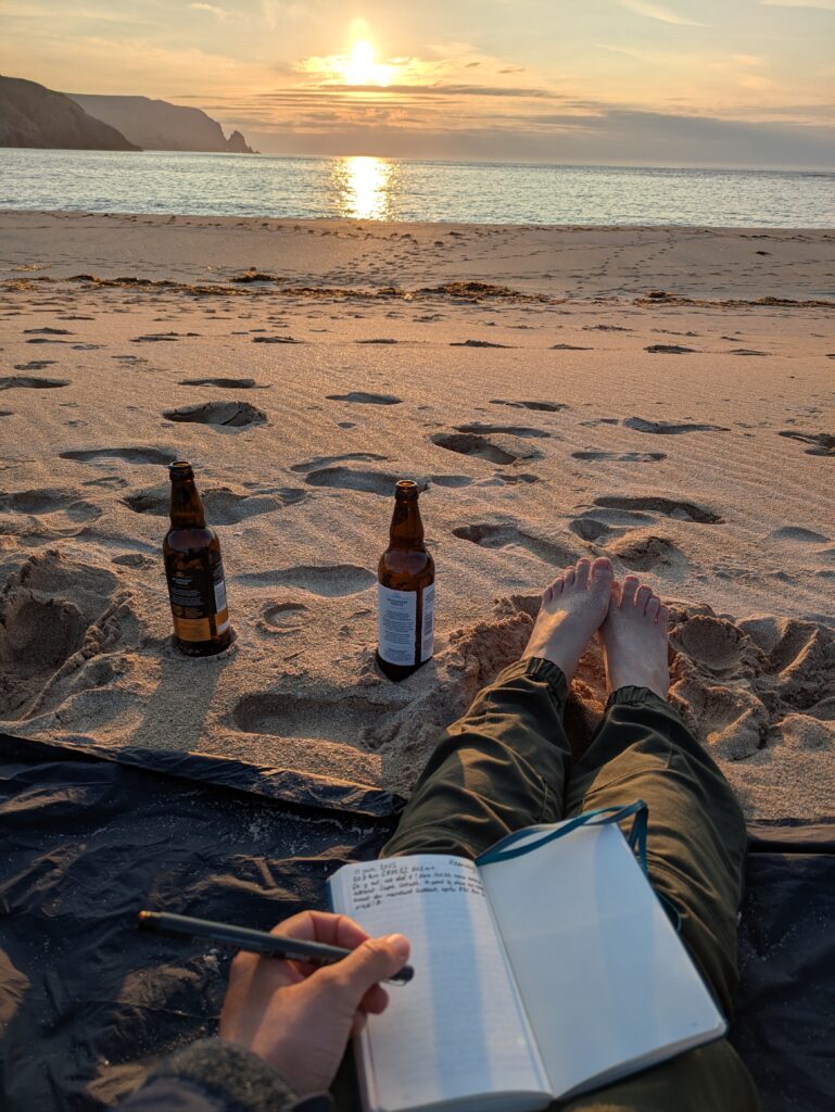 Je vais chercher de l’eau douce à la rivière, puis on s’installe dans le sable pour manger un bon Chicken Tikka, accompagné des Thistly Cross Ciders achetés à Kinlochbervie. On avait oublié le couteau suisse pour décapsuler les bouteilles, donc j’ai fait un petit sprint jusqu’au bothy pour le récupérer, pieds nus, gambadant comme une chèvre sauvage dans les dunes couvertes de Marram grass (ammophile) — ramassant quelques tiques au passage, arf. Je débordais vraiment d’énergie! ^^