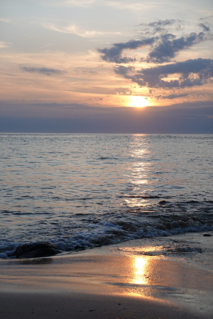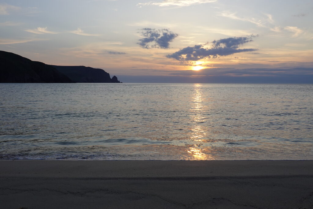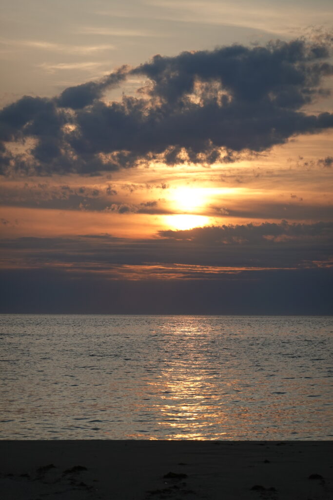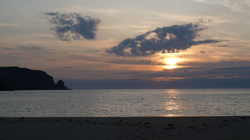 Les bikepackers français nous rejoignent sur la plage pour discuter un moment, puis on reste seuls à admirer le coucher du soleil.