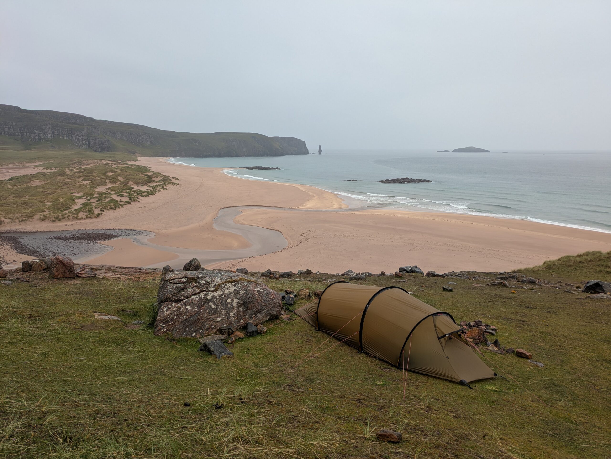 La journée a commencé plutôt tranquillement car on ne voulait pas émerger de notre cocon, la pluie et les midges ayant annulé notre plan de manger notre porridge en admirant la vue sur Sandwood Bay. On a donc pris notre petit-dèj’ bien cosy dans la tente, avant de finalement plier bagage.