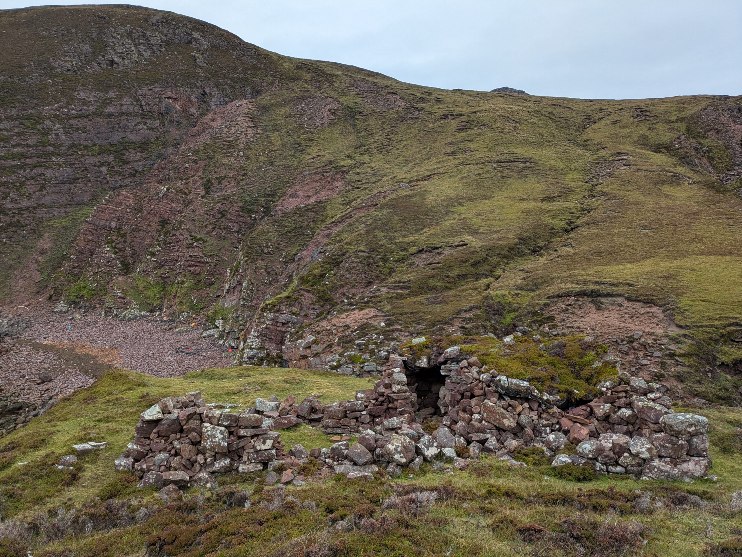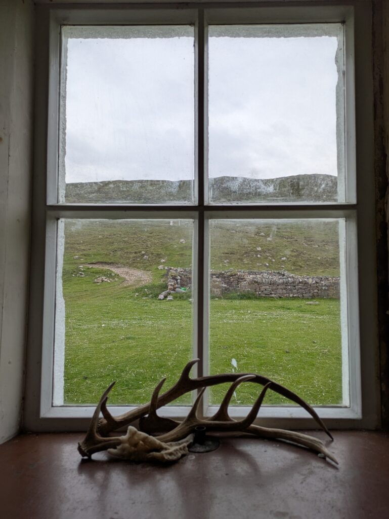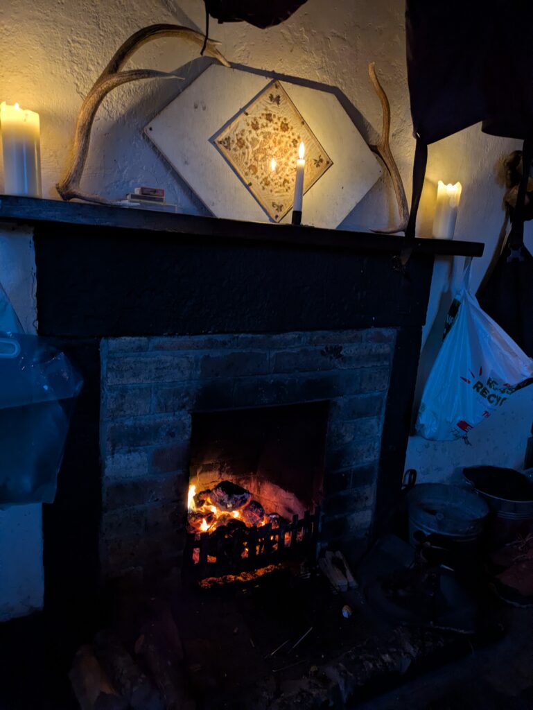 De la fumée s’échappe d’une cheminée, donc on sait déjà qu’on aura de la compagnie au bothy. Un groupe (très accueillant) de facteurs du Fife est là en vacances et on rencontre aussi un couple de Français en pré-retraite qui font un méga voyage à vélo et ont planté leur tente à côté du bothy. Ce dernier est spacieux, donc on trouve sans problème une pièce où installer nos affaires pour la nuit. Un peu plus tard, quatre autres hommes (dont trois jeunes) ont débarqué, avec des cabas remplis d’alcool — vu qu’il y a l’option de prendre le minibus pour être déposé pas loin, ça a l’air d’être un bothy populaire. Deux heures plus tard, l’un des jeunes était déjà à deux doigts du coma éthylique et a dû être littéralement porté par ses potes pour retourner au bothy. Bref, une autre ambiance que notre état d’esprit du moment, mais ça ne nous a pas empêchés de passer une belle soirée tranquille. ^^