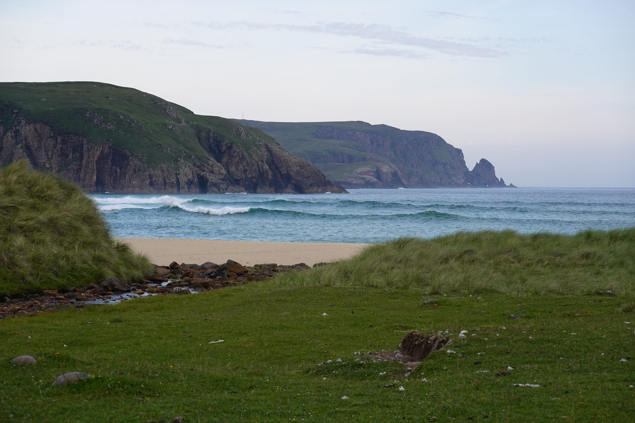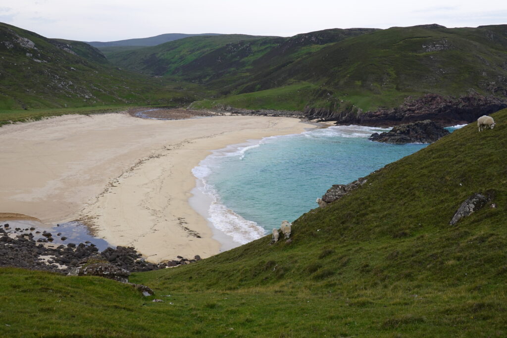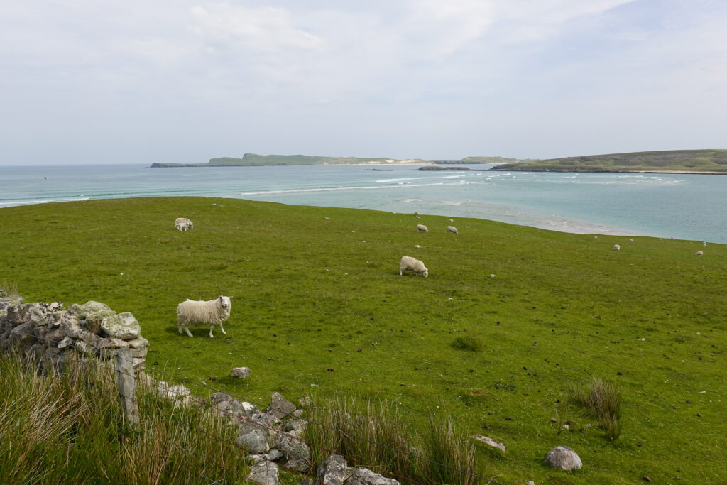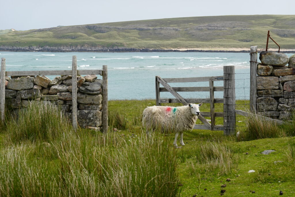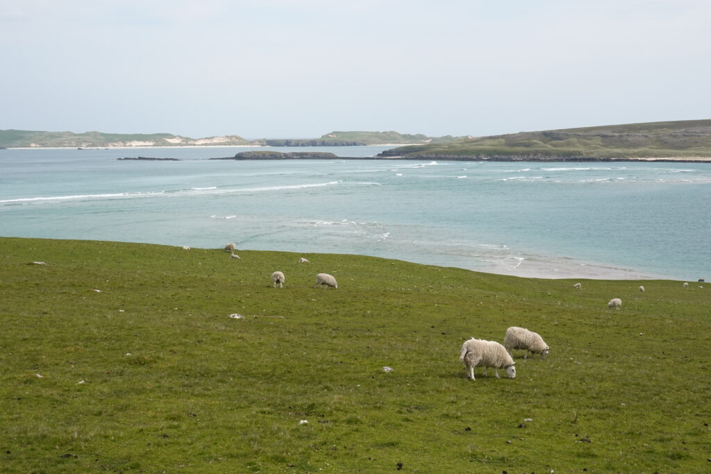 On trouve sans souci des passagers qui veulent bien nous ramener à Durness en voiture, yay! Il s’agit d’un couple de “sheep farmers” des Yorkshire Dales, très sympas. Ils nous ont posés devant le SPAR de Durness puis on a marché deux minutes jusqu’au camping de Sango Sands, à l’accueil ultra chaleureux!
