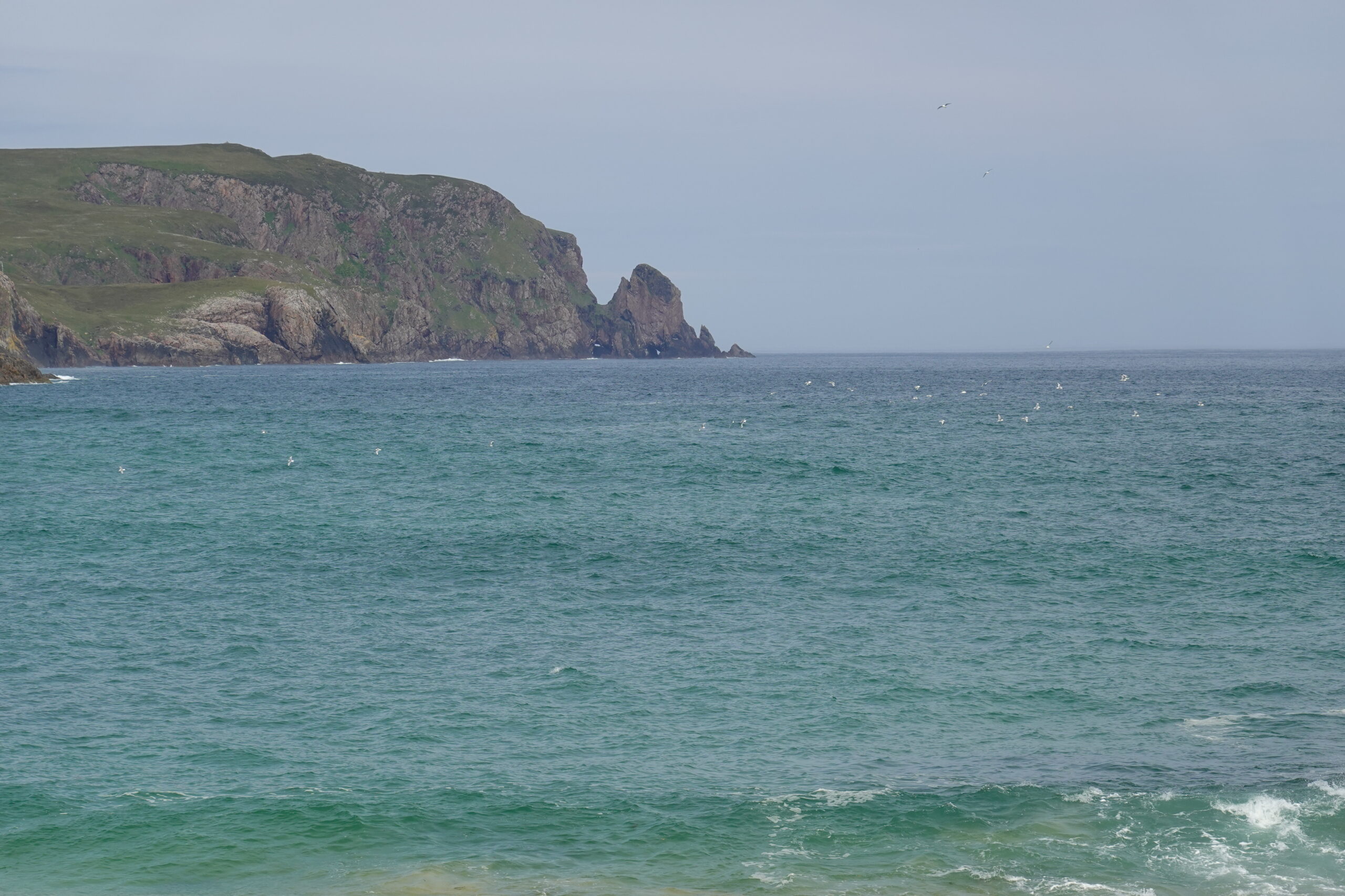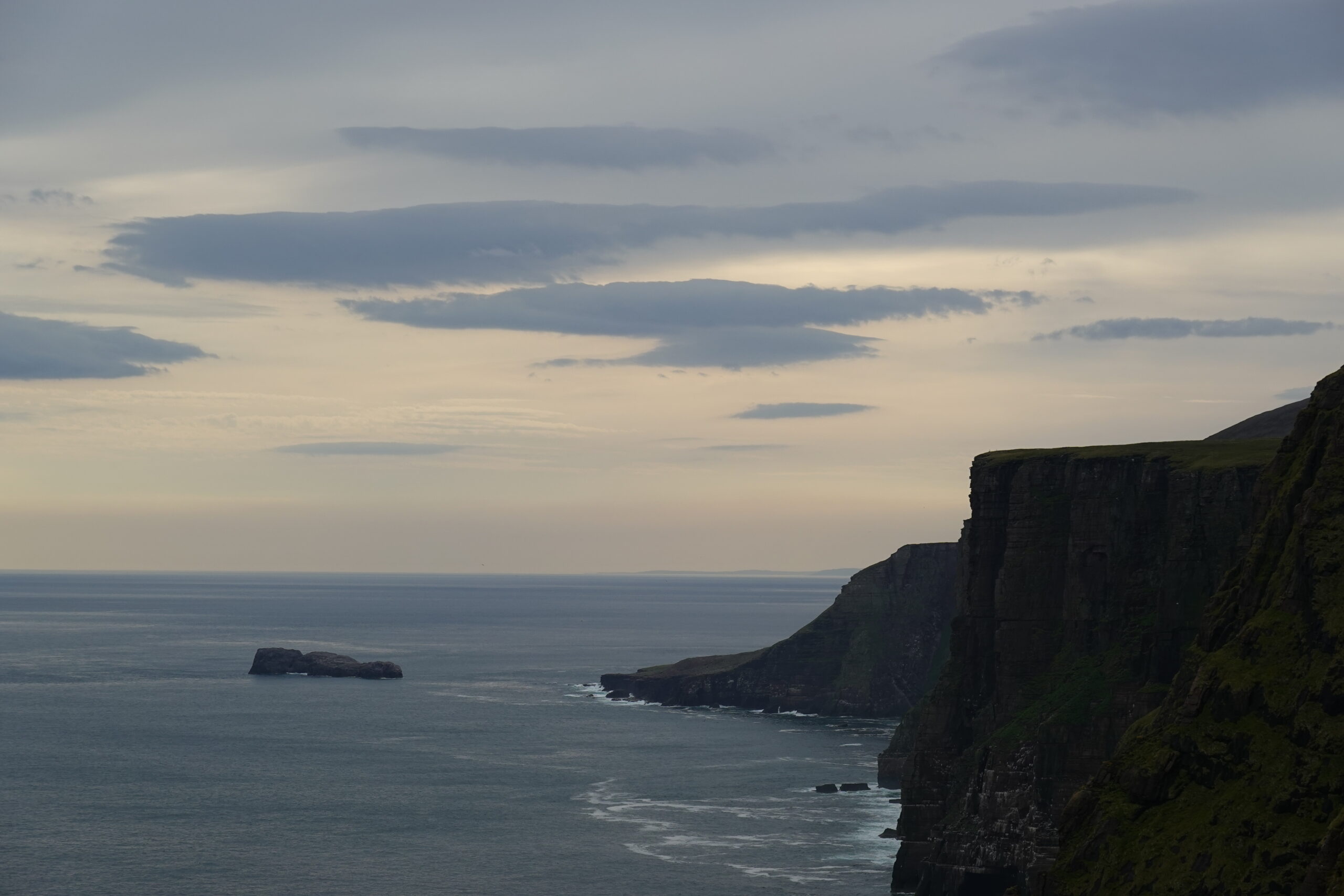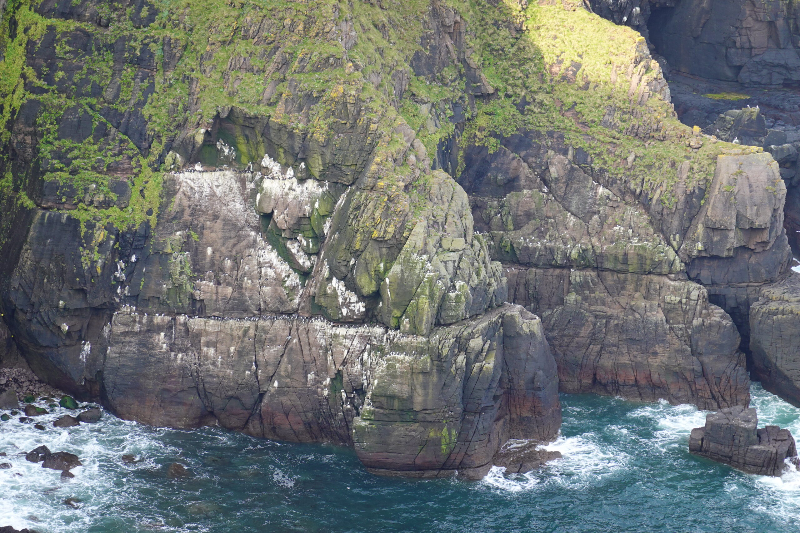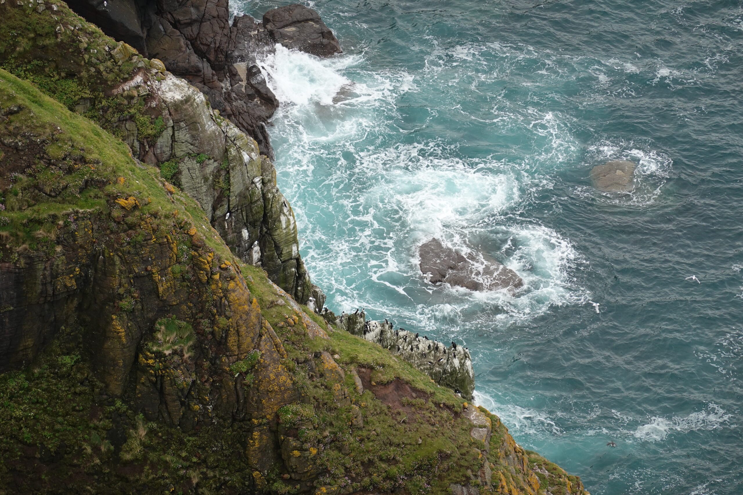 On voyait plein d’oiseaux en vol, surtout des fulmars et des kittiwakes. On a aussi observé un razorbill sur un rocher ainsi que des puffins et guillemots sur des stacks et dans l’eau, mais pas de très près (de carrément loin, même ^^).