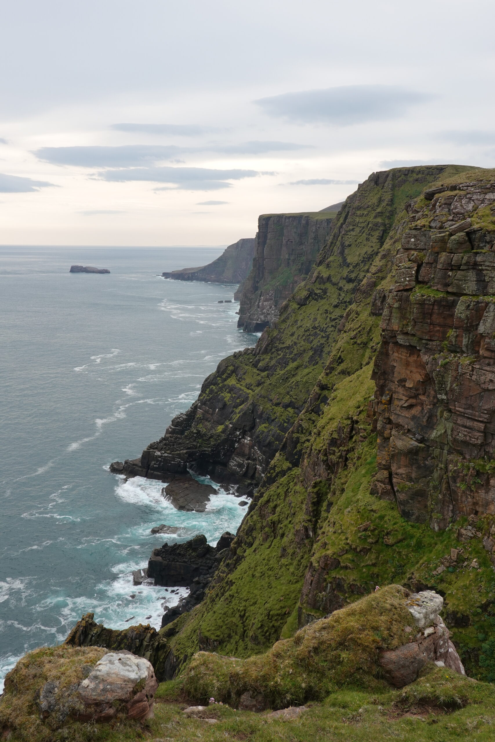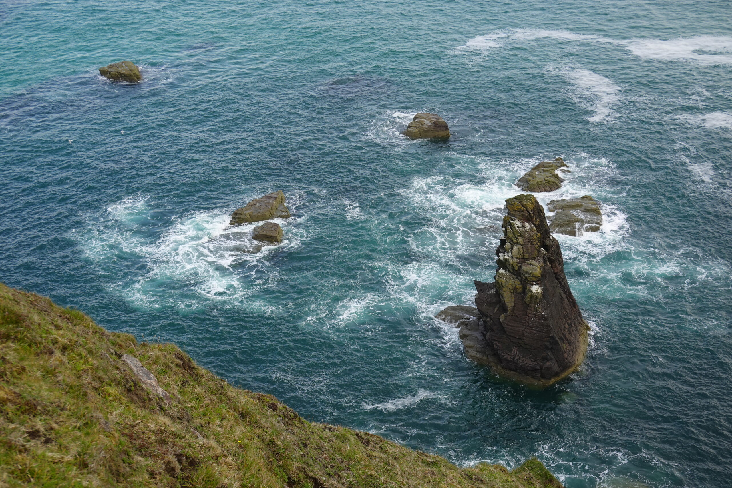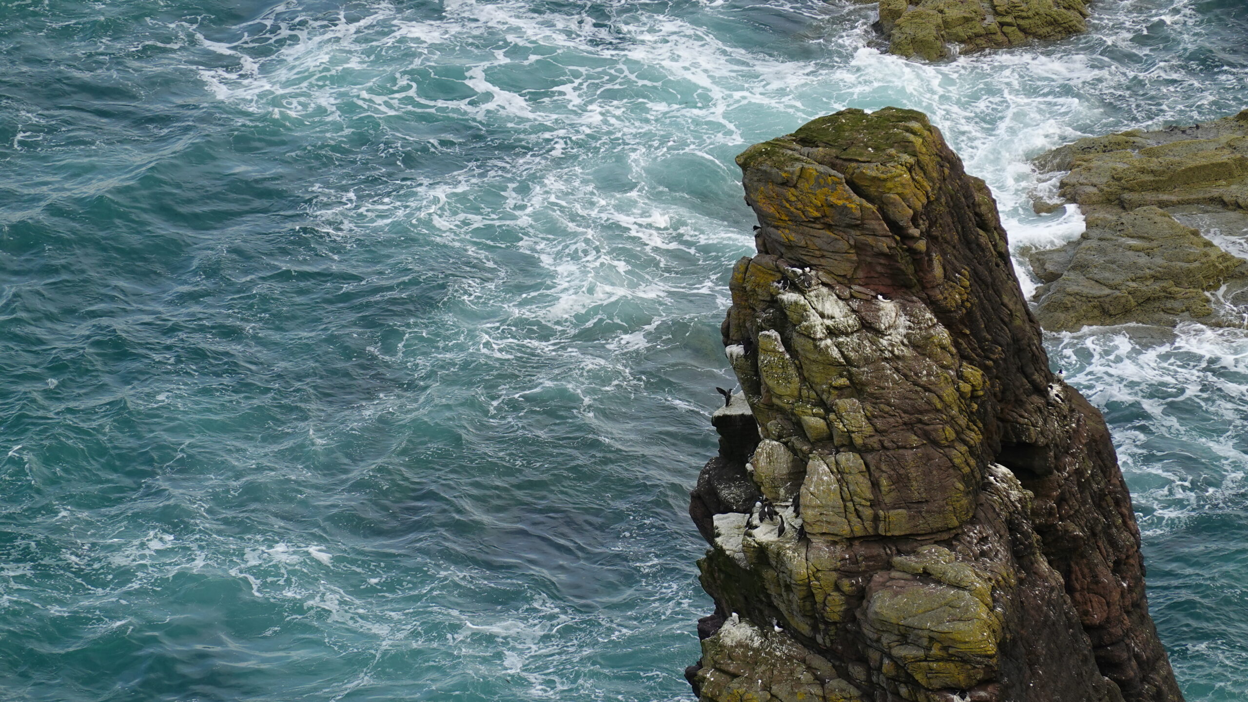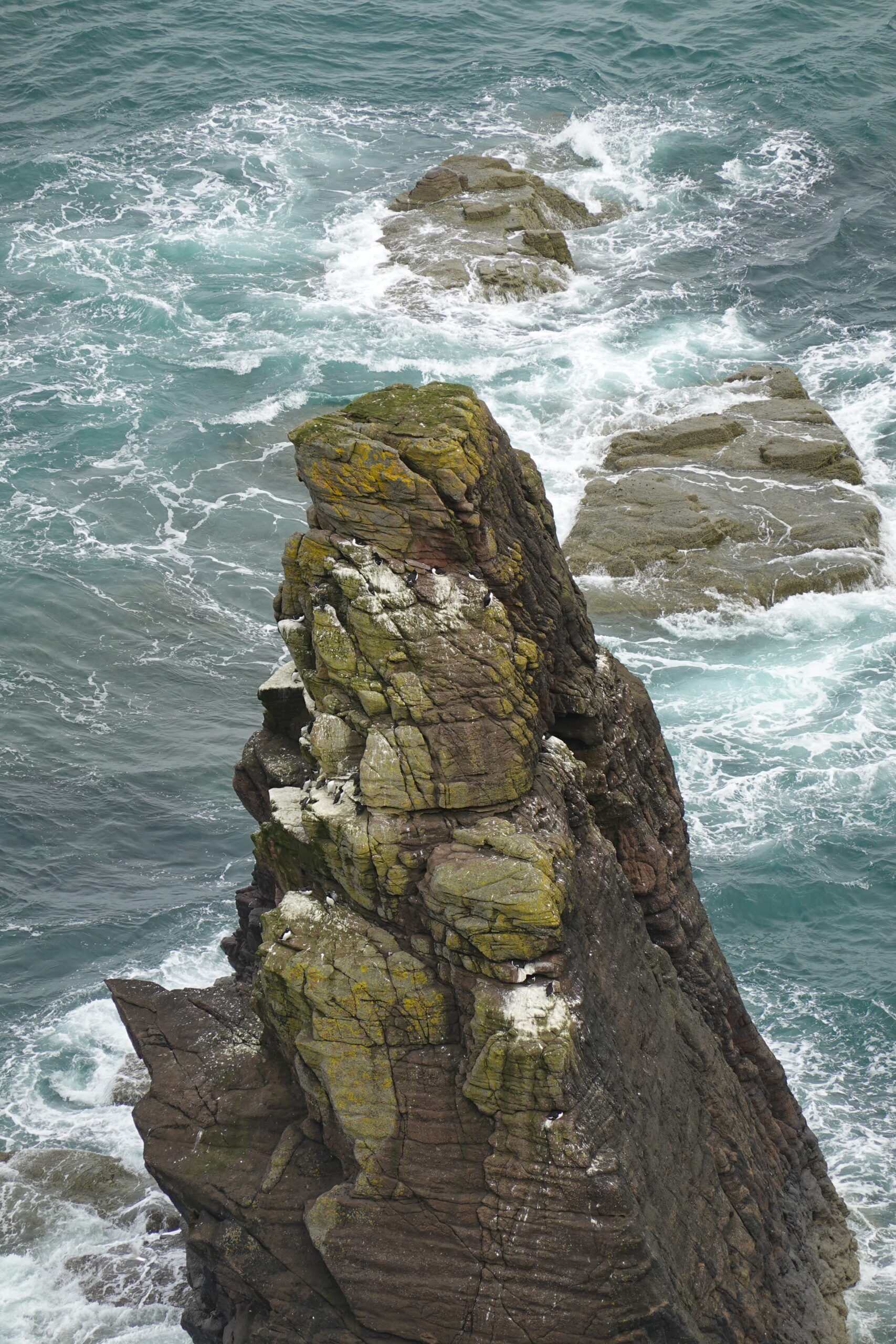 On voyait plein d’oiseaux en vol, surtout des fulmars et des kittiwakes. On a aussi observé un razorbill sur un rocher ainsi que des puffins et guillemots sur des stacks et dans l’eau, mais pas de très près (de carrément loin, même ^^).