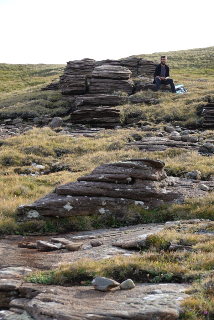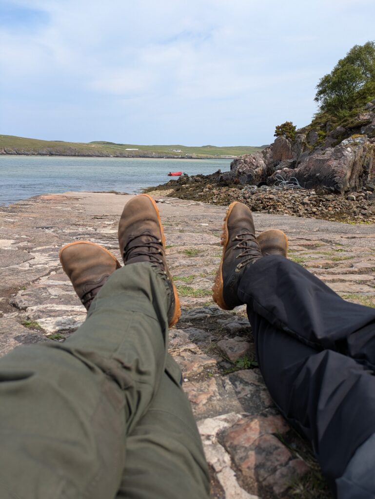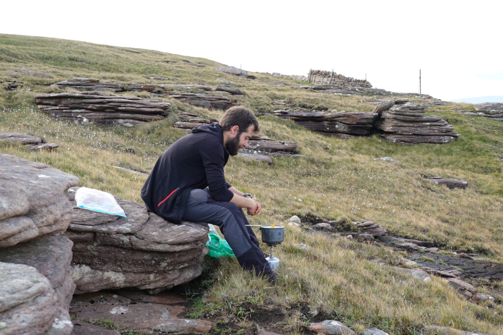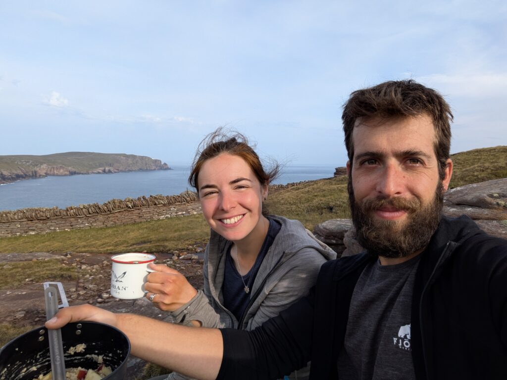 On a mangé sur des rochers (des sortes de rochers “pancakes”, comme empilés et bien plats, très pratiques pour s’asseoir ^^) avec vue sur Cape Wrath et le phare, c’était super. Comme d’habitude, notre menu était composé de porridge avec des pommes, et un chocolat chaud.